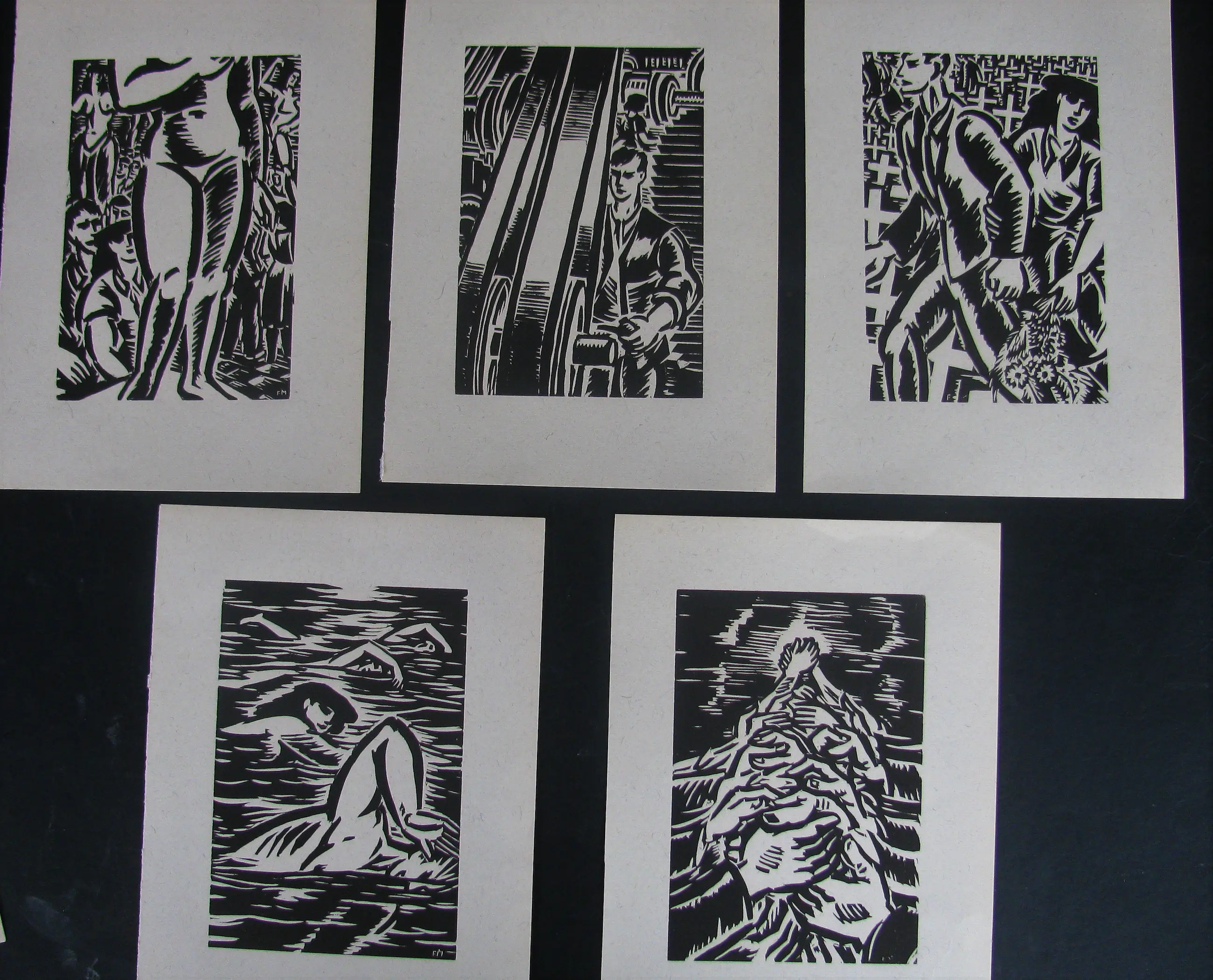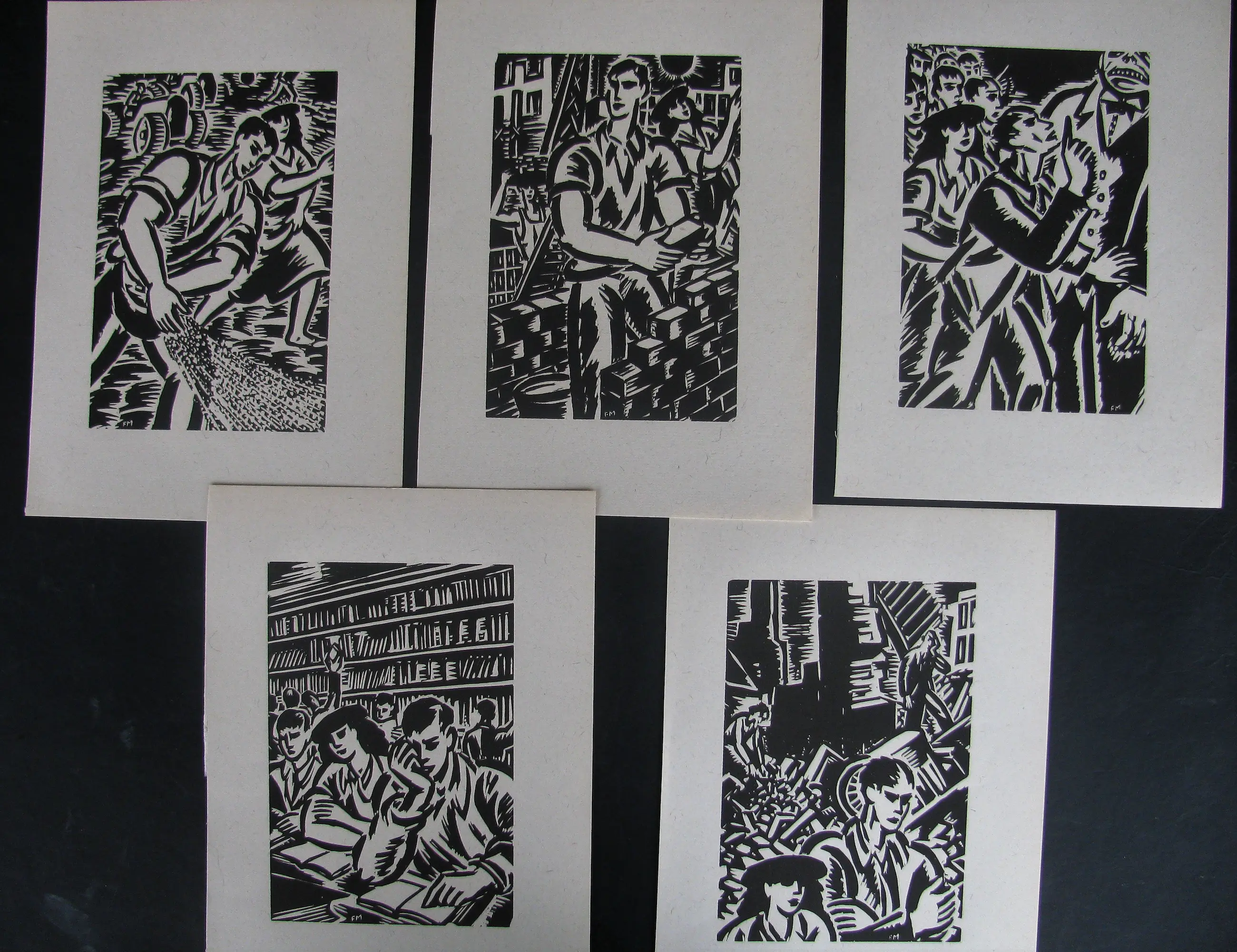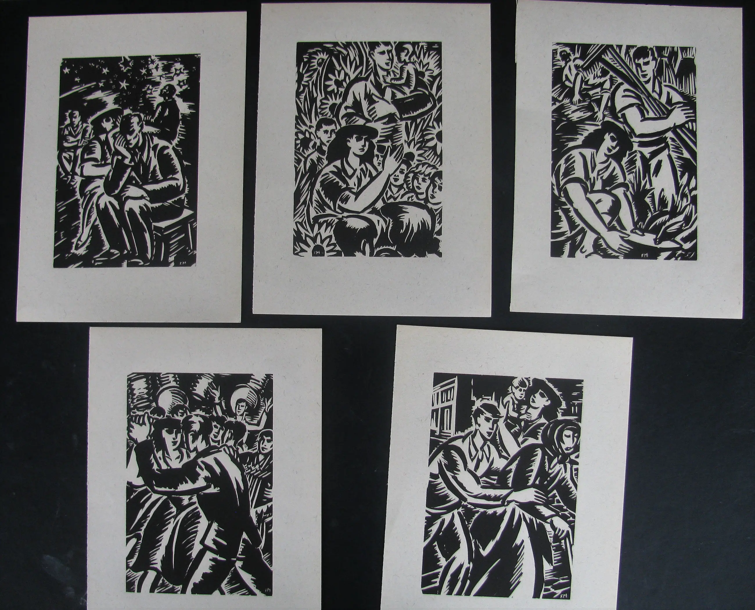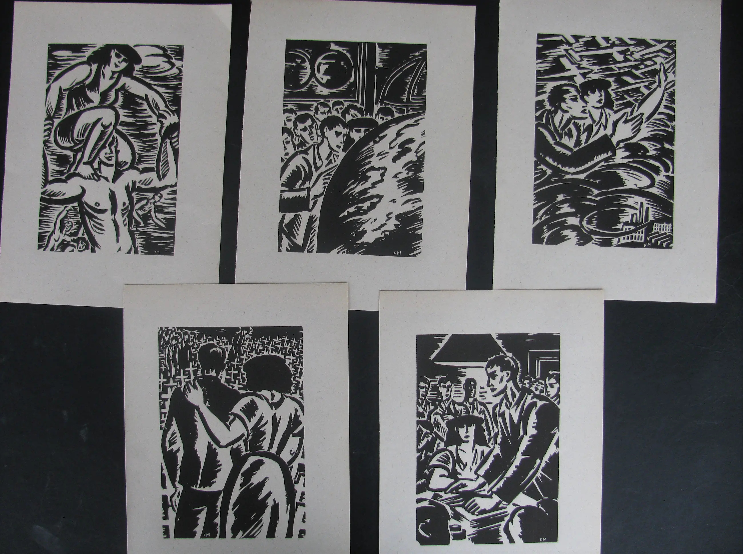 20 houtsneden, op vezelvergiet papier. 19 x 13 cm, 28 x 20 cm de bladeren. Gemonogrammeerd FM in druk. Zeer goede, nette staat.