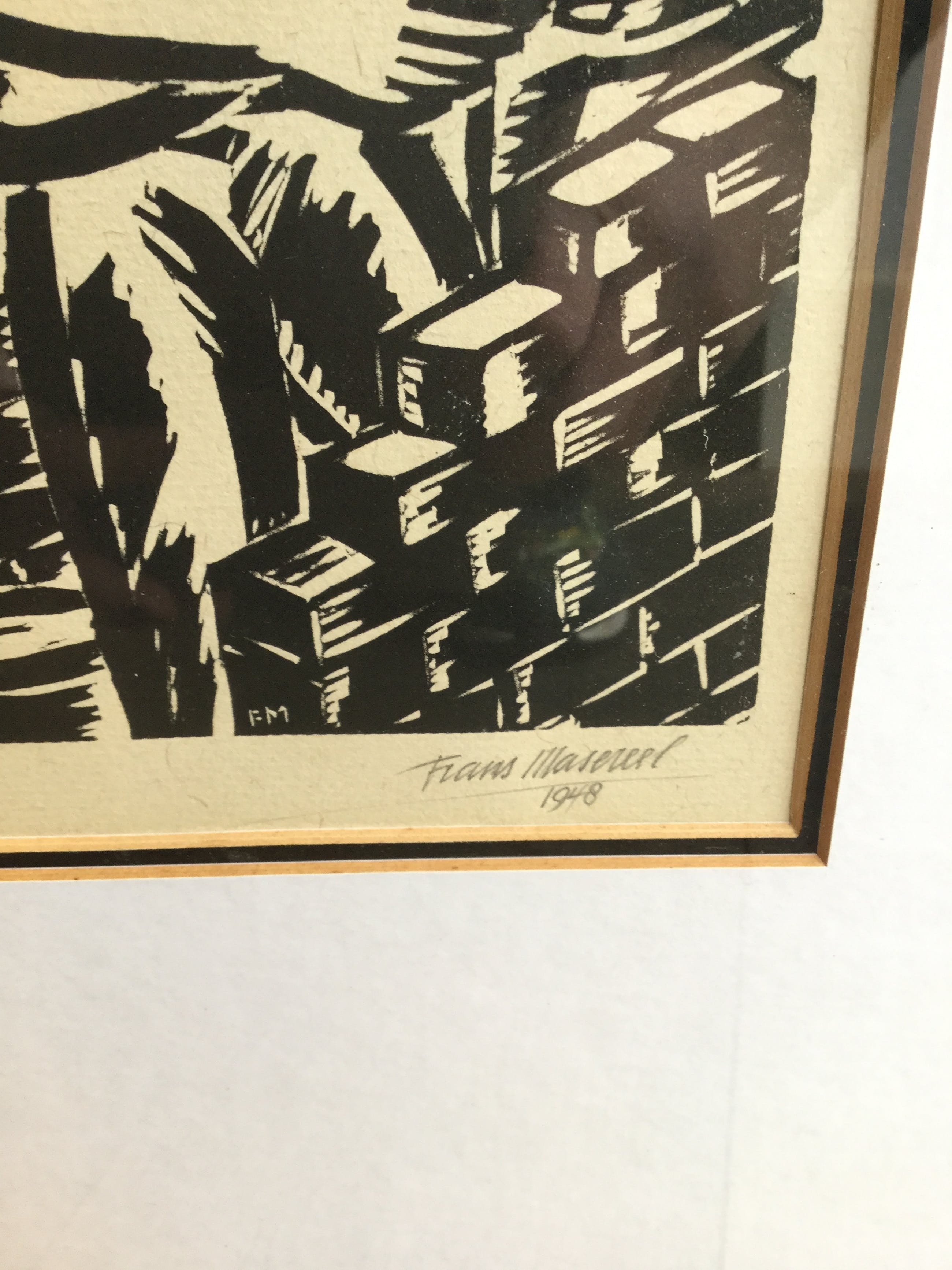 Papier en passepartout verkleurd door de tijd, wat lichte vervuiling tussen glas en werk, lijst bevat oppervlaktevuil en slijtschade door de tijd. | |