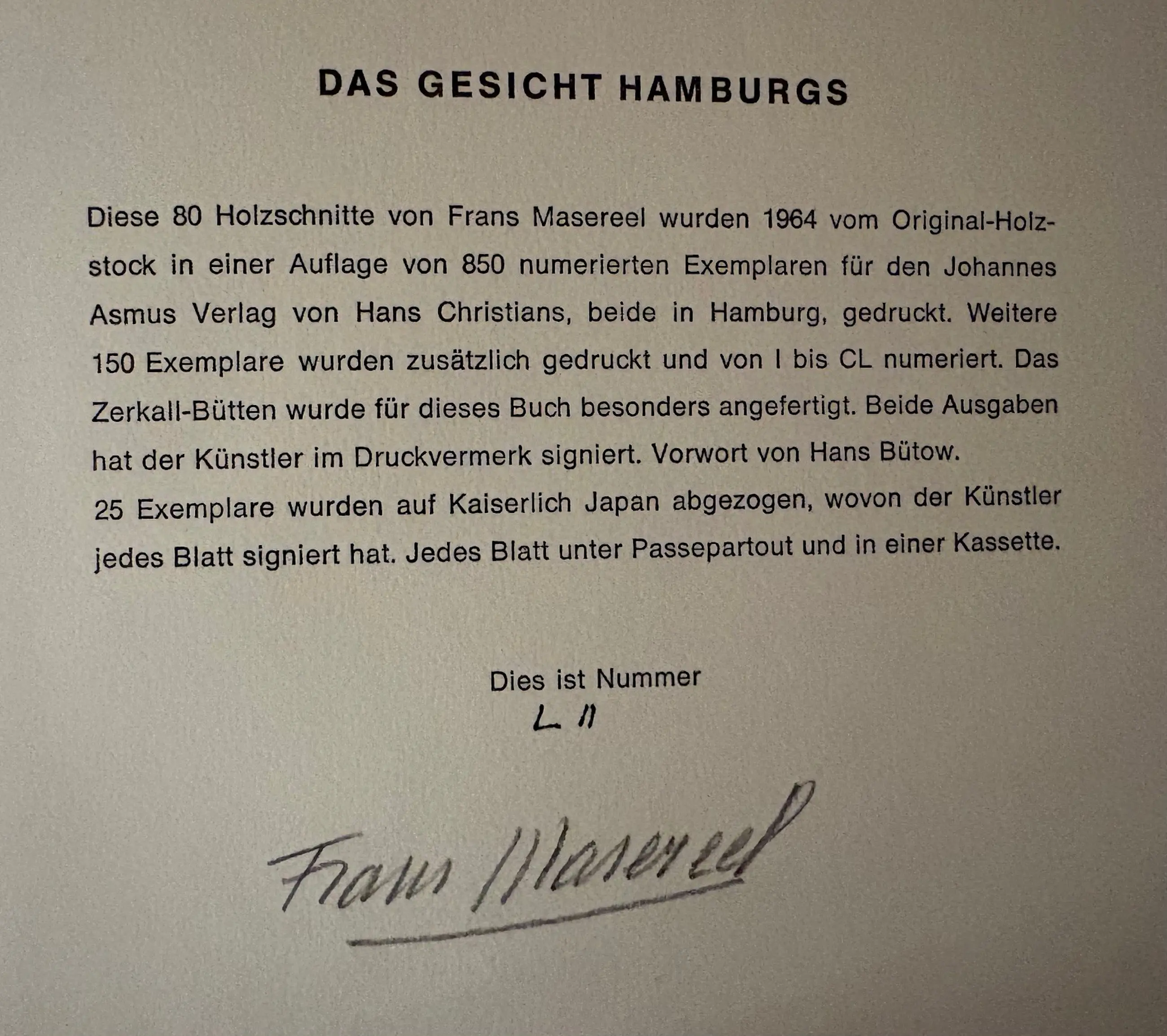 Uitgegeven door Johannes Asmus Verlag. Initiële oplage van 850 exemplaren, gevolgd door 150 aanvullende exemplaren. Exemplaar genummerd "LII" van de aanvullende 150. Gehandtekend (in potlood). In zeer goede staat.