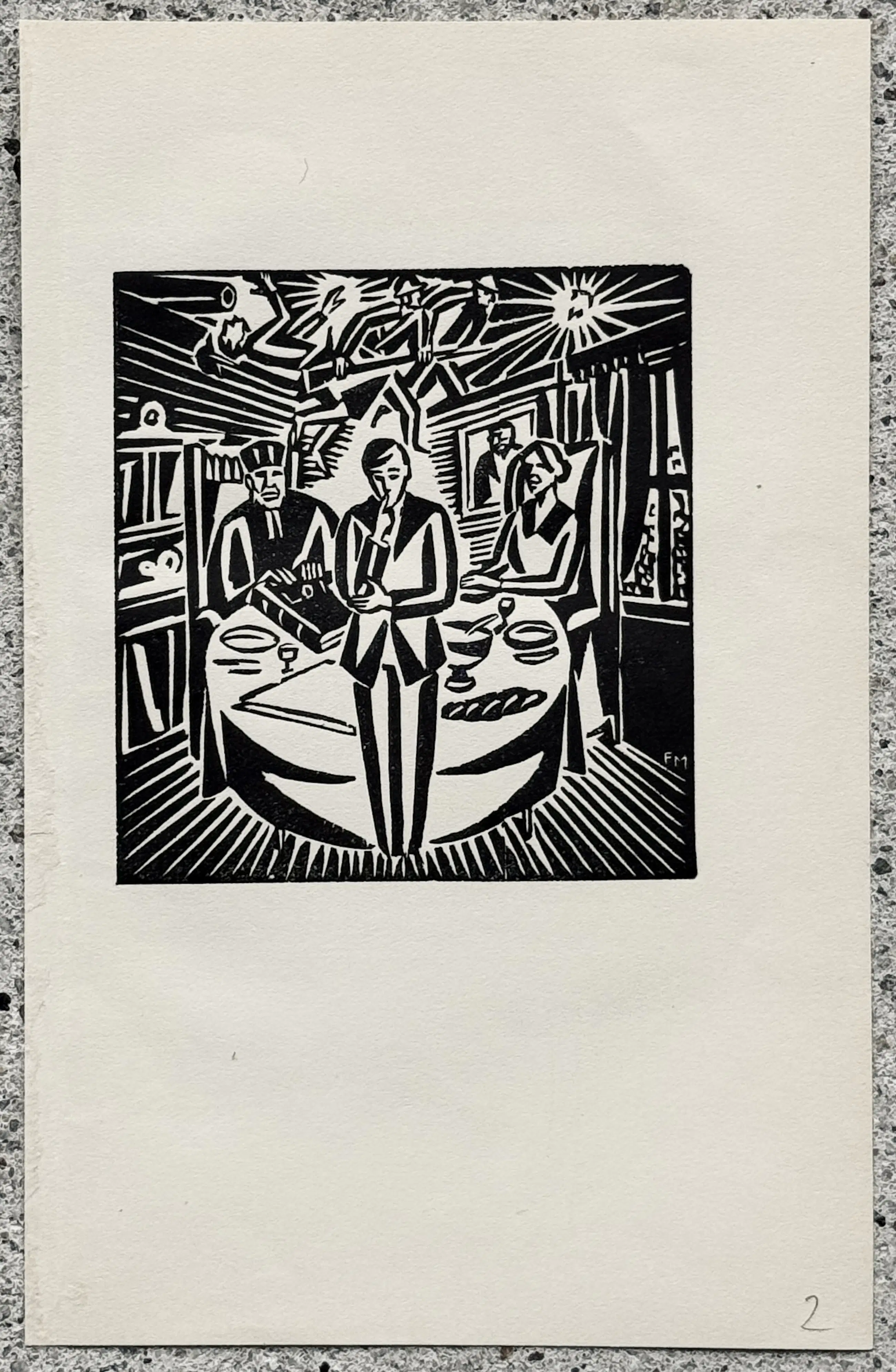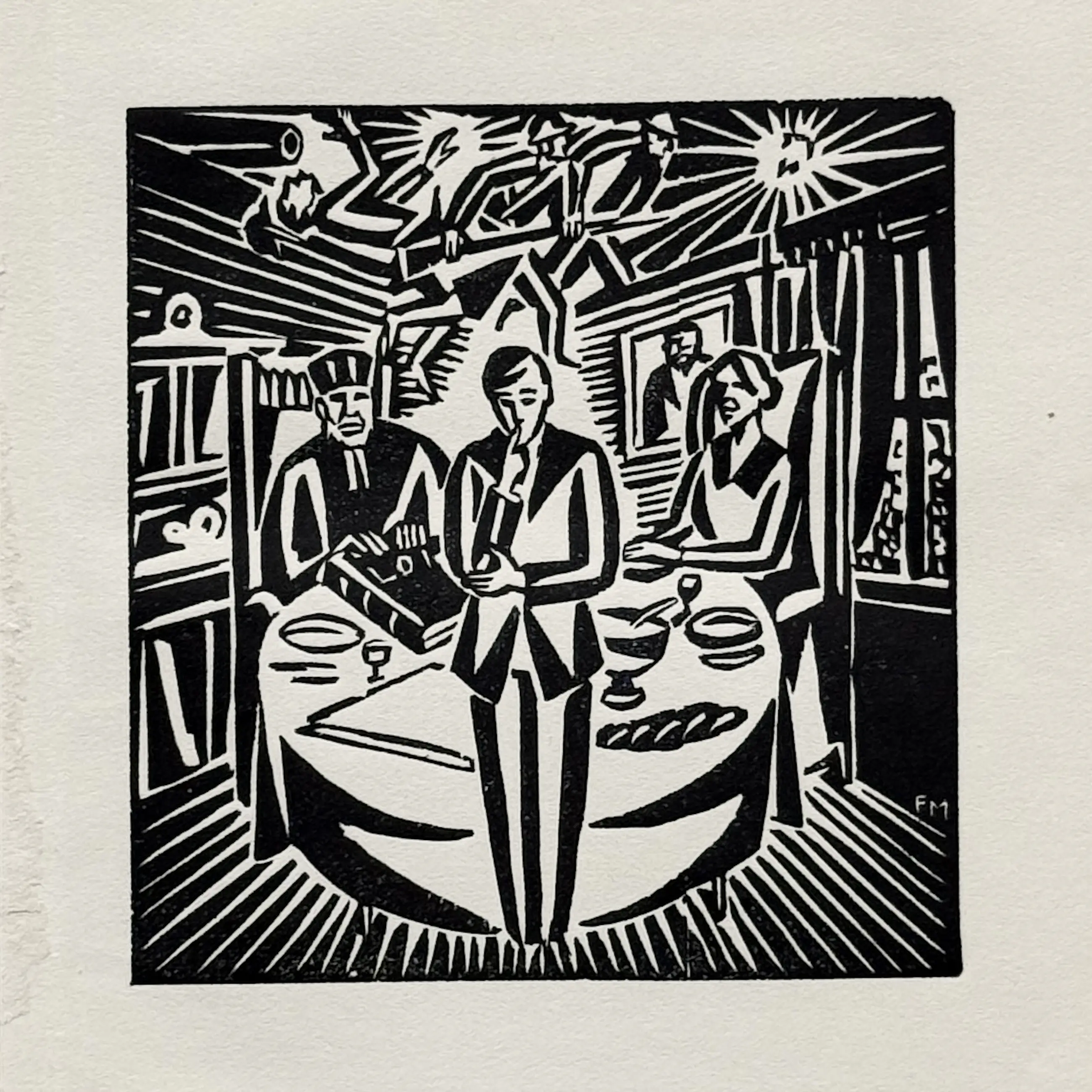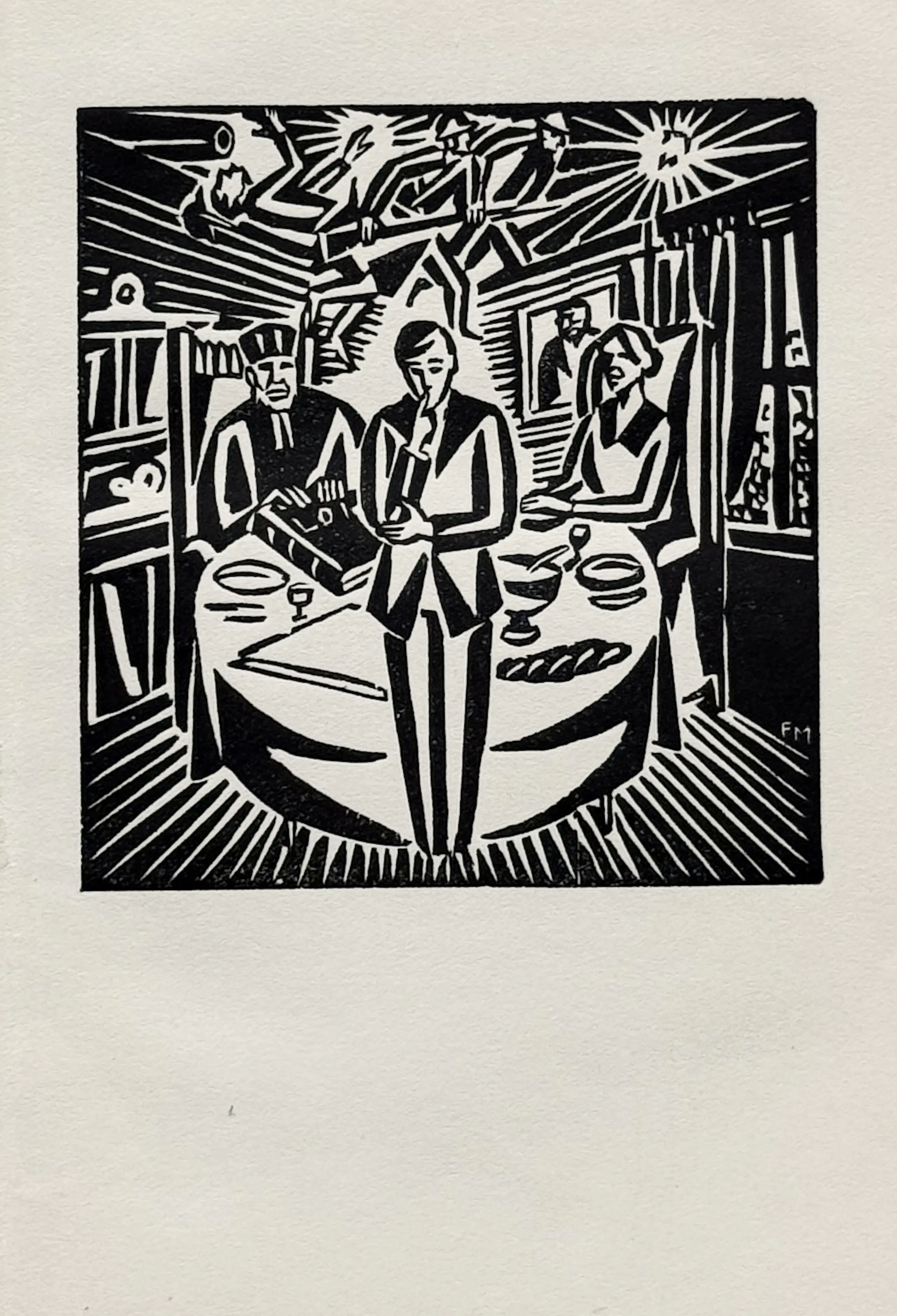 Het schilderij toont drie personen rond een ronde tafel in een interieur. Het is uitgevoerd in zwart-wit, typerend voor Masereels expressionistische stijl met zijn sterke contrasten en uitgesproken hoekigheid.