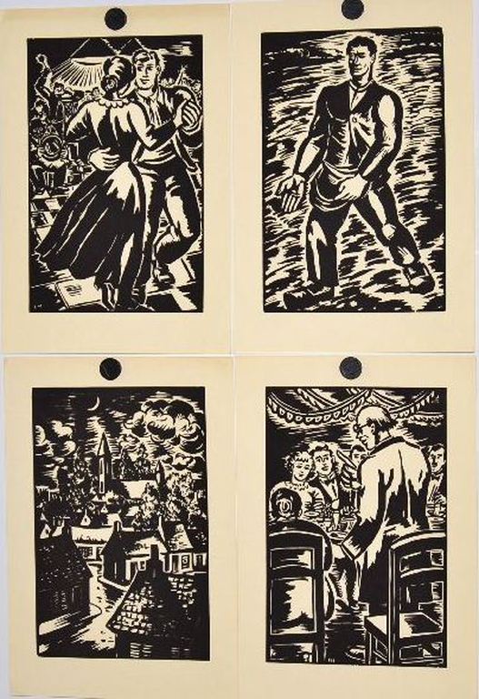 Frans Masereel, 4 houtsnedes figuren en dorpsgezicht