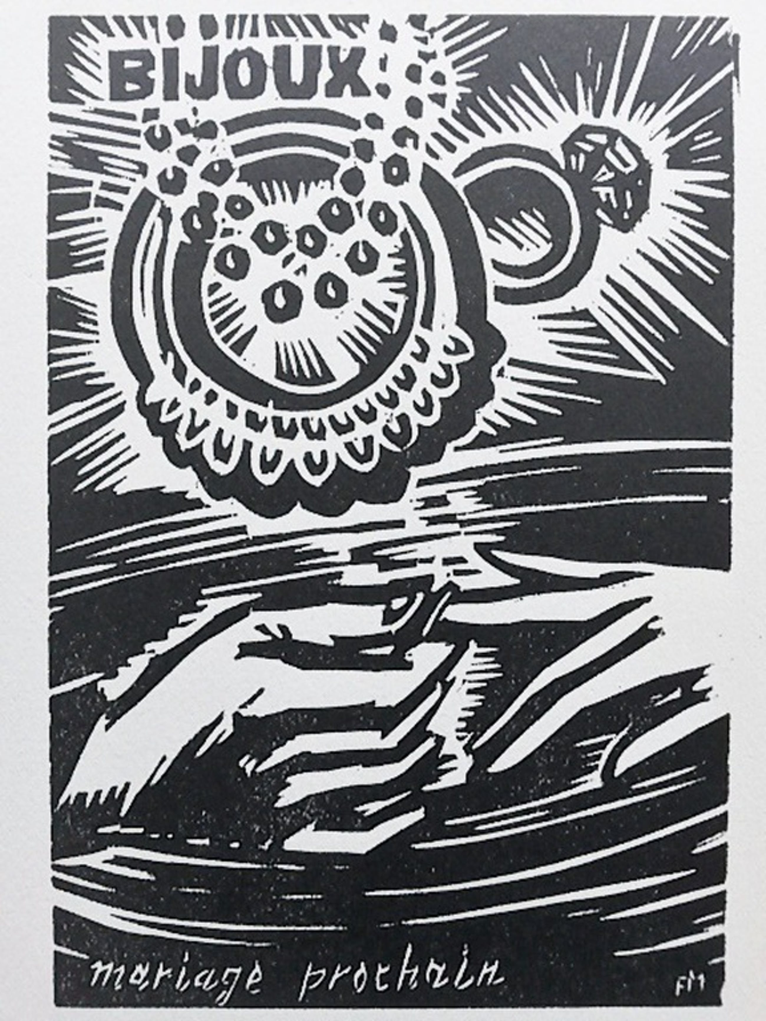 Frans Masereel, Bijouterie, Mariage Prochaine (Huwelijk is aanstaande). Originele houtsnede. De prent is gedrukt op geschept papier en dateert uit 1950. Maat afdruk:13 x 9 cm. Blad 19 x 13,7 cm. De prent is rechtsstreeks van het originele blok gedrukt. In topconditie. Authenticiteit is gegarandeerd.