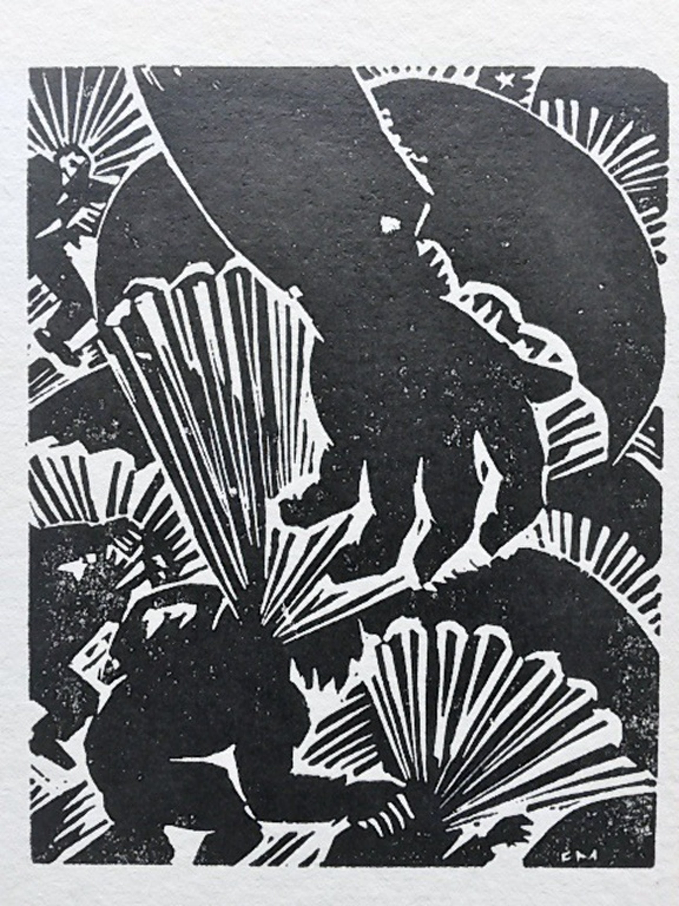 Frans Masereel, Fallschirme (parachutes) 9,5 x 7,5 cm, afkomstig uit een serie van 12 houtsnedes op losse bladen gedrukt. De prent is ingelijst met passend passe-partout. Ecce Homo/Chez les Hommes/Unter den Menschen uit 1949. In perfecte staat.Gedrukt op geschept papier. Originele druk van het blok! Authenticiteit is gegarandeerd. De lijst is 20 x 25 cm.