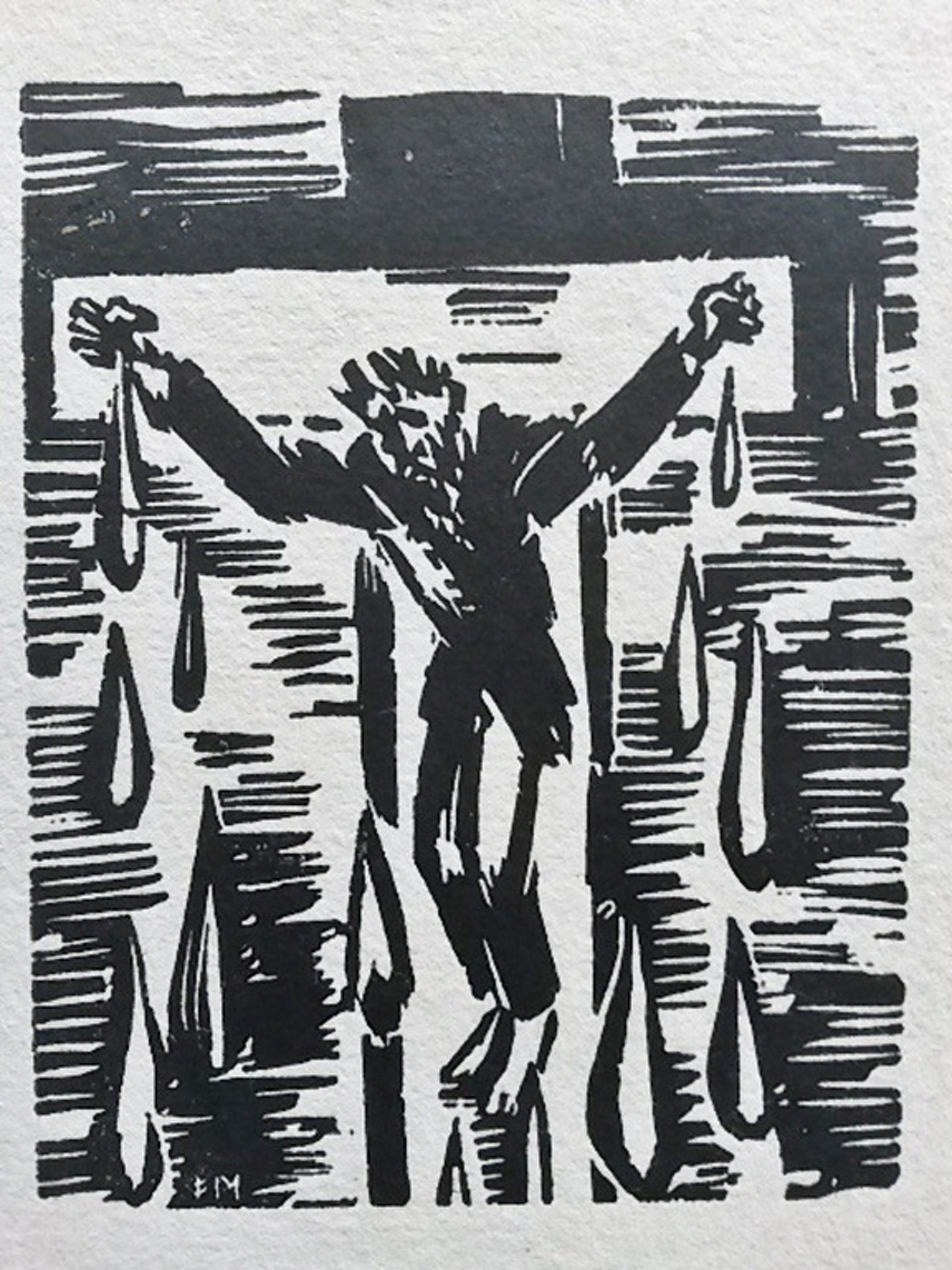 Kruisiging, afkomstig uit een serie van 12 houtsnedes op losse bladen gedrukt Ecce Homo/Chez les Hommes/Unter den Menschen 1949. In perfecte staat. Gedrukt op geschept papier. Originele druk van het blok! Zeldzaam!