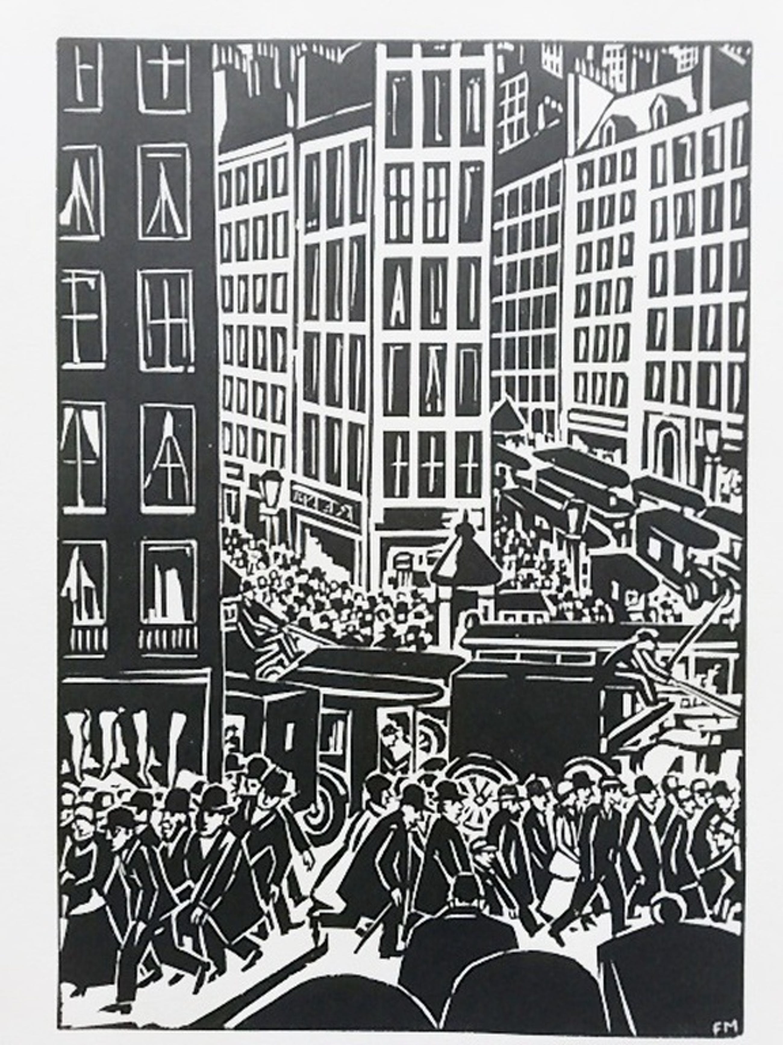Originele houtsnede in uitstekende conditie. Uit La Ville (Die Stadt) 1928. Het blad is iets vergeeld van ouderdom. Verder in zeer goede staat. Maat prent: 16,2 x 11,4 cm. Papierformaat: 23,5 x 18,4 cm.