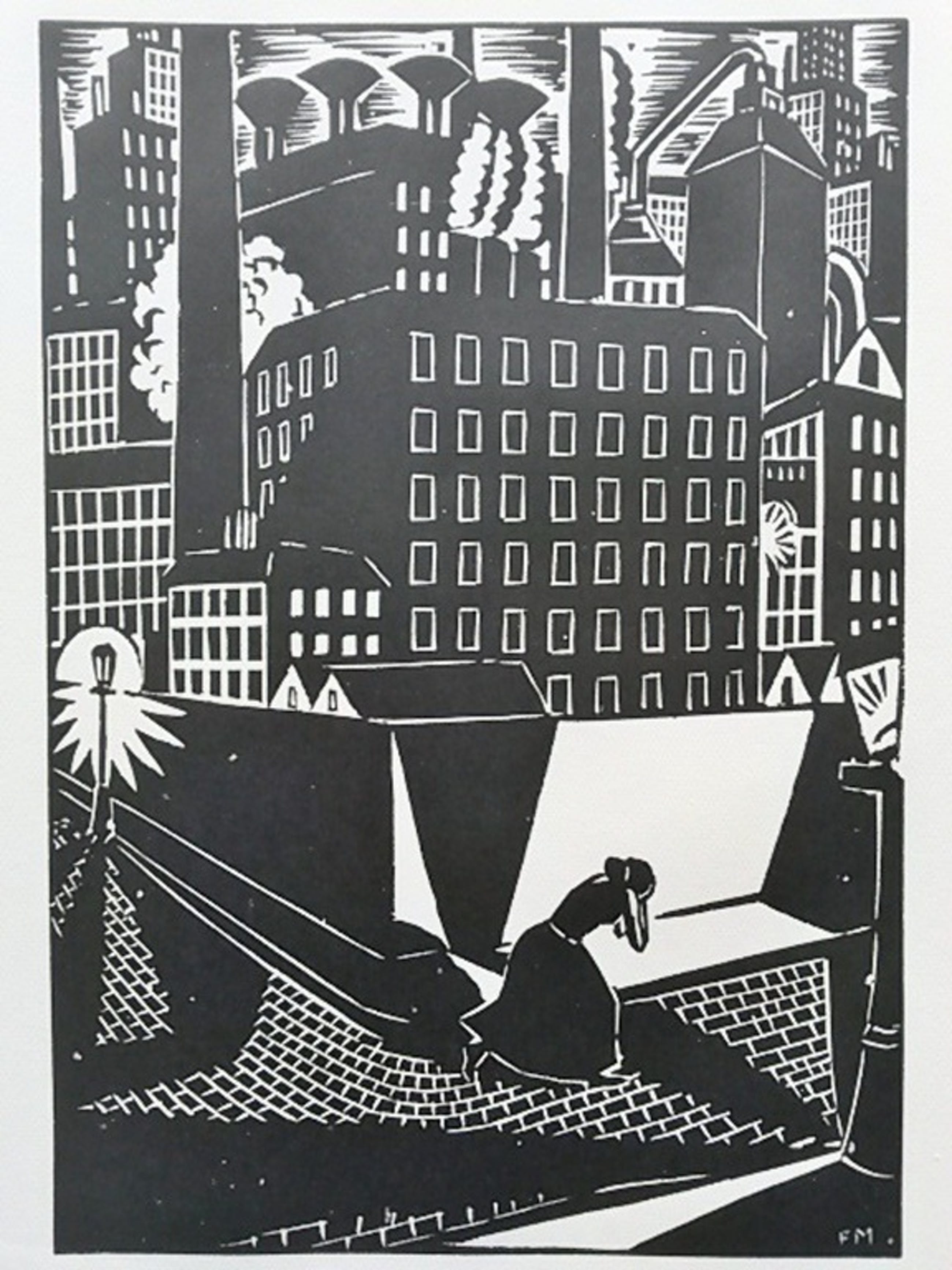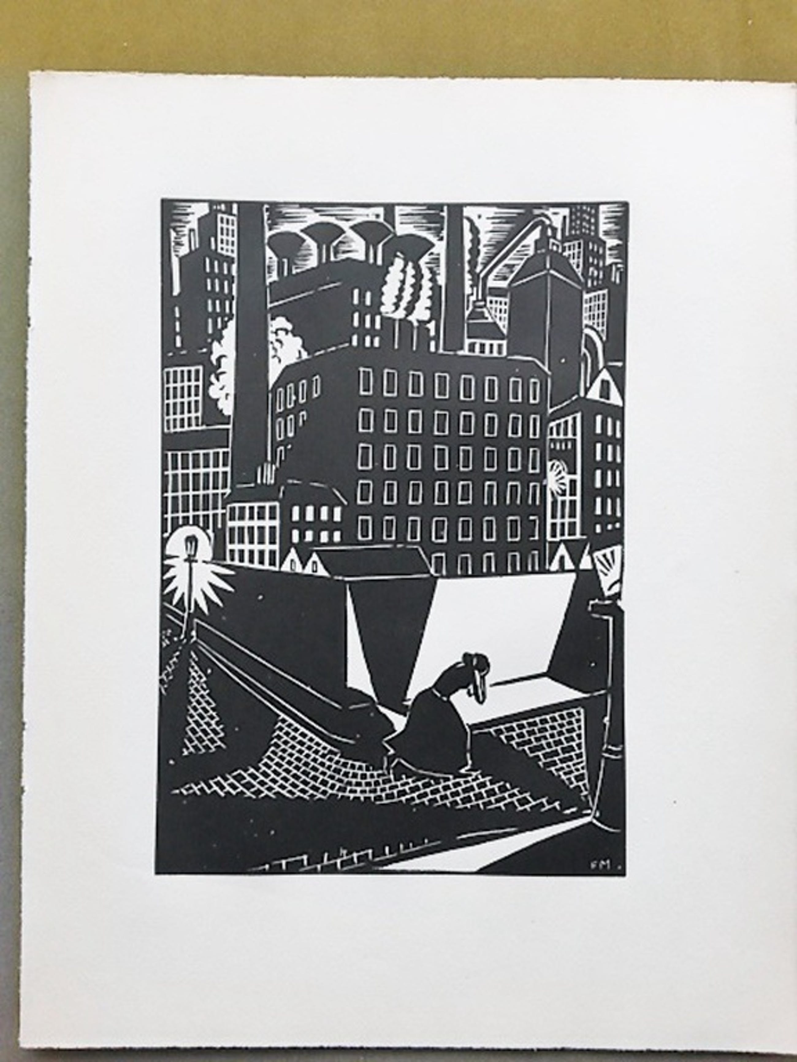 Frans Masereel, originele houtsnede in uitstekende conditie uit La Ville (Die Stadt) 1928. Het blad is iets vergeeld van ouderdom. Verder in zeer goede staat. Direct van het originele blok gedrukt! Maat prent: 16,2 x 11,4 cm. Papierformaat: 23,5 x 18,4 cm