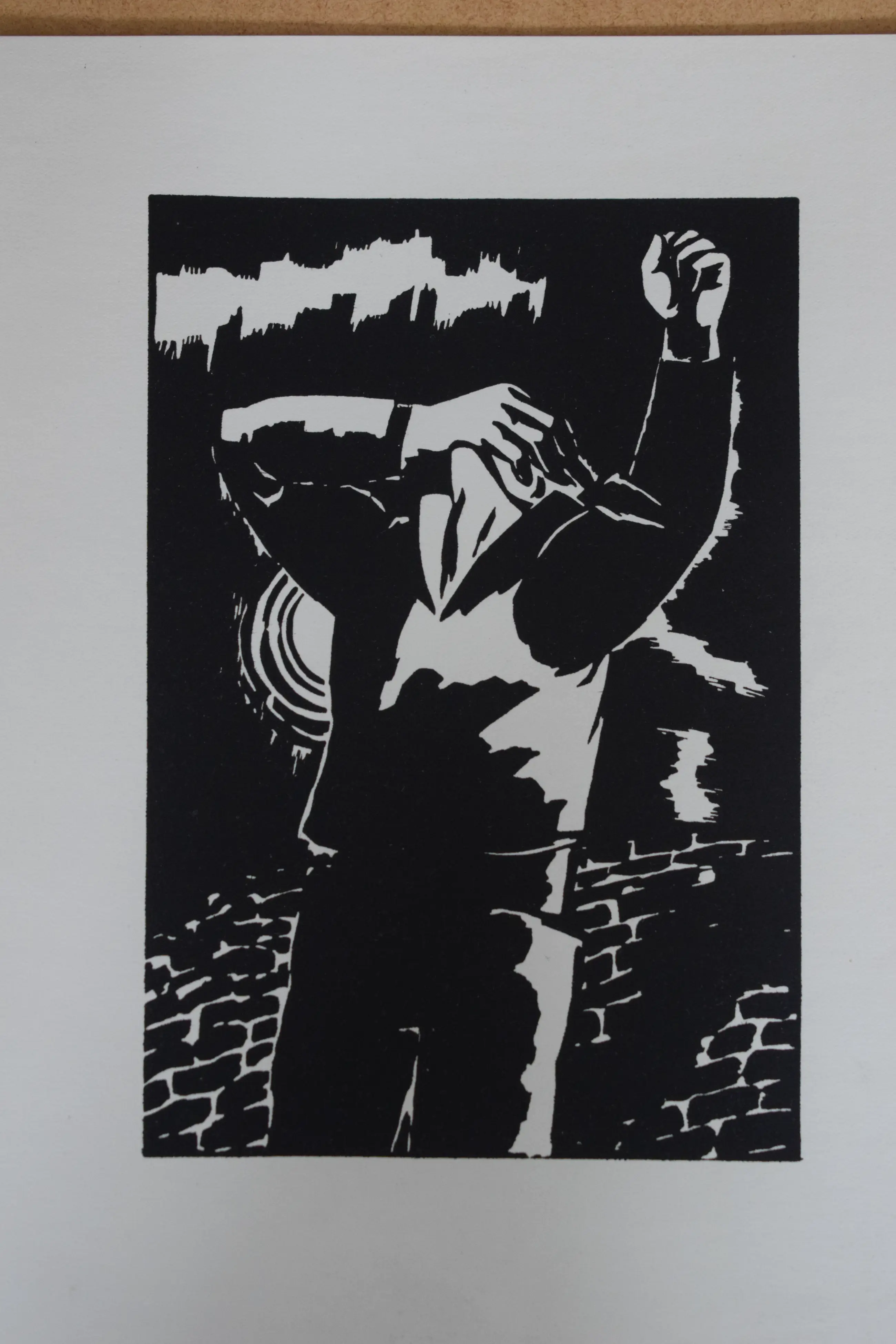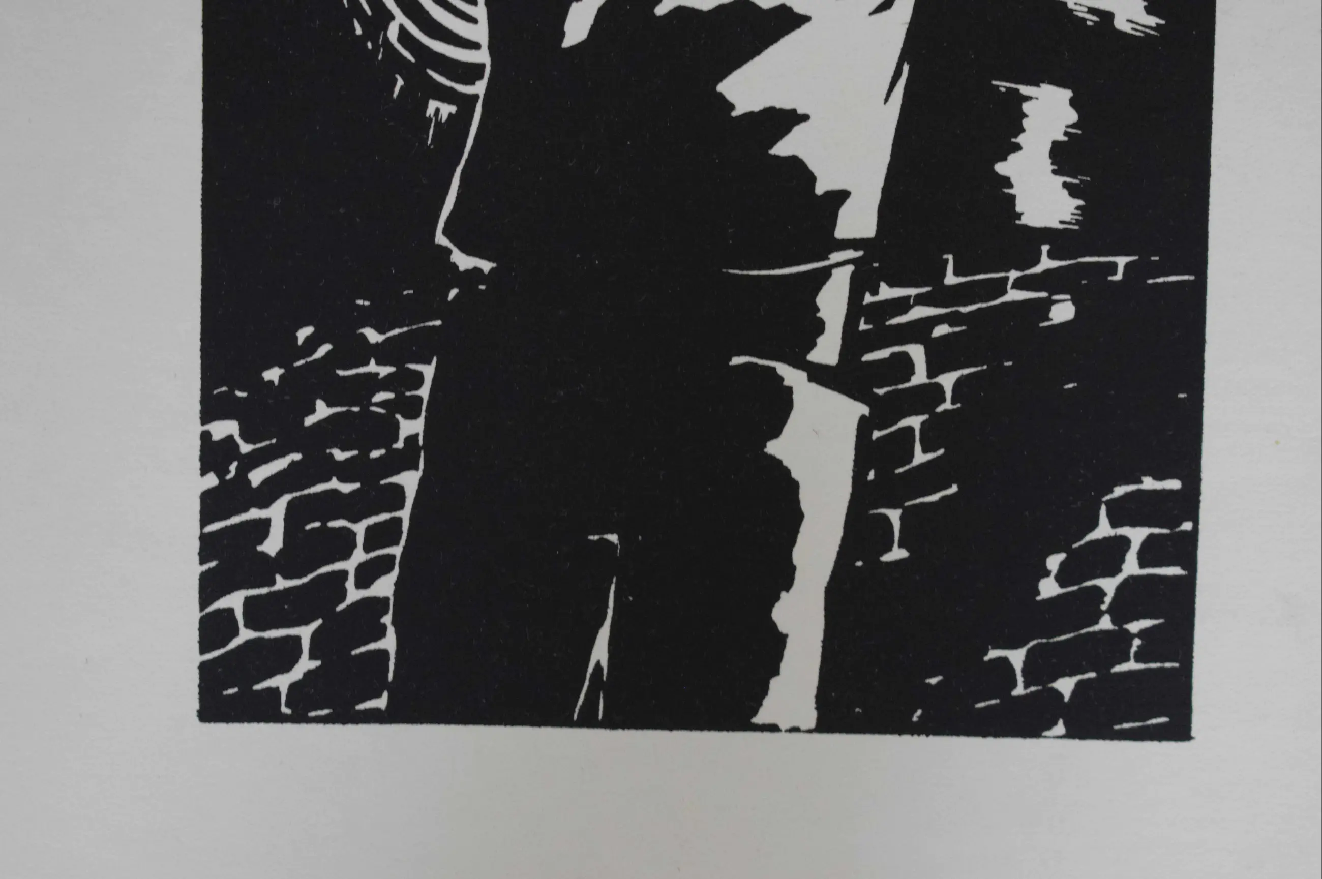 Originele houtsnede. Deze houtsnede werd voor het eerst opgenomen in de monografie van Luc Durtain over de Kunstenaar Frans Masereel. Dit exemplaar is opgenomen in een gespecialiseerde typografische Frans Tijdschrift. De gravure is gedrukt op Fijn Creme geweven papier.