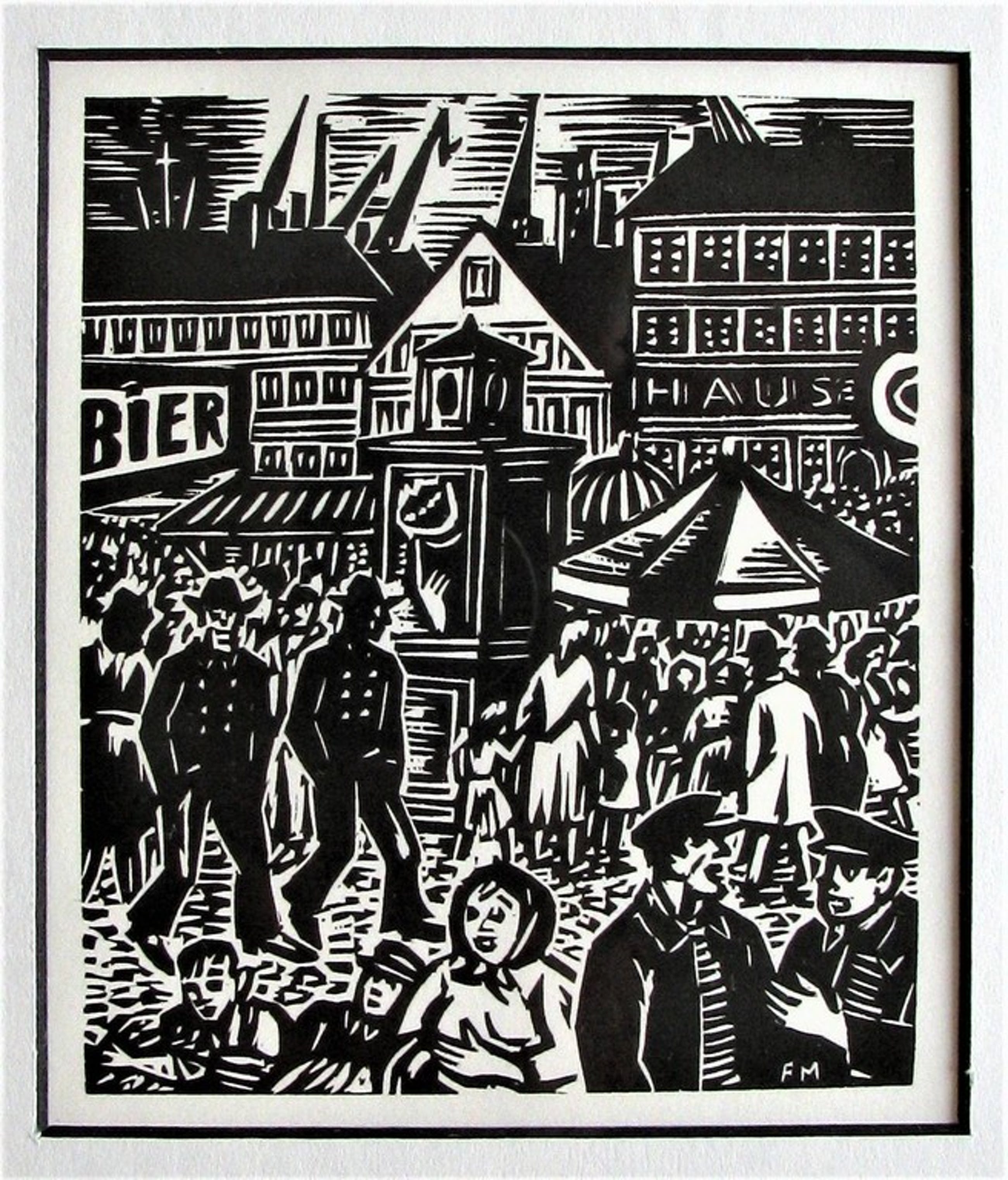 Scène uit de reeks 'Das Gesicht Hamburgs' van 1964. Naast de luxueuze uitgave op 25 exemplaren, werden er van deze editie ook 850 exemplaren gedrukt, waarvan enkel het colofon door de kunstenaar eigenhandig gesigneerd werd, en waaruit het aangeboden stuk stamt. Van deze oplage van 850 werden de individuele houtsneden wel in het blok gemonogrameerd (zie foto).