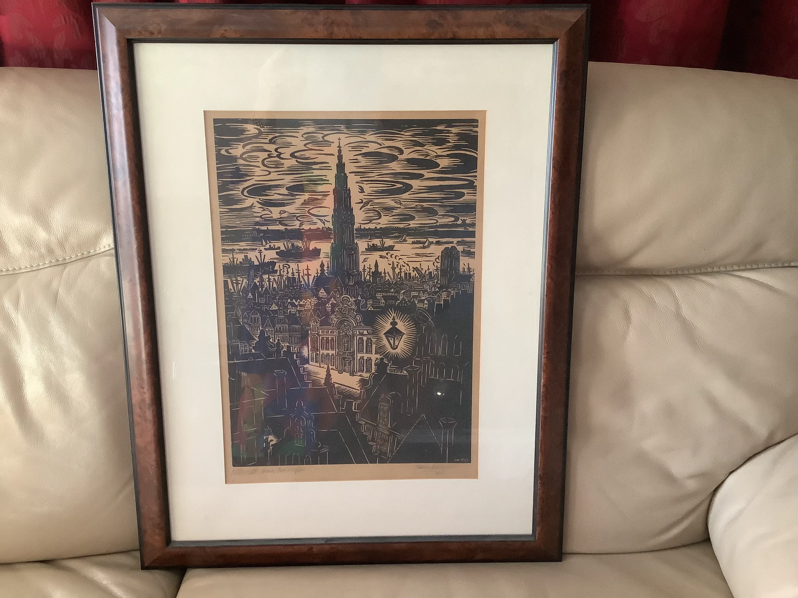 Frans Masereel, gesigneerde houtsnede,1955.Osterrieth huis Antwerpen.Getekend en gedateerd rechtsonder en linksonder door Frans Masereel.Gedateerd in de plaat naast monogram FM 1955Donkerhouten kader met passe-partout.Alles in uitstekende staat.