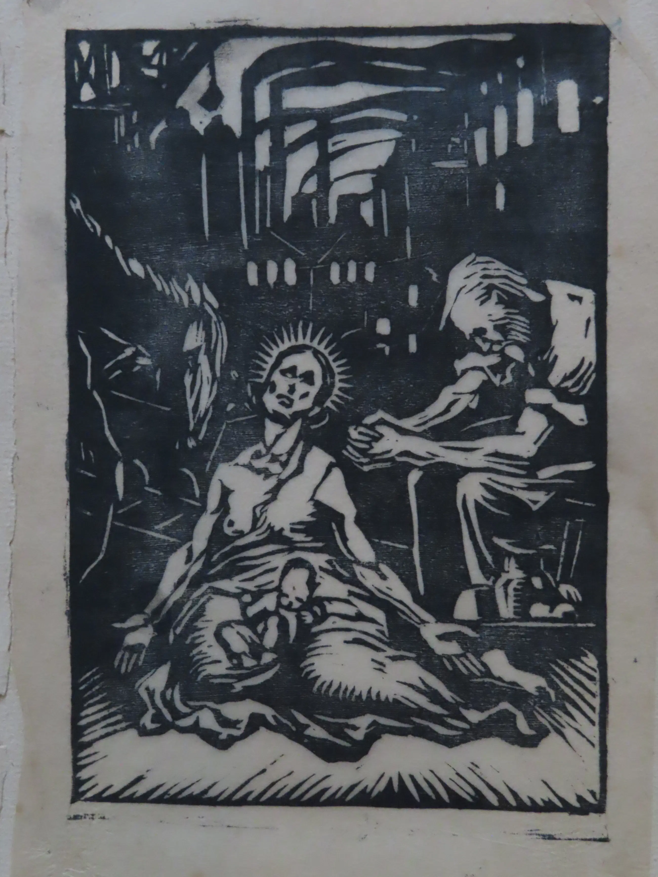 Omslag (=houtsnede) en 5 houtsnedes die oospronkelijk verschenen bij 'De Dag' door Jan W. Jacobs. Zonder de tekst. Ongesigneerd.