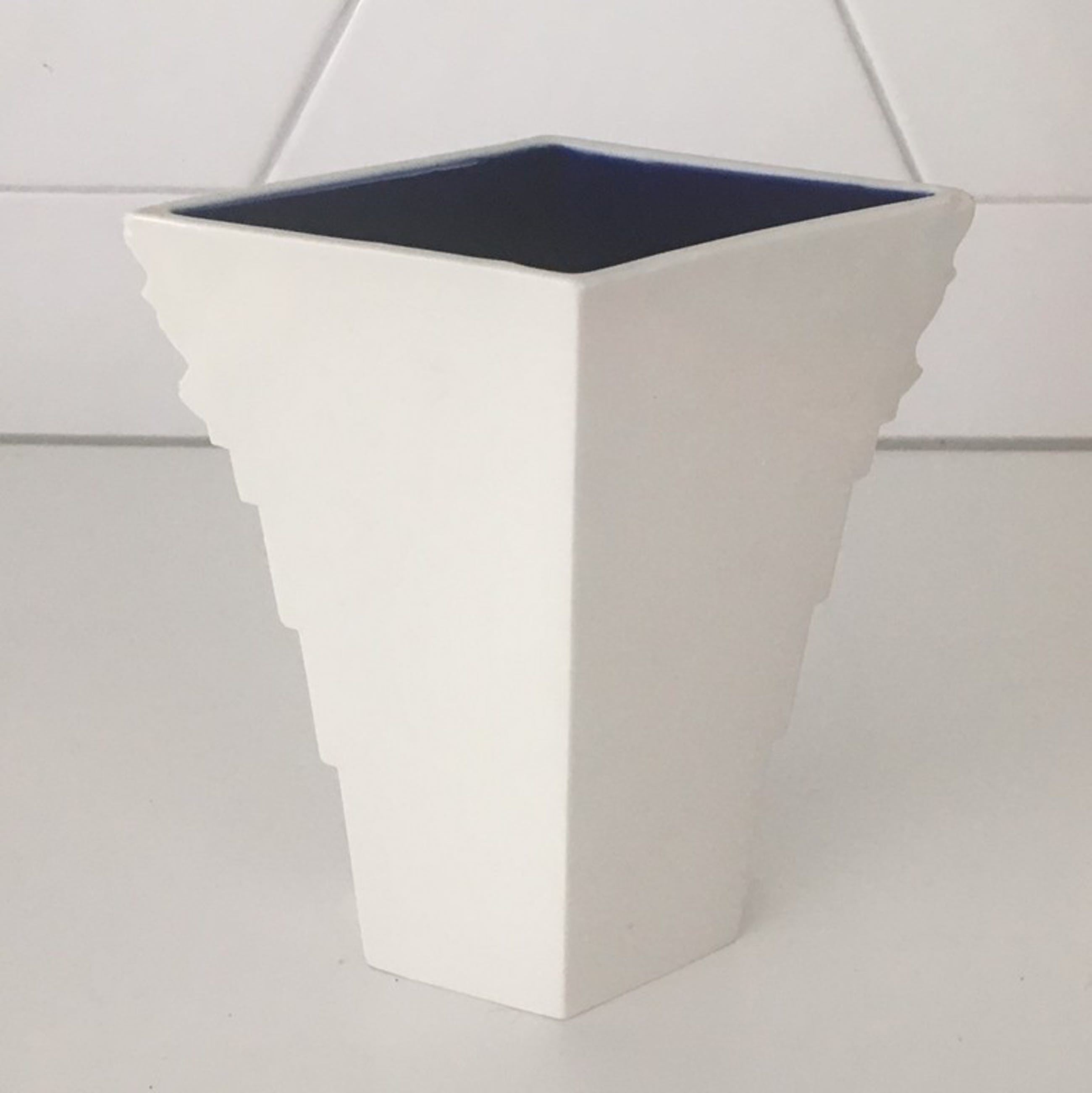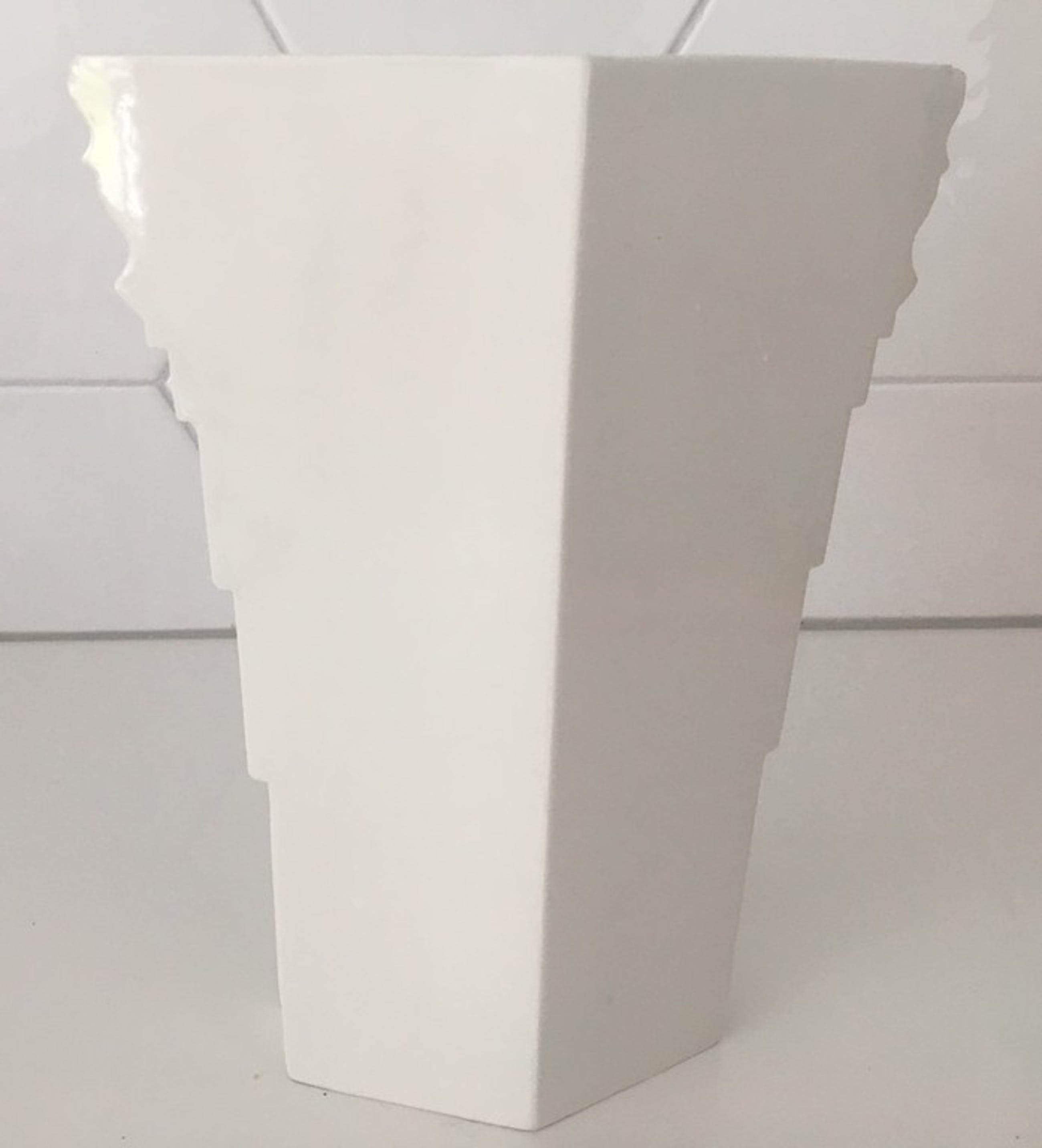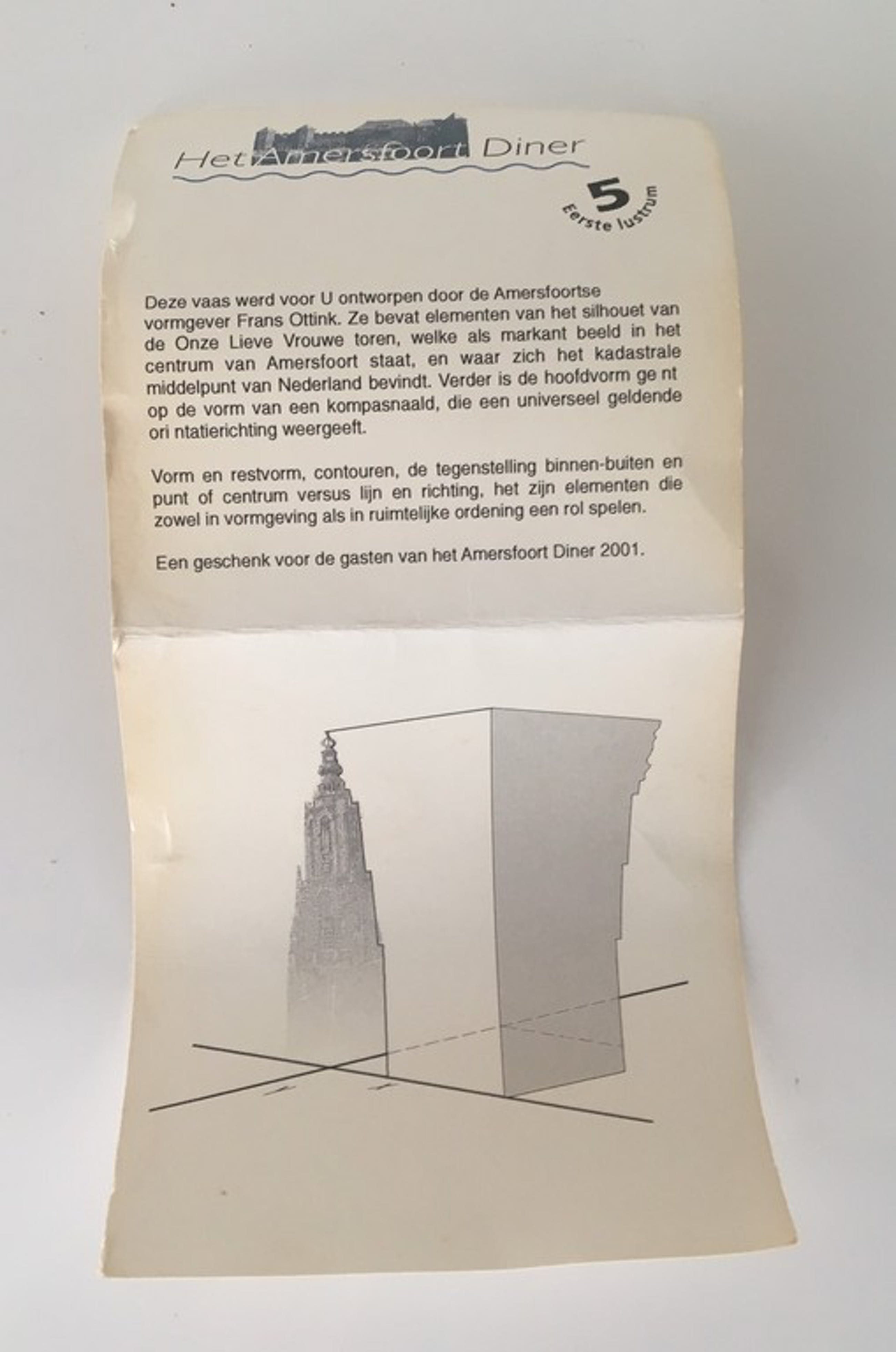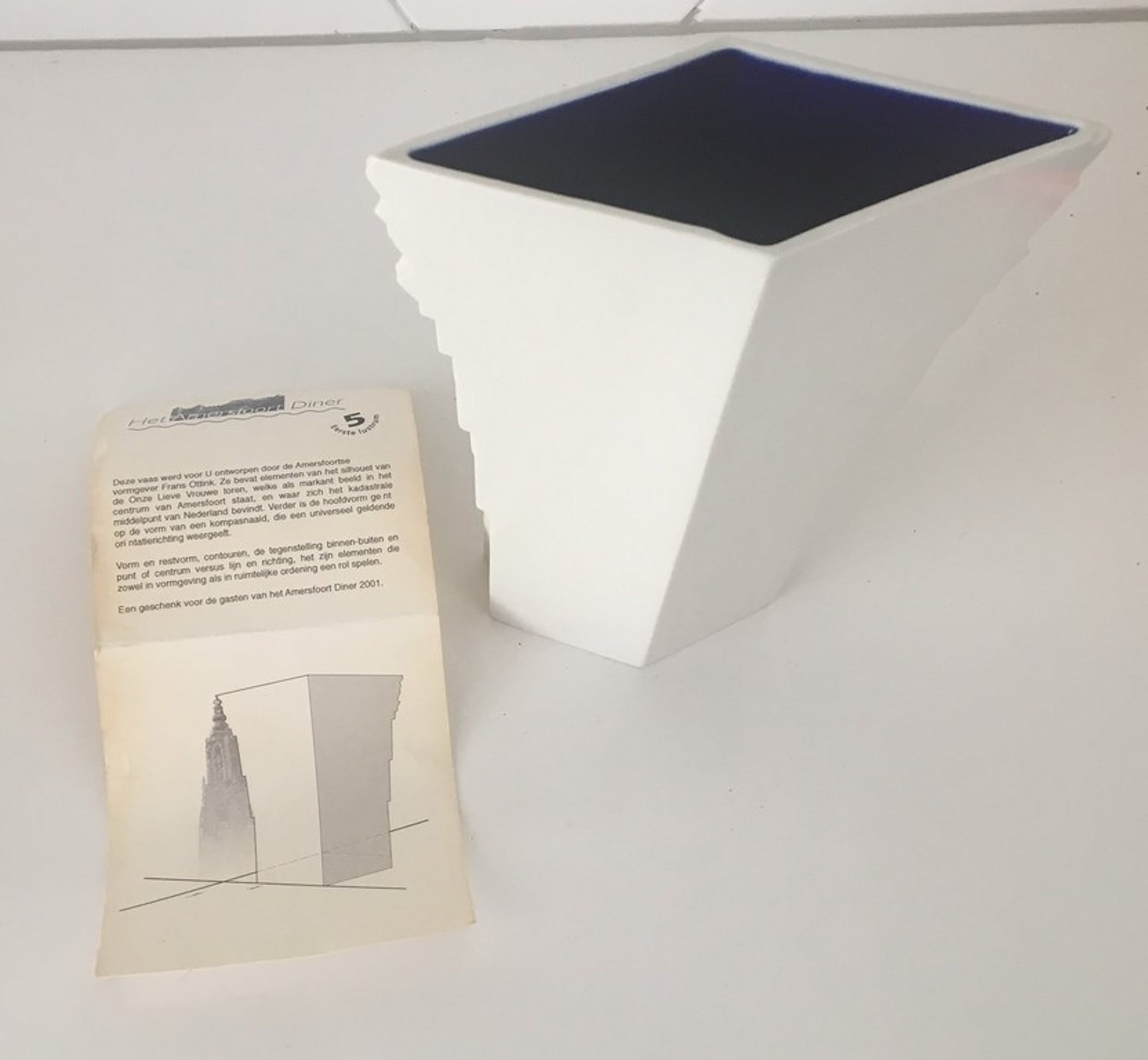 Frans Ottink - Geometrisch Porseleinen vaas gemaakt in eigen Atelier in Amersfoort. De vaas is gemaakt in opdracht voor het lustrum van het Amersfoorts Diner in 2001. De vorm is mede gebaseerd op de Historische burgwal in Amersfoort. De binnenzijde is blauw, aan de buitenkant glazend geglazuurd en aan de zijkant biscuit. In goede conditie, alleen de bovenzijde heeft op de hoeken een drietal fleebites.