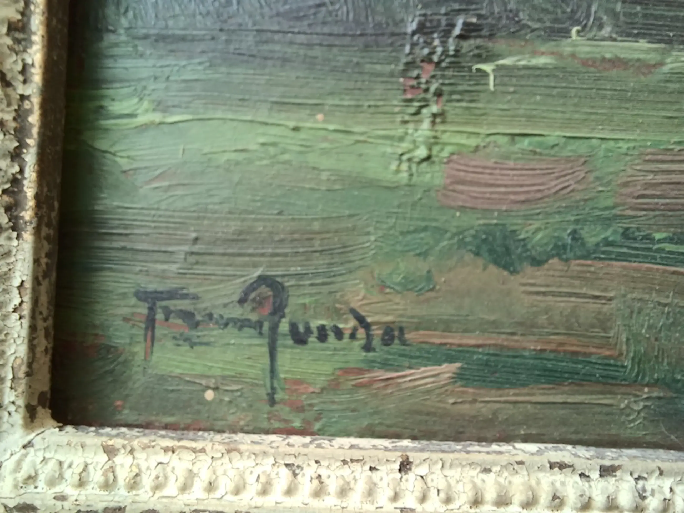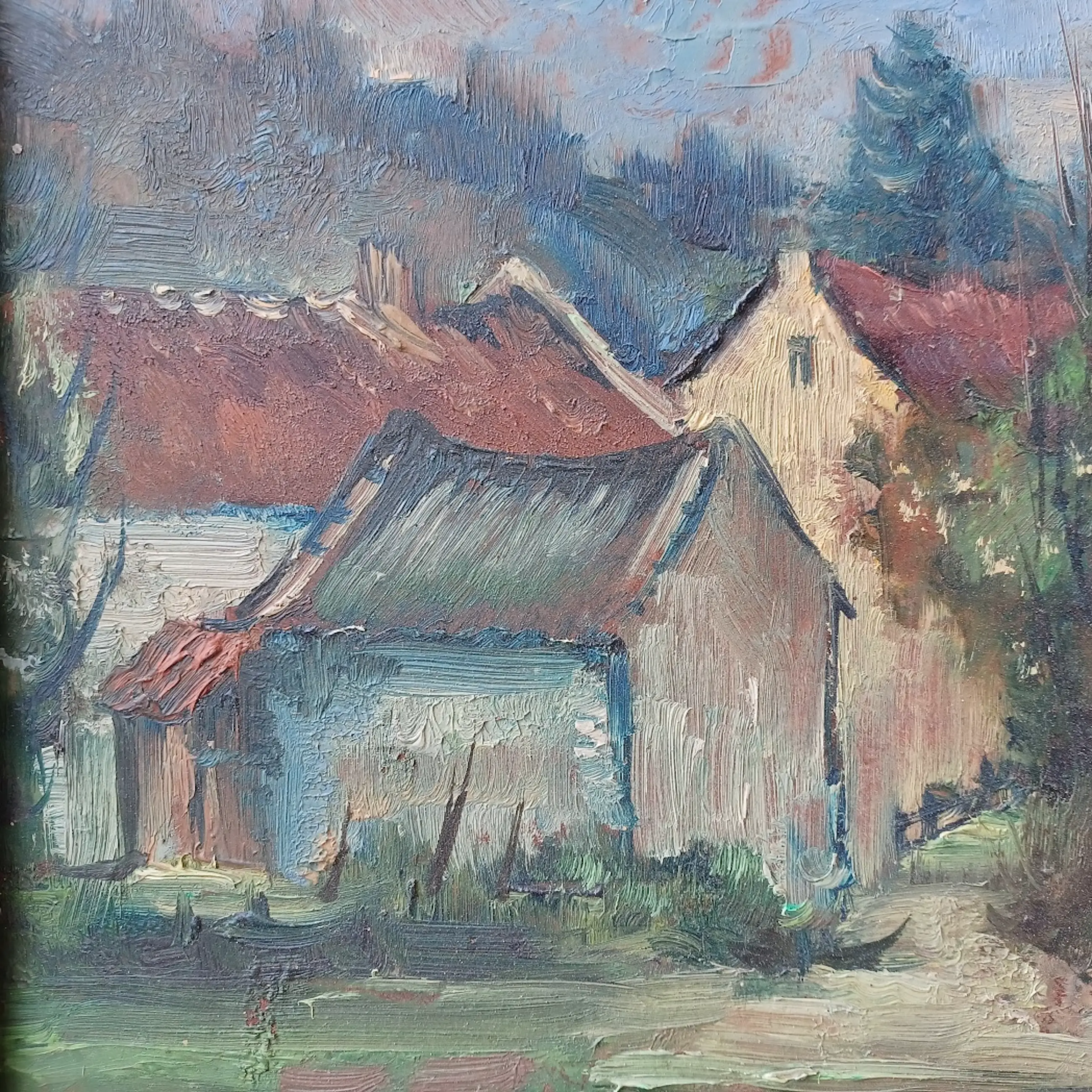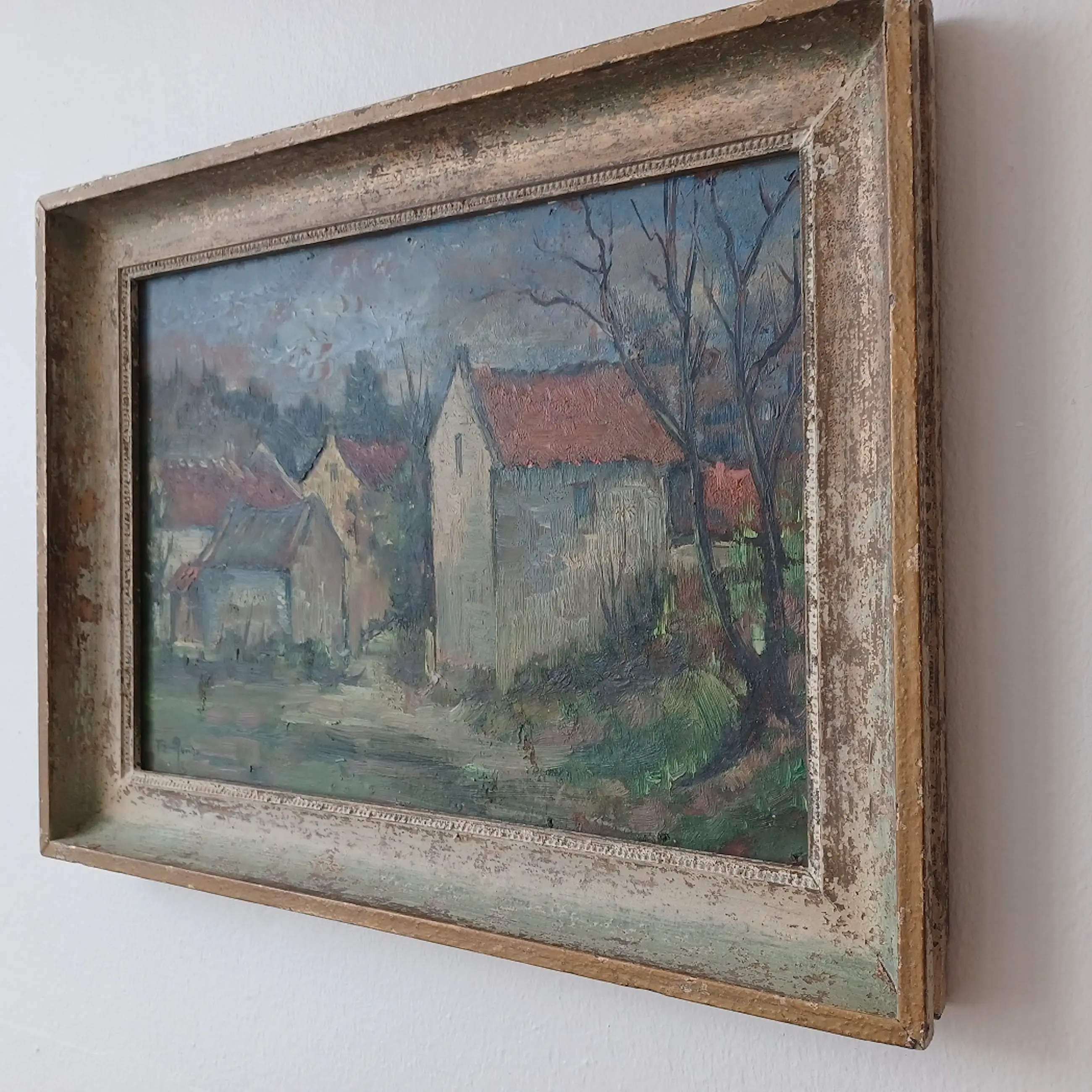 Dit kleurrijke, lieflijke schilderij stelt een dorp in Zuid Limburg voor. Voor de liefhebber. Je kunt aan de boven en onderkant van het schilderij zien dat het ooit met kleine spijkers is vastgezet. Maar storend zijn de kleine gaatjes niet.
