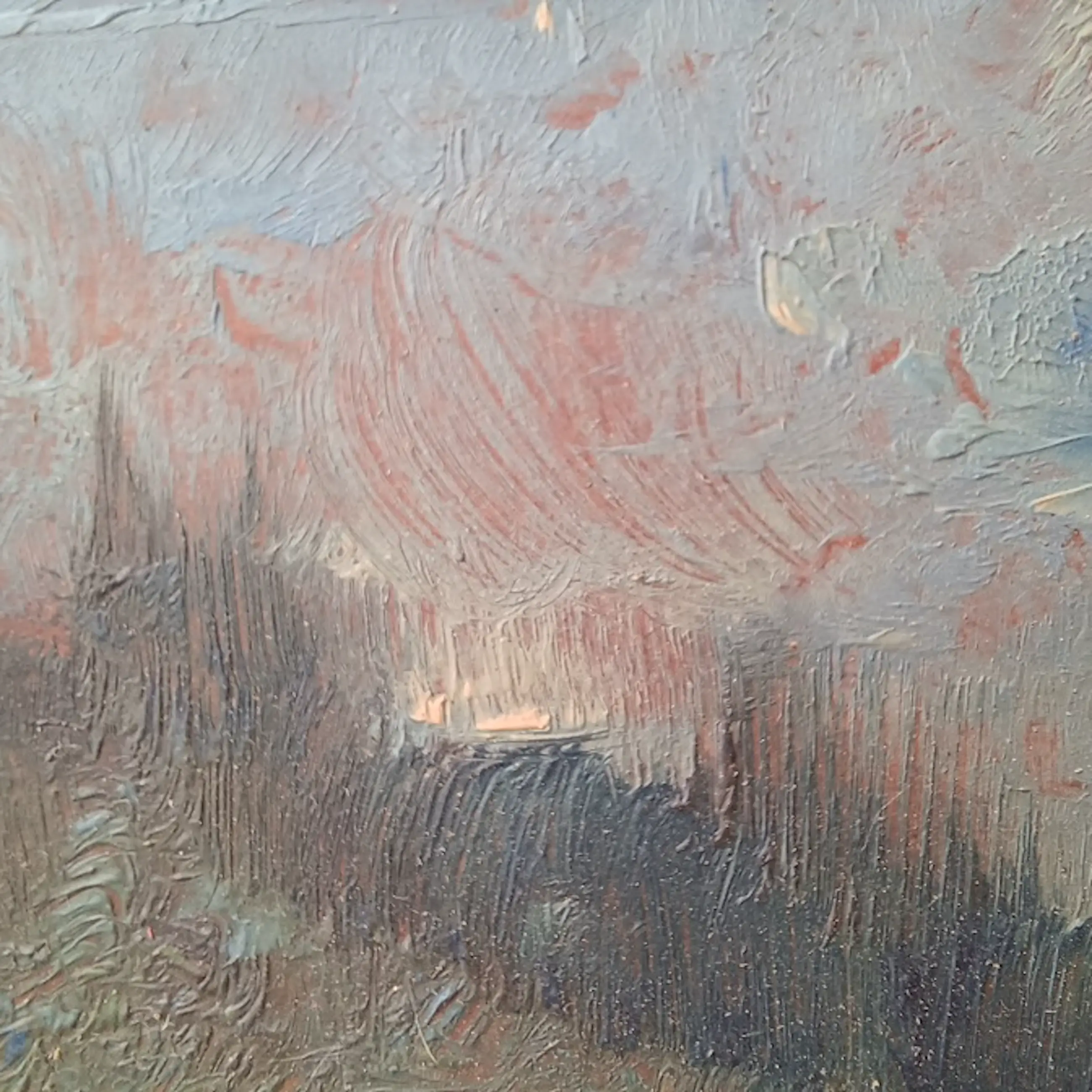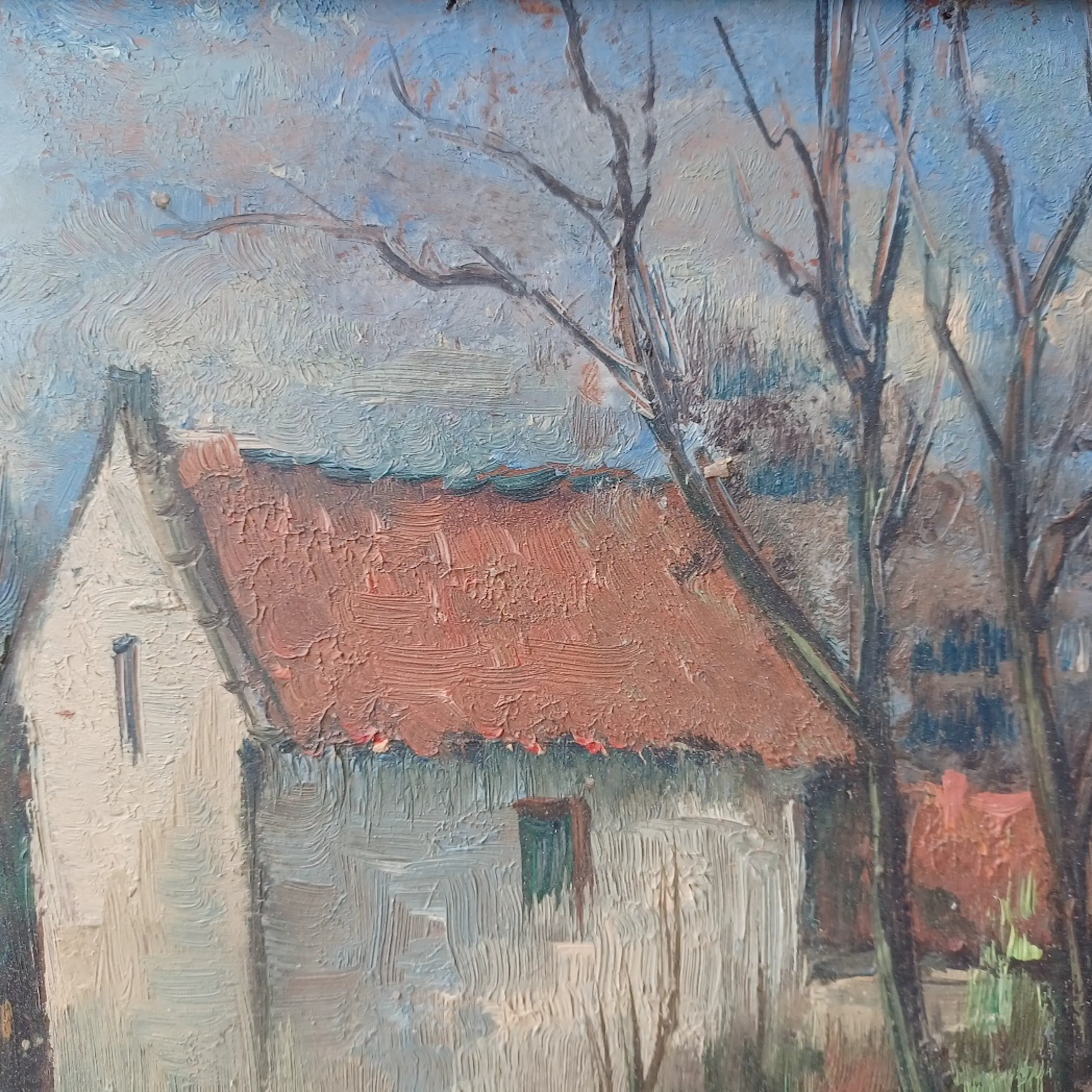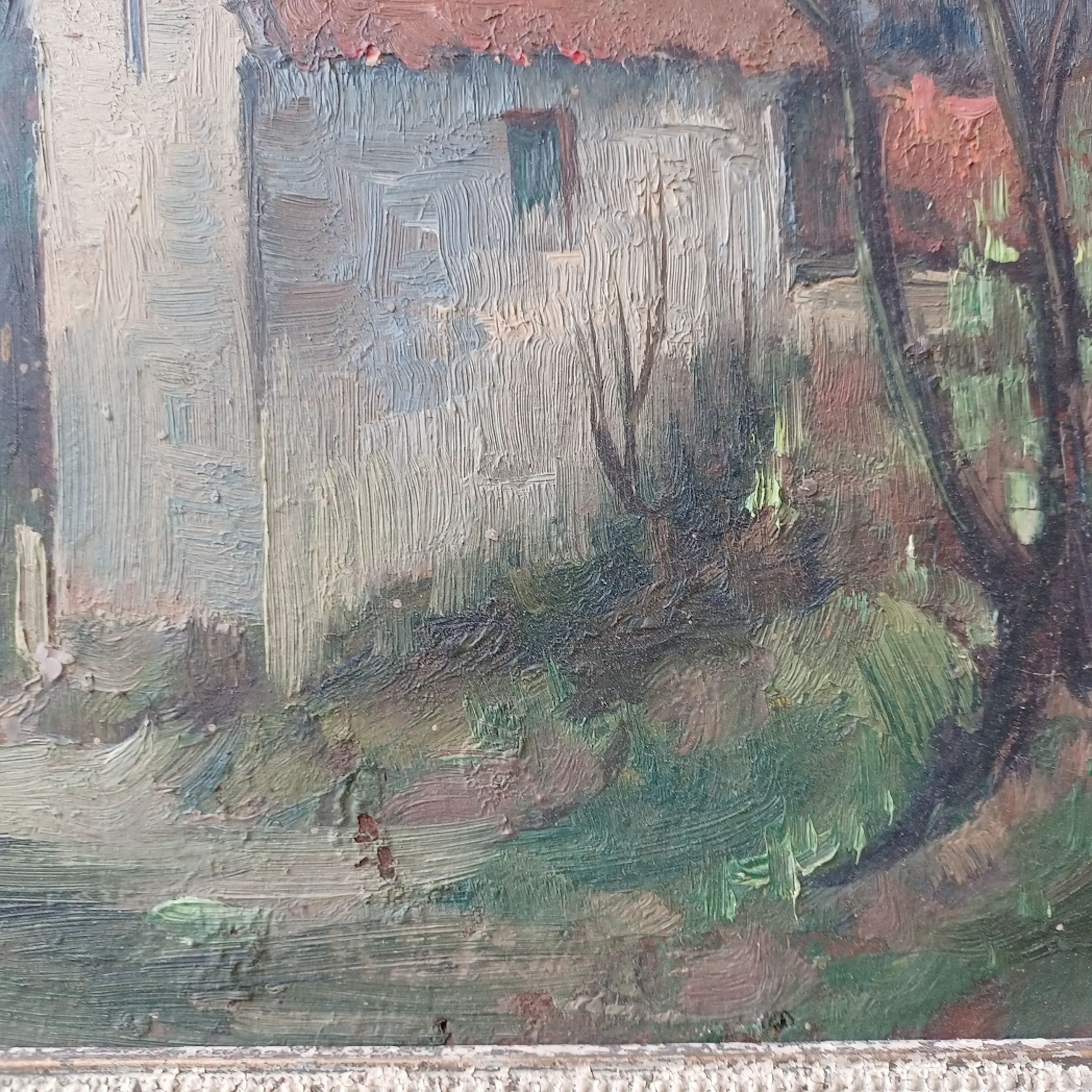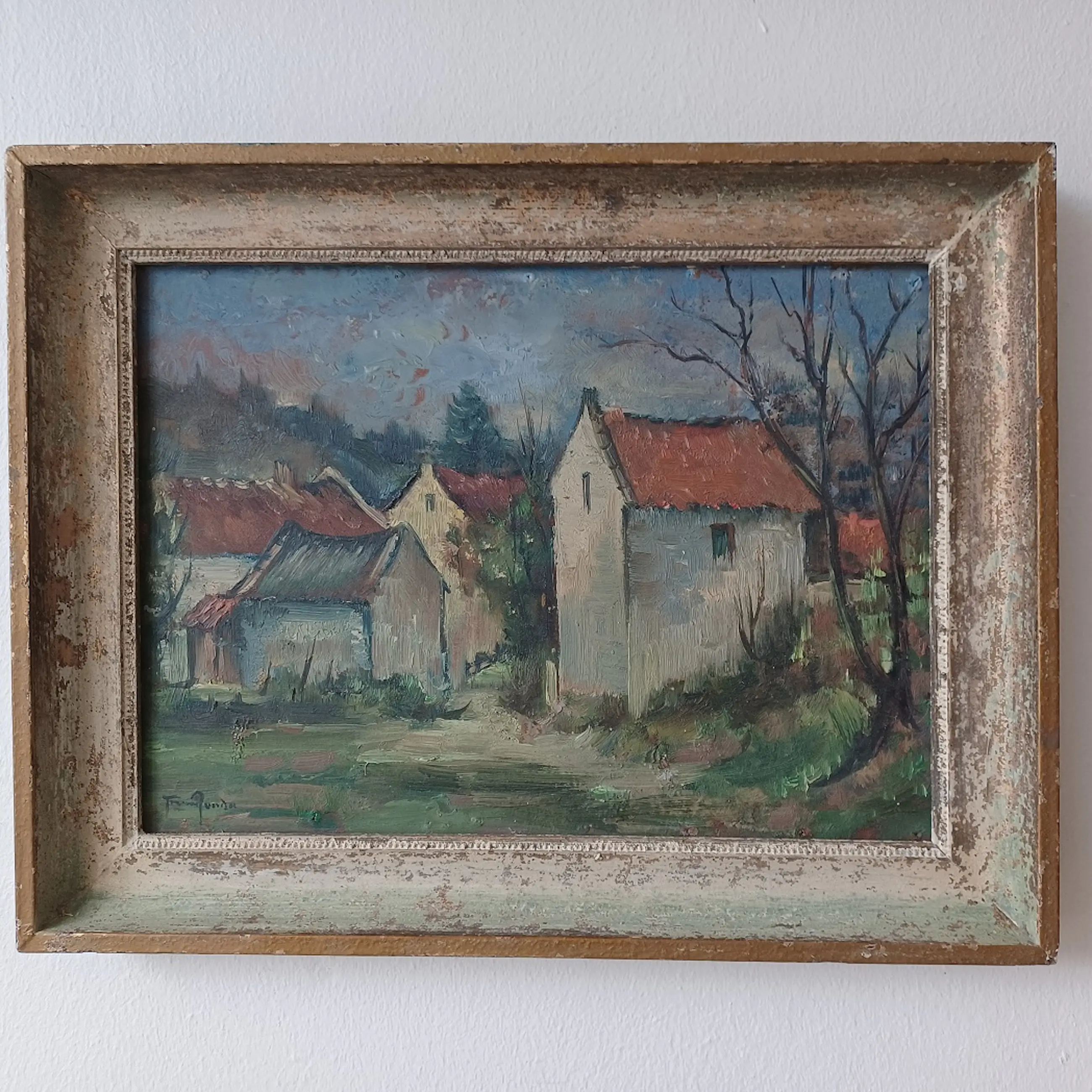 Dit kleurrijke, lieflijke schilderij stelt een dorp in Zuid Limburg voor. Voor de liefhebber. Je kunt aan de boven en onderkant van het schilderij zien dat het ooit met kleine spijkers is vastgezet. Maar storend zijn de kleine gaatjes niet.