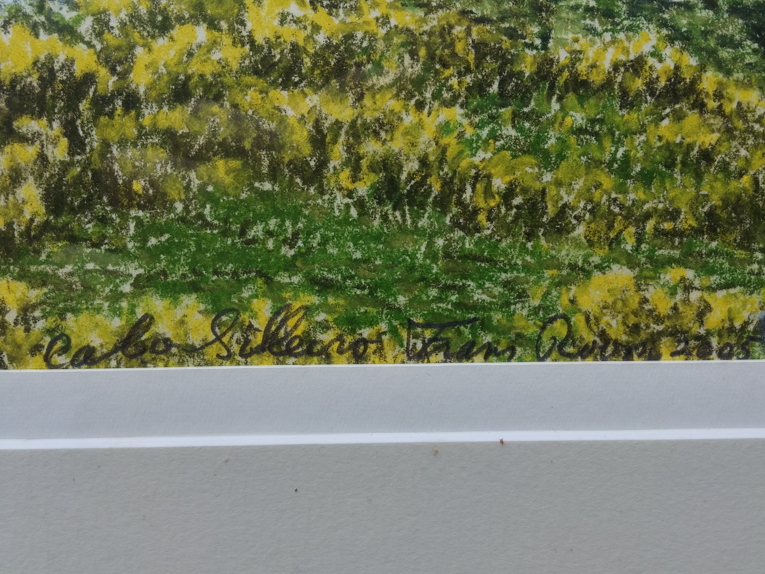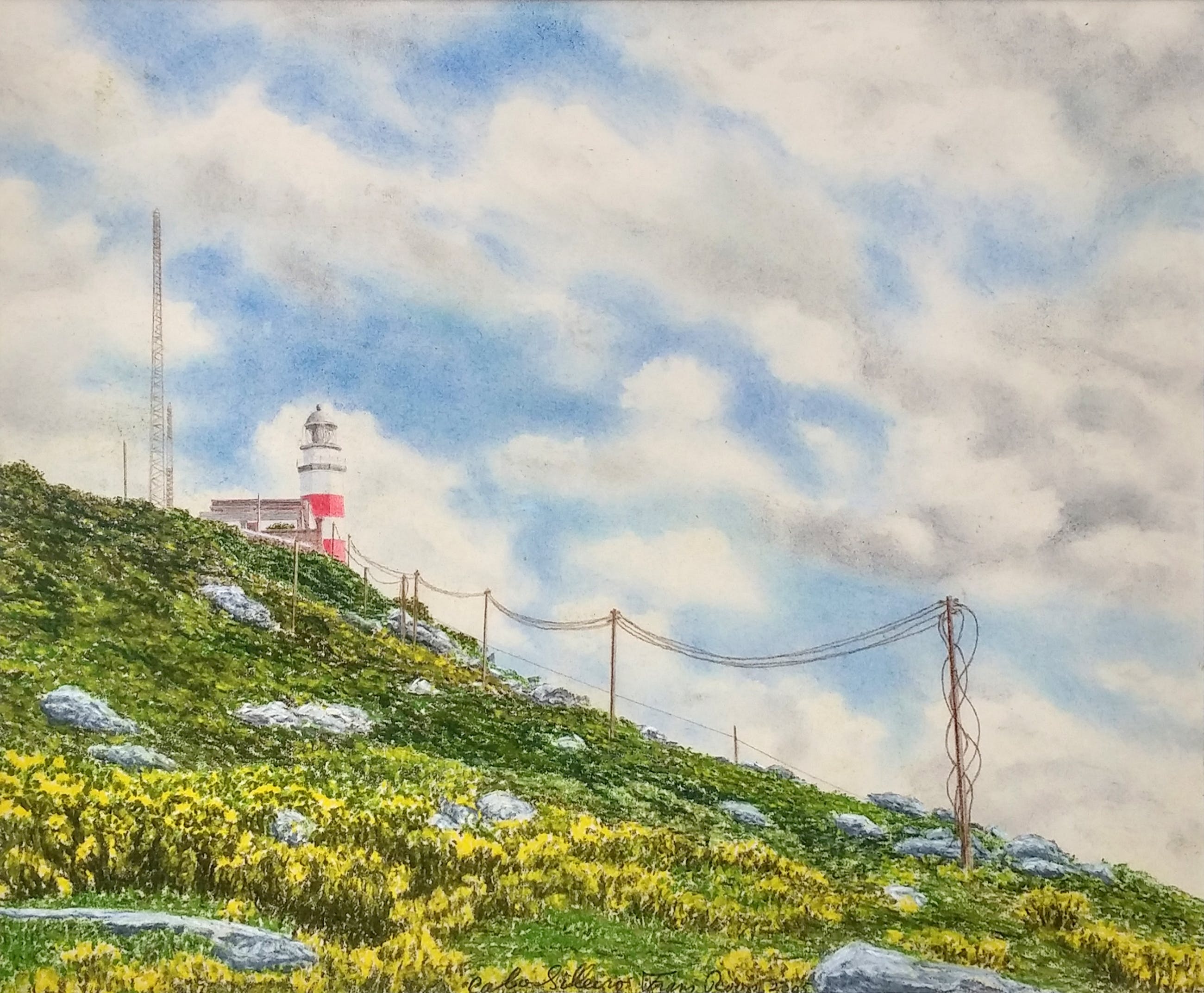 Deze grote vuurtoren op een groot wit gebouw is de Faro Vello de Silleiro. Met karakter FL (2+1)W 15S 24 M. De weg tussen Baiona en As Mariñas voert er langs. Het werk zelf meet 33 x 40 cm en zit achter een passepartout en achter glas in een brons aluminium lijst. Wordt verzekerd verstuurd. Glas is een teer product. Breuk is voor risico koper. Afhalen verdient de aanbeveling.