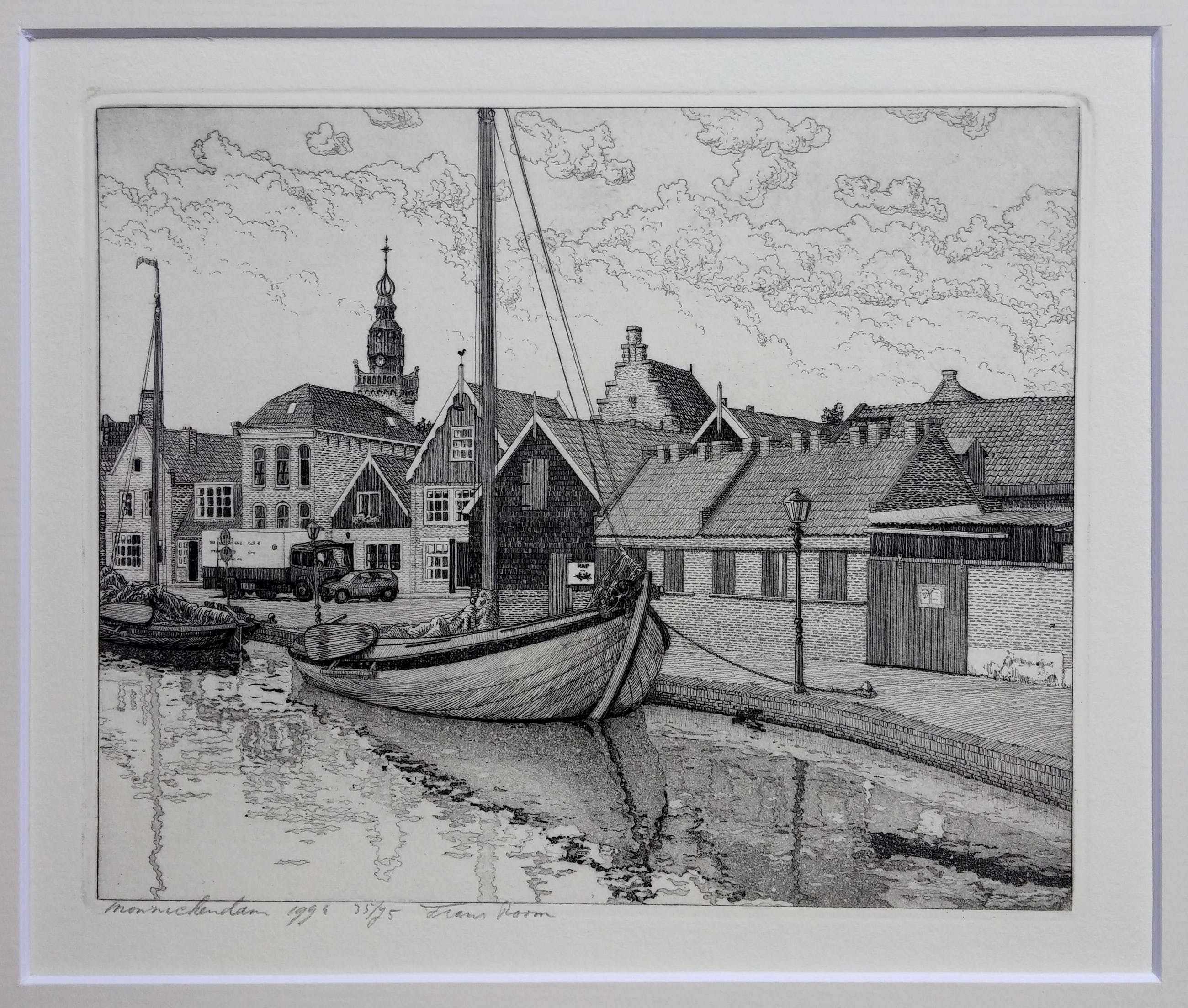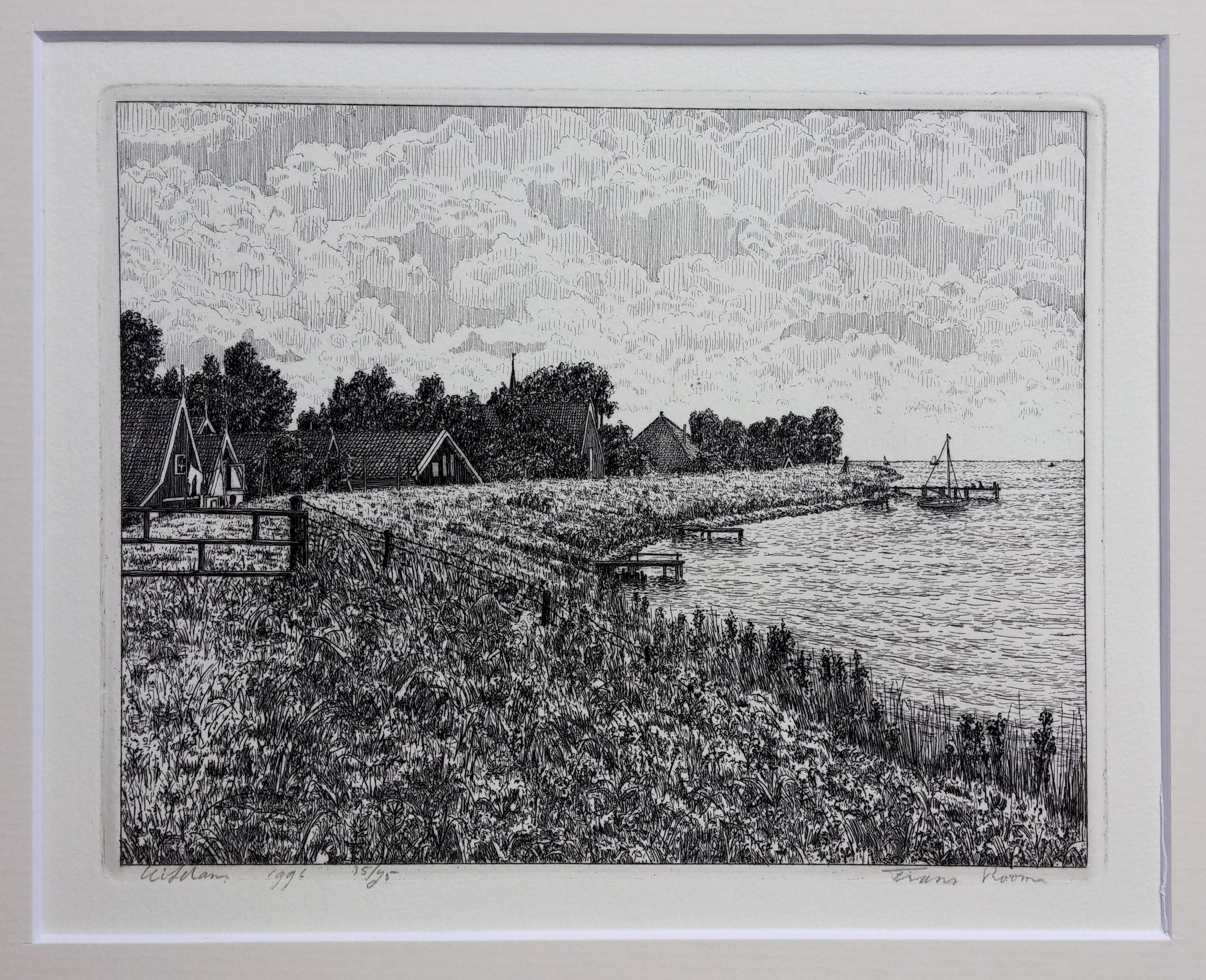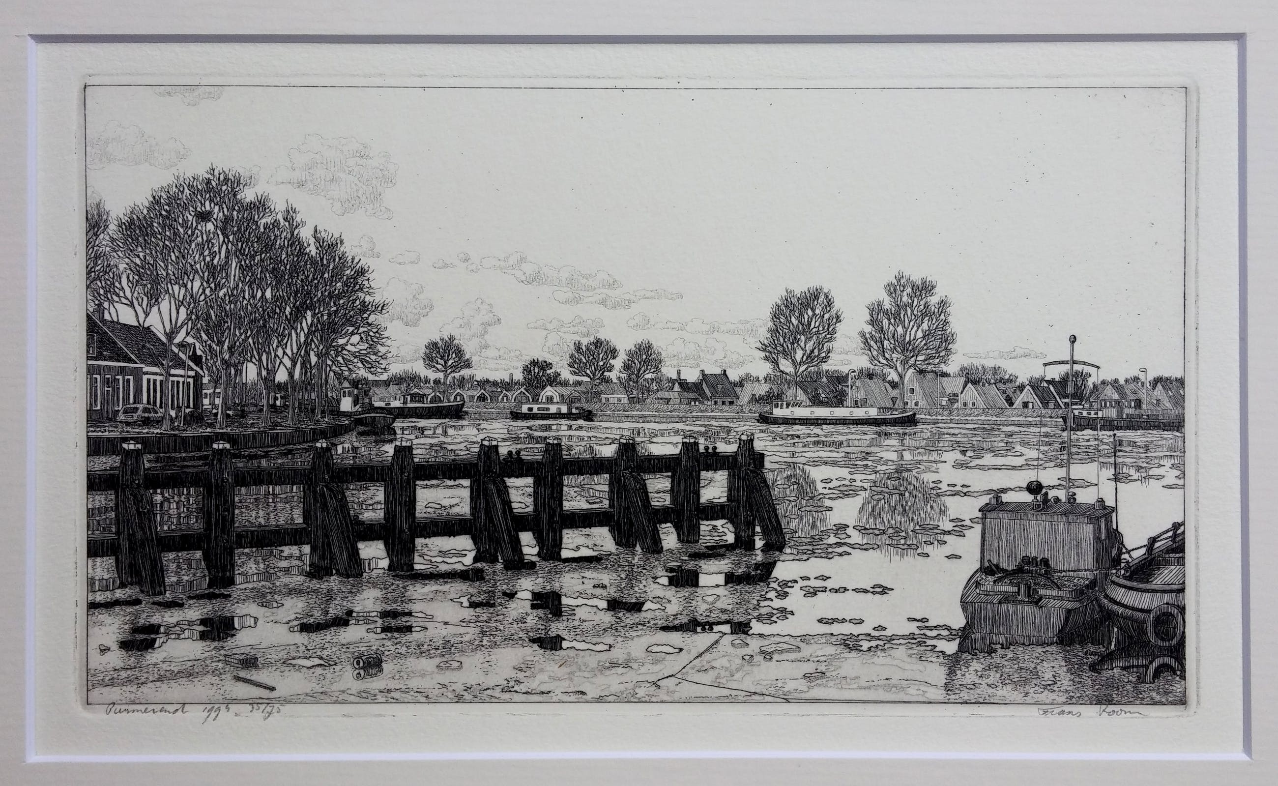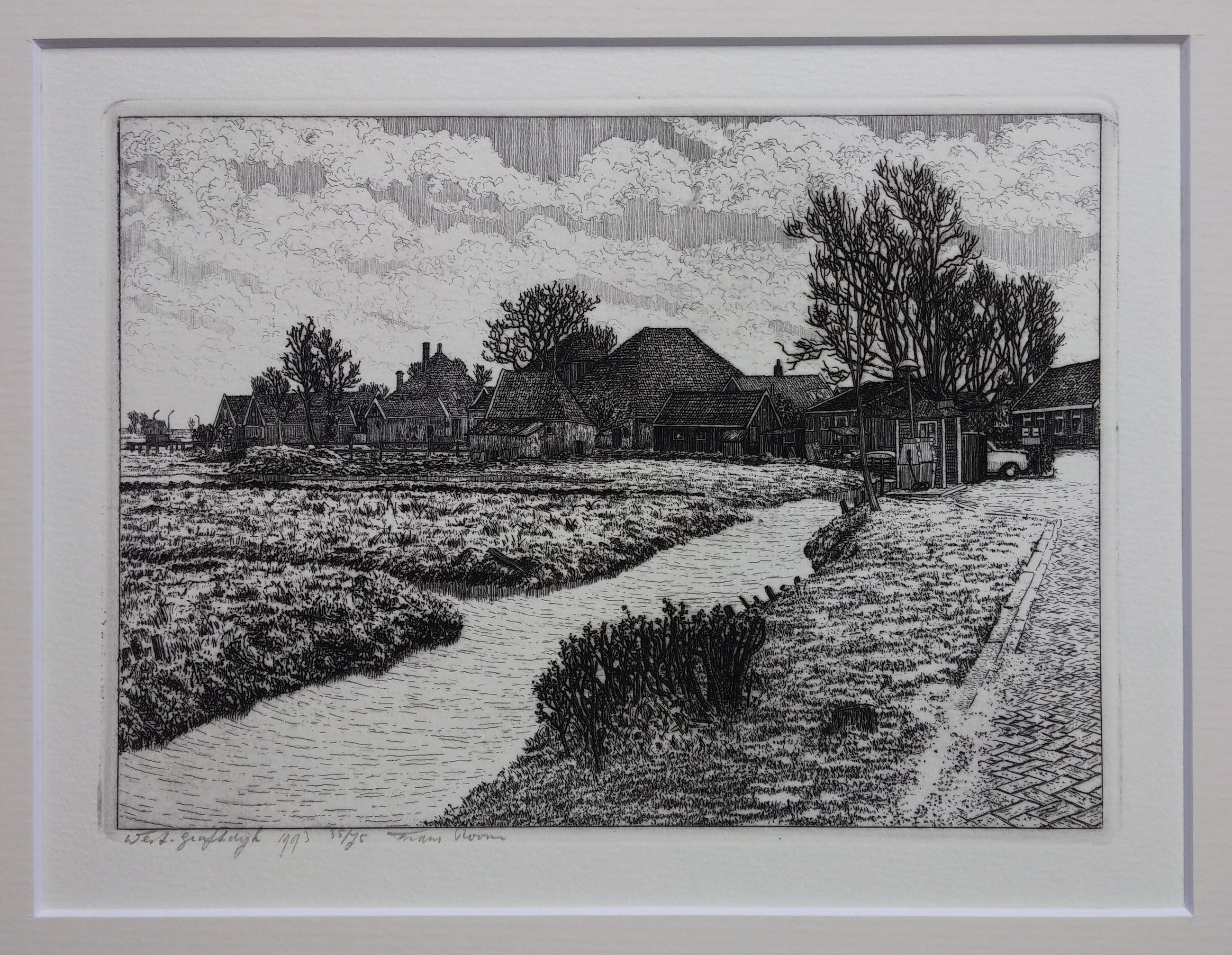 Luxe cassette met 12 etsen van Waterland + boek van Frans Room. Alle werken compleet met passe-partout van 30 x 40 cm. Oplagenummer 35/75. Het boek 'Nat en droog in Waterland' laat de etsen zien met een verhaal over de geschiedenis van elk dorp.