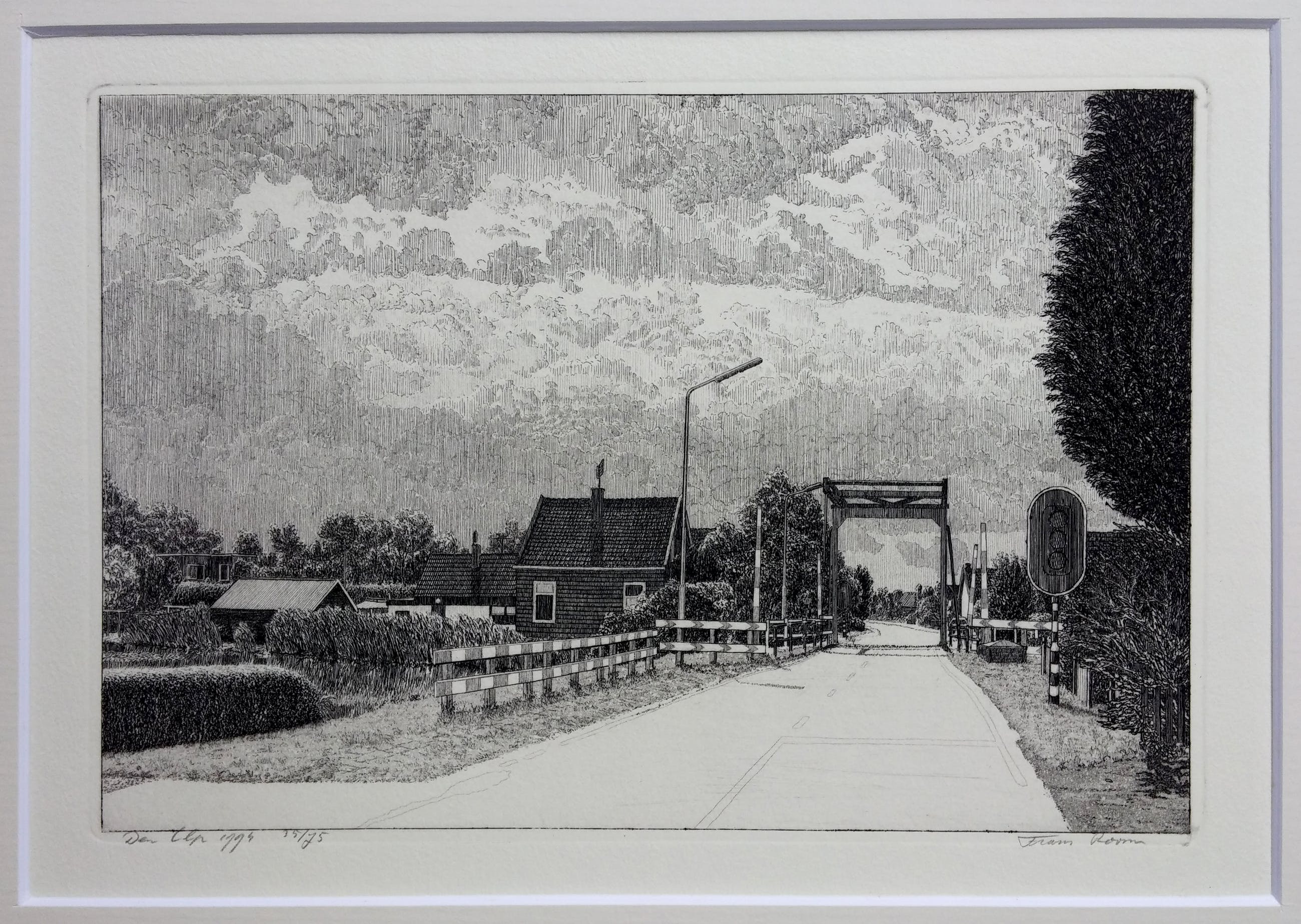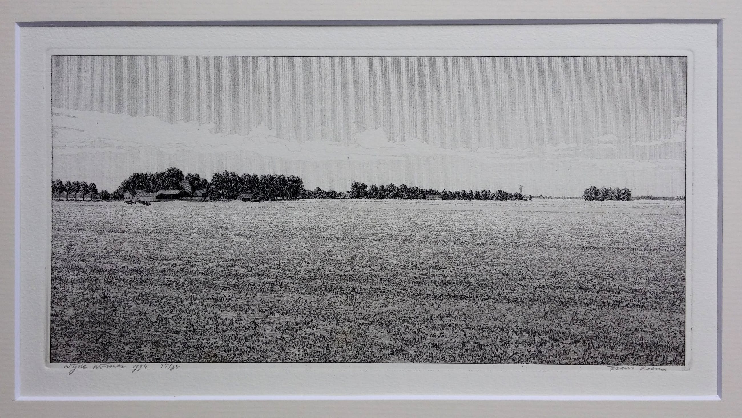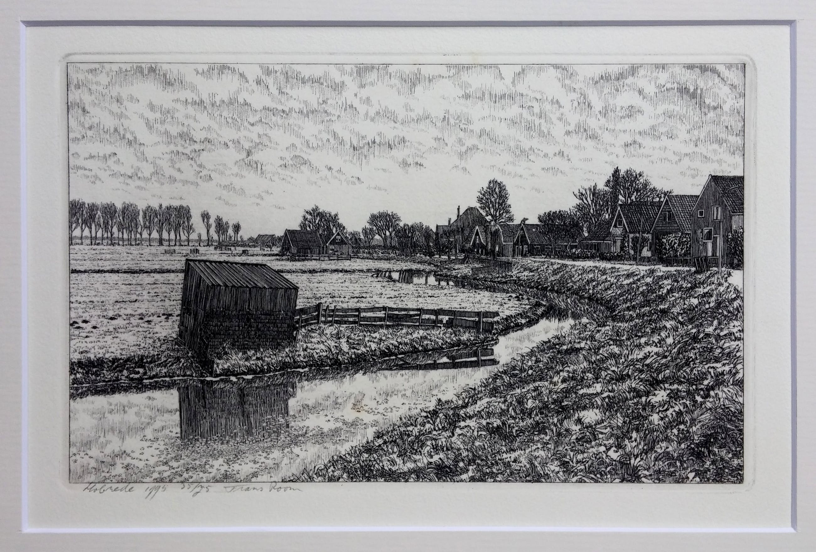 Luxe cassette met 12 etsen van Waterland + boek van Frans Room. Alle werken compleet met passe-partout van 30 x 40 cm. Oplagenummer 35/75. Het boek 'Nat en droog in Waterland' laat de etsen zien met een verhaal over de geschiedenis van elk dorp.