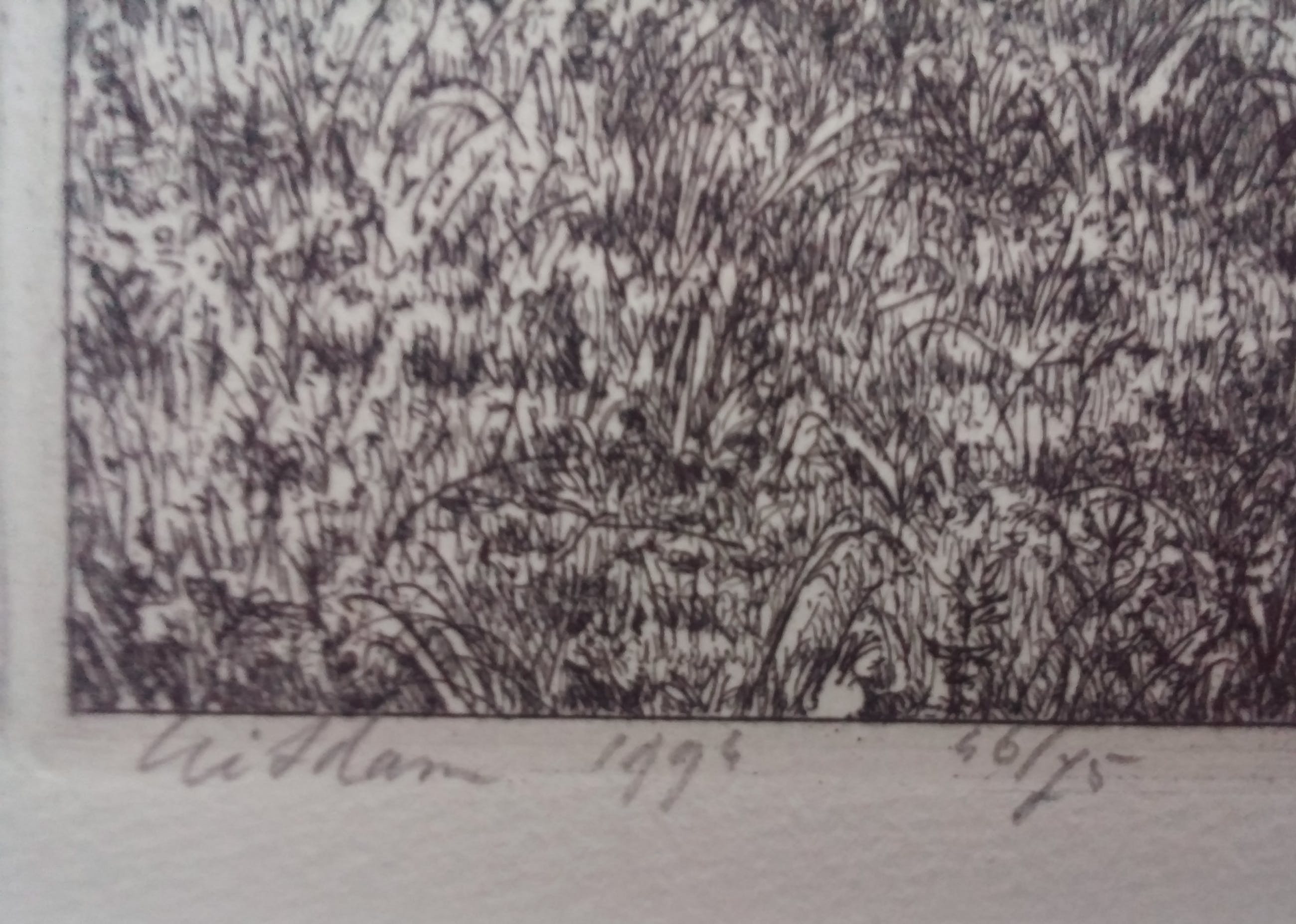 Maat is het beeld. Papier is groter en zou in een lijst van 30 x 40 cm passen. Oplagenummer 46/75. Bij ophalen komt hij in een passe-partout.