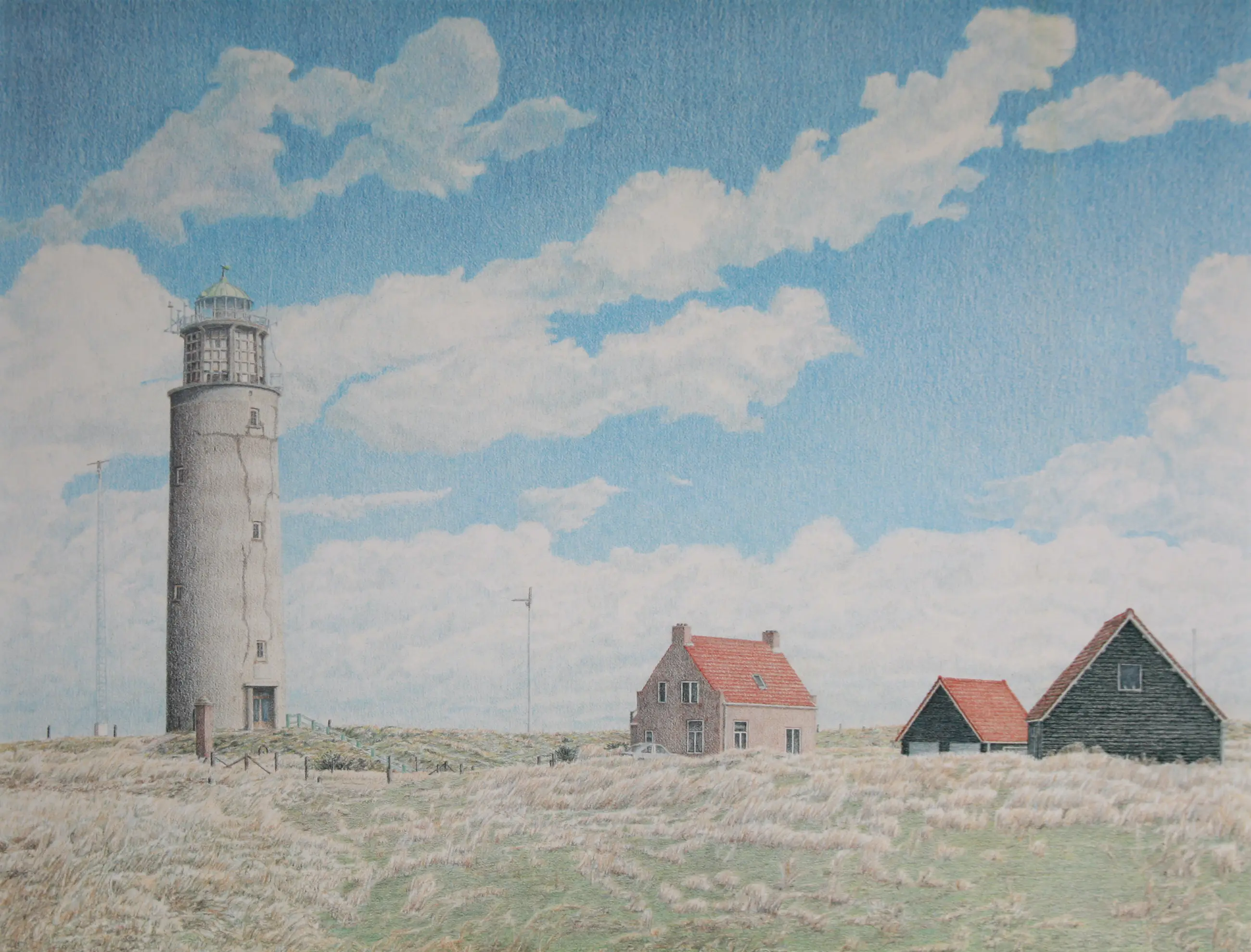 Texel kreeg in 1864 een vuurtoren, nadat hier jarenlang actie voor was gevoerd door de Texelse notaris Kikkert. De omringende wateren waren namelijk zo gevaarlijk voor de scheepvaart dat er vóór de oprichting van de vuurtoren jaar na jaar schepen vergingen. In de Tweede Wereldoorlog vond een belangrijk deel van de Georgische Opstand of Russenoorlog rond de vuurtoren plaats. De kogelgaten zijn nog steeds in de muur van de toren te zien. Eigenlijke beeld is 49 x 62 cm. Oplagenummer kan verschillen van die van de foto. Wordt verzekerd verzonden in een stevige kartonnen koker.