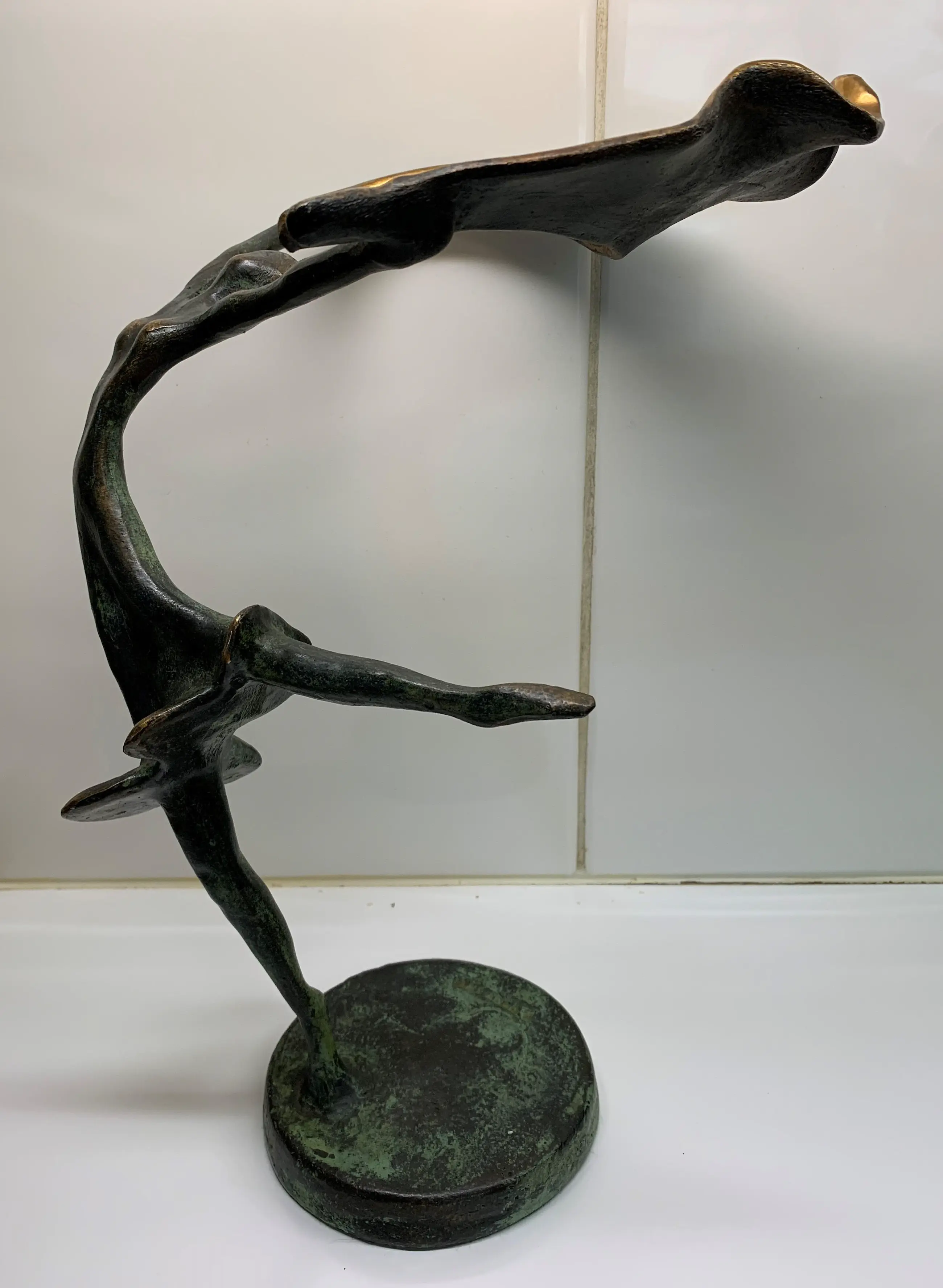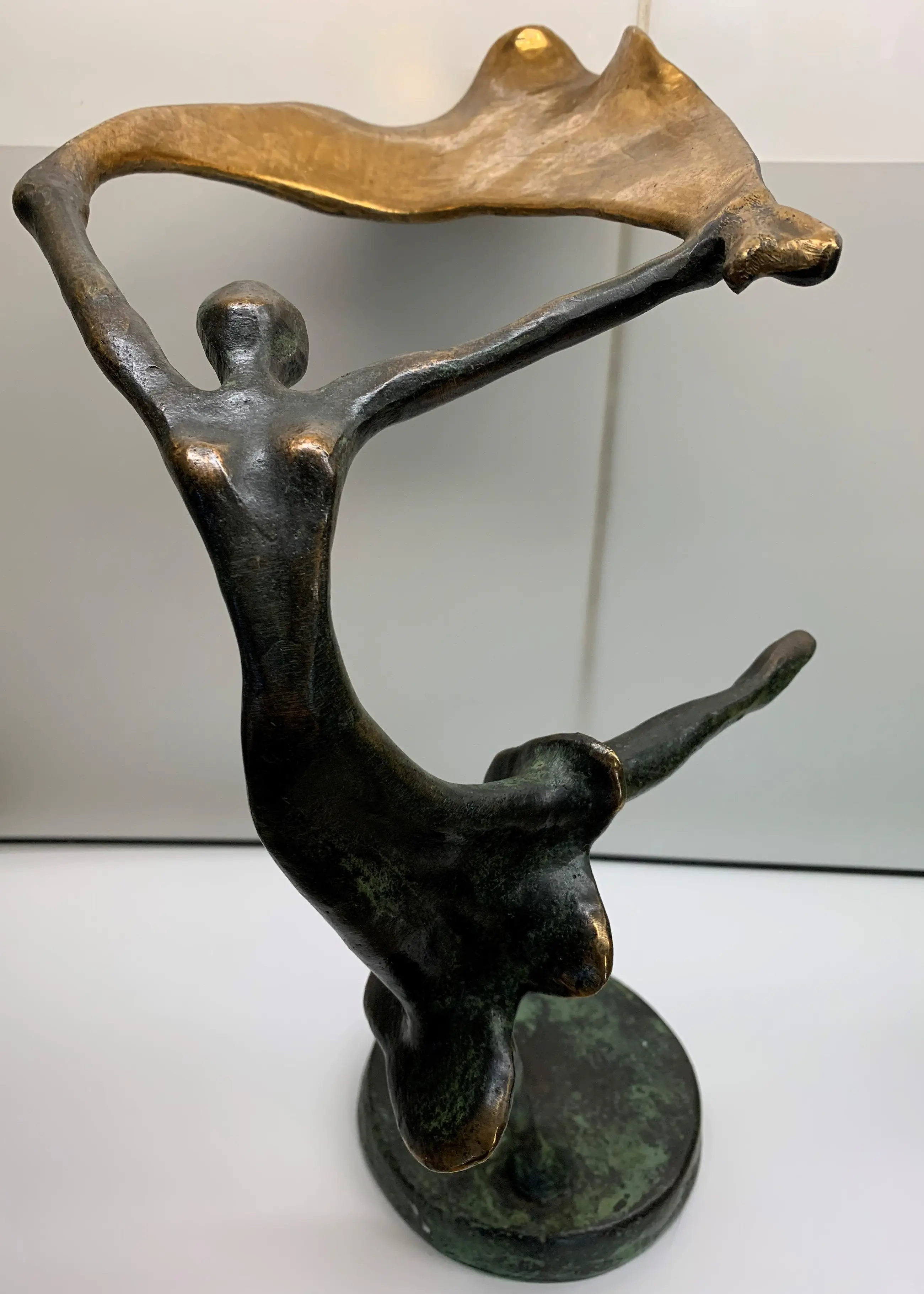 Prachtig bronzen beeld van een danseres met doek spelend in de wind. In perfecte staat.