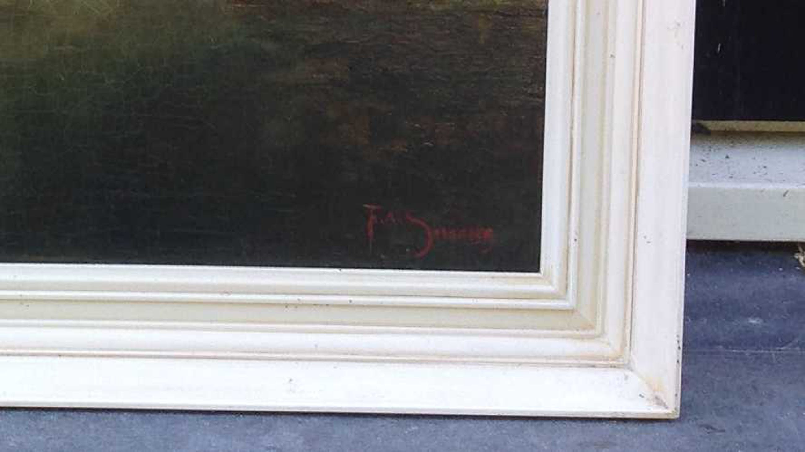 | Doek bevat oppervlaktevuil en verkleurde vernis door de tijd, craquelures, plekje verfverlies, de lijst bevat oppervlaktevuil en slijtschade door de tijd. | |