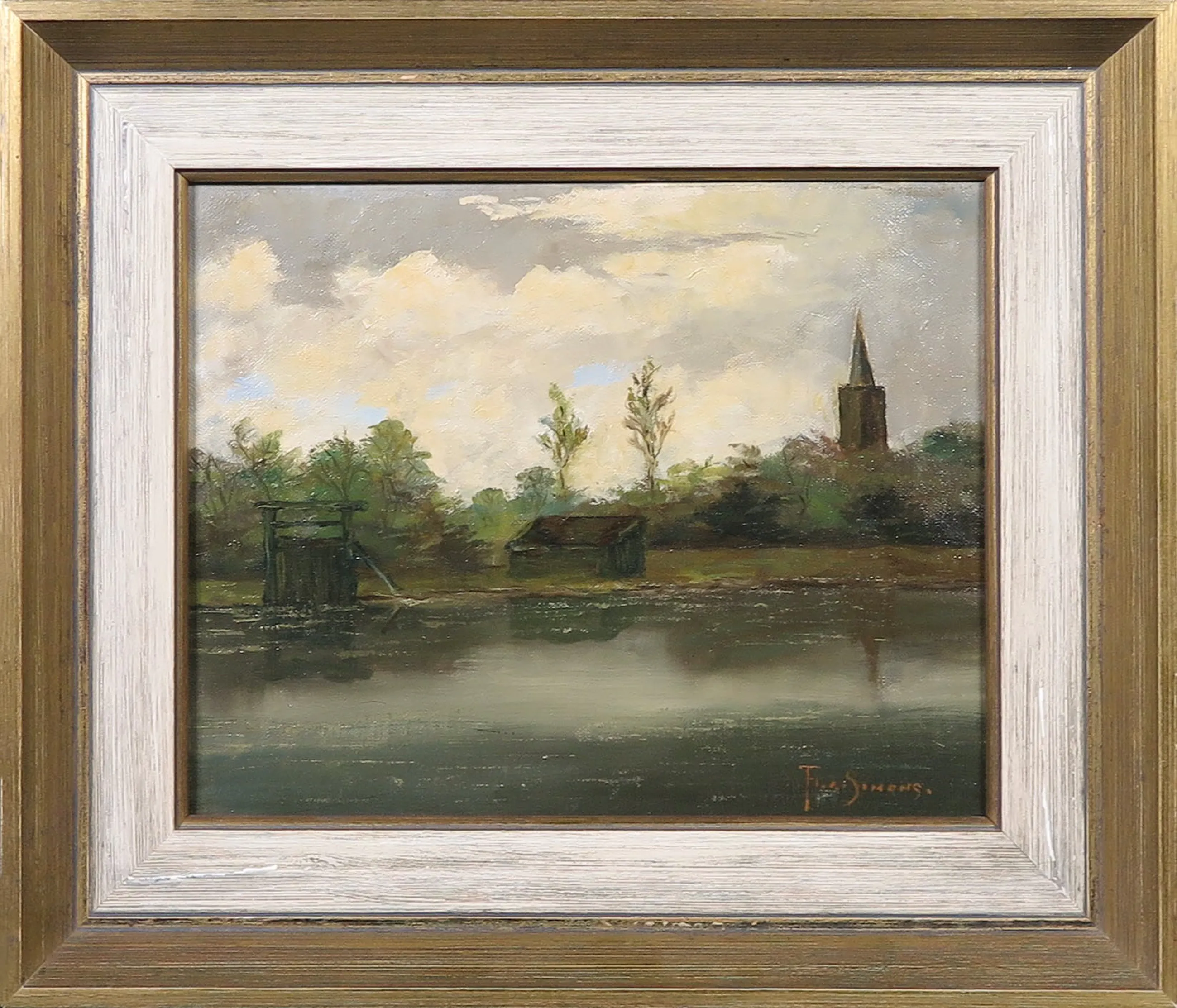 | Het werk zit ietwat los in de lijst. De voorstelling is minimaal verkleurd door de vernislaag, voornamelijk in het wolkendek. Aan de rechter bovenhoek wat viezigheid. (Zie foto) | |