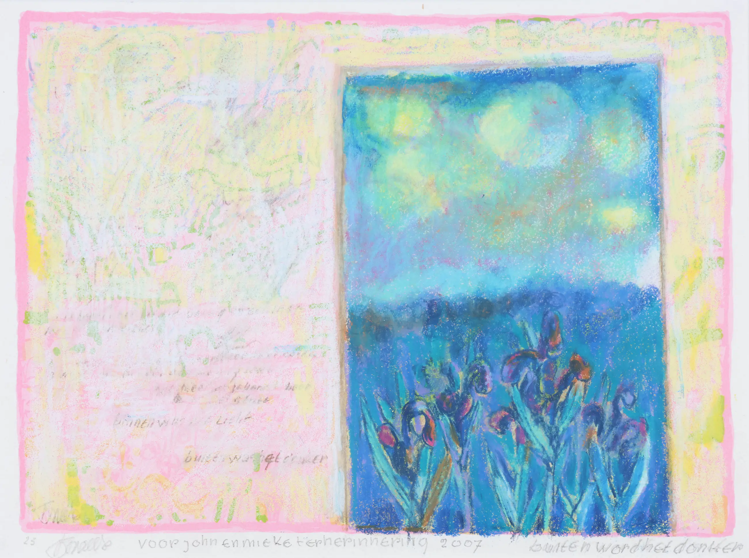 Deze zeefdruk is gemaakt door Frans Smeets (1925–2014), een veelzijdig Nederlands kunstenaar. Hij was onder meer houtdraaier, glazenier, mozaïekkunstenaar, schilder, tekenaar, textielkunstenaar en docent. In zijn schilderwerk richtte Smeets zich vooral op (bloem)stillevens, portretten, landschappen en figuurvoorstellingen. Gedurende een periode werkte hij in de stijl van het abstract expressionisme. Bij het uitvoeren van een opdracht voor een glas-in-loodraam schilderde hij vaak in de omgeving zelf, om zo de juiste sfeer te ervaren. Naast zijn schilderijen maakte Smeets ook houten poppen en wandkleden.