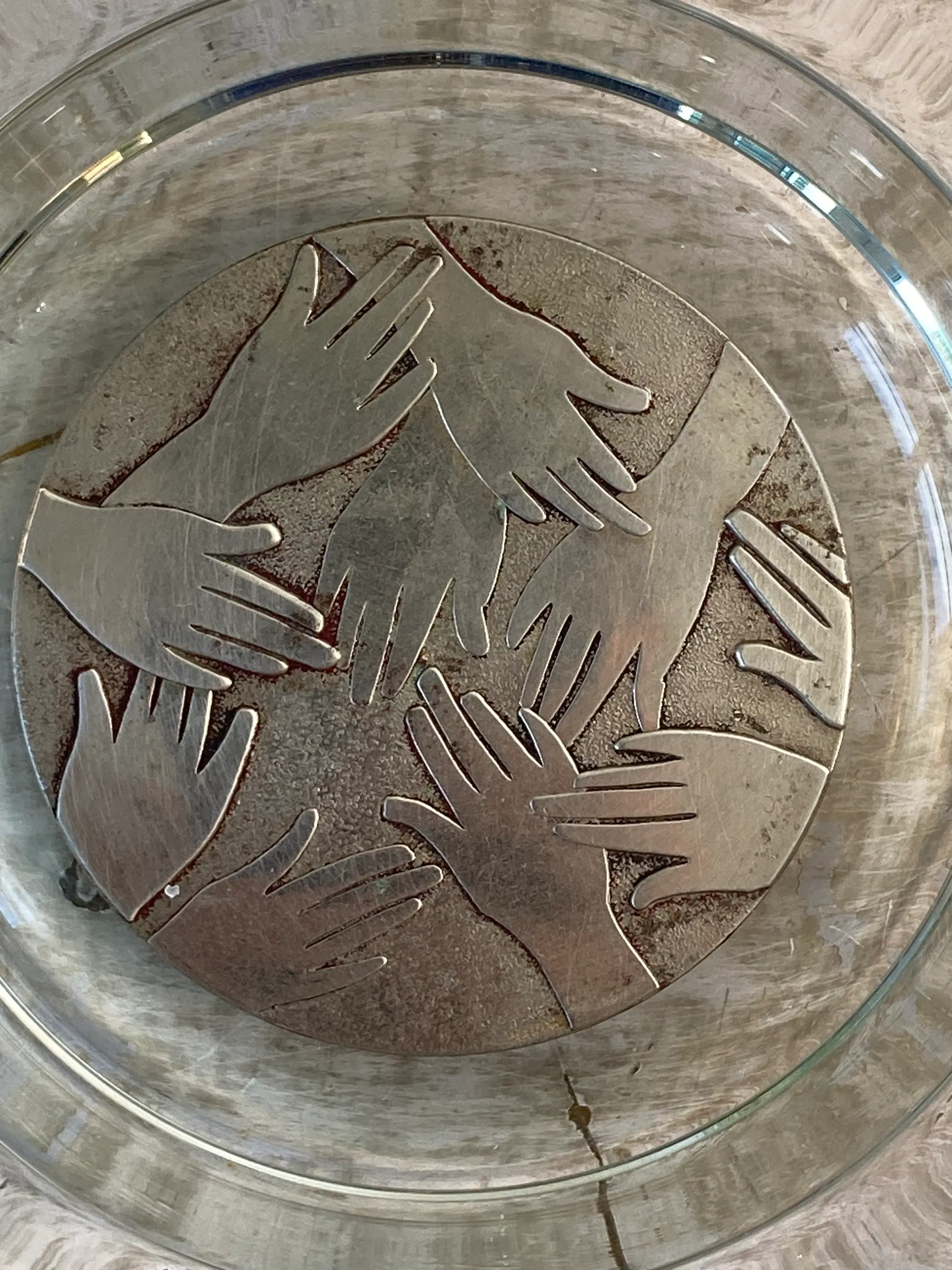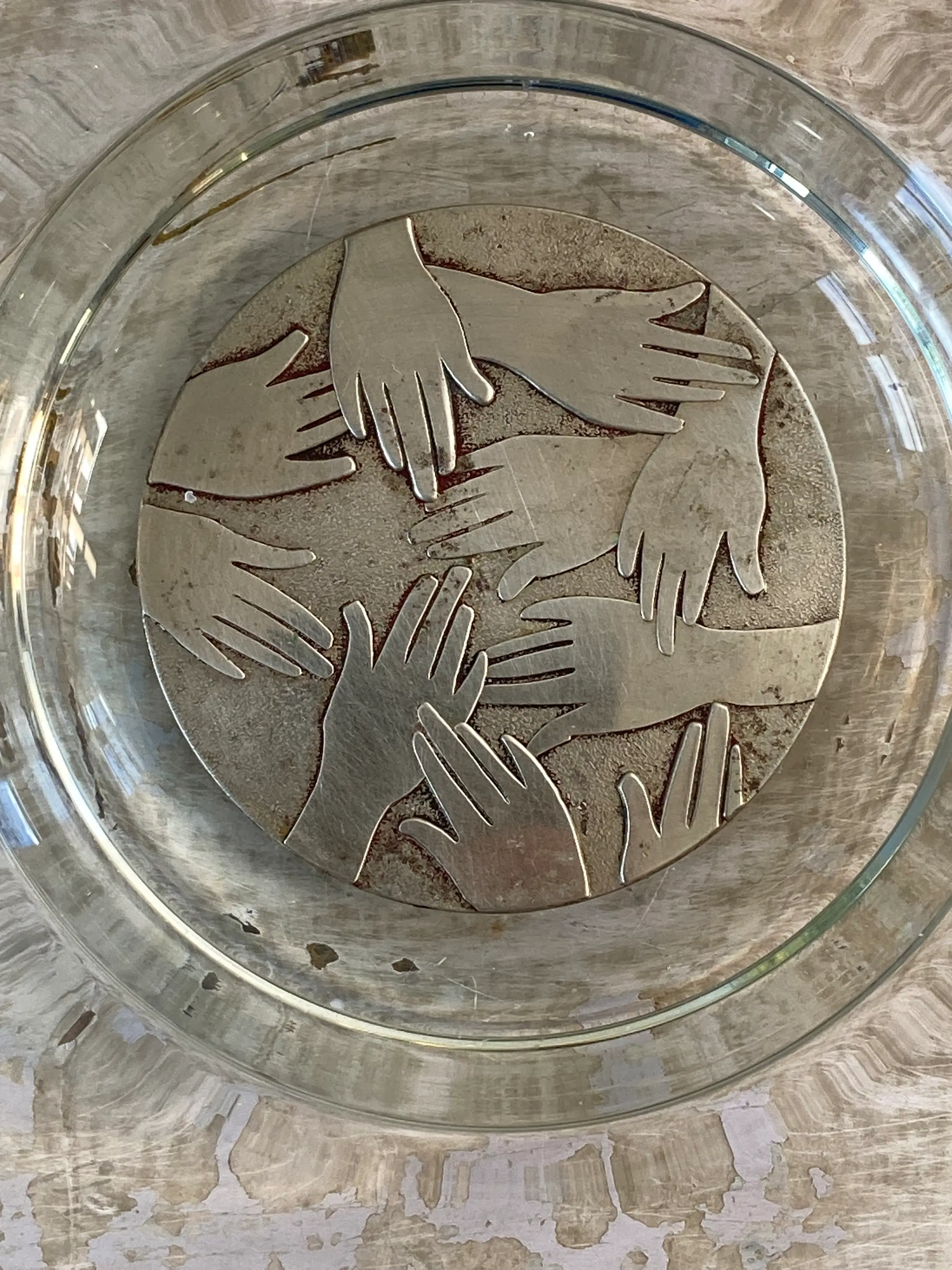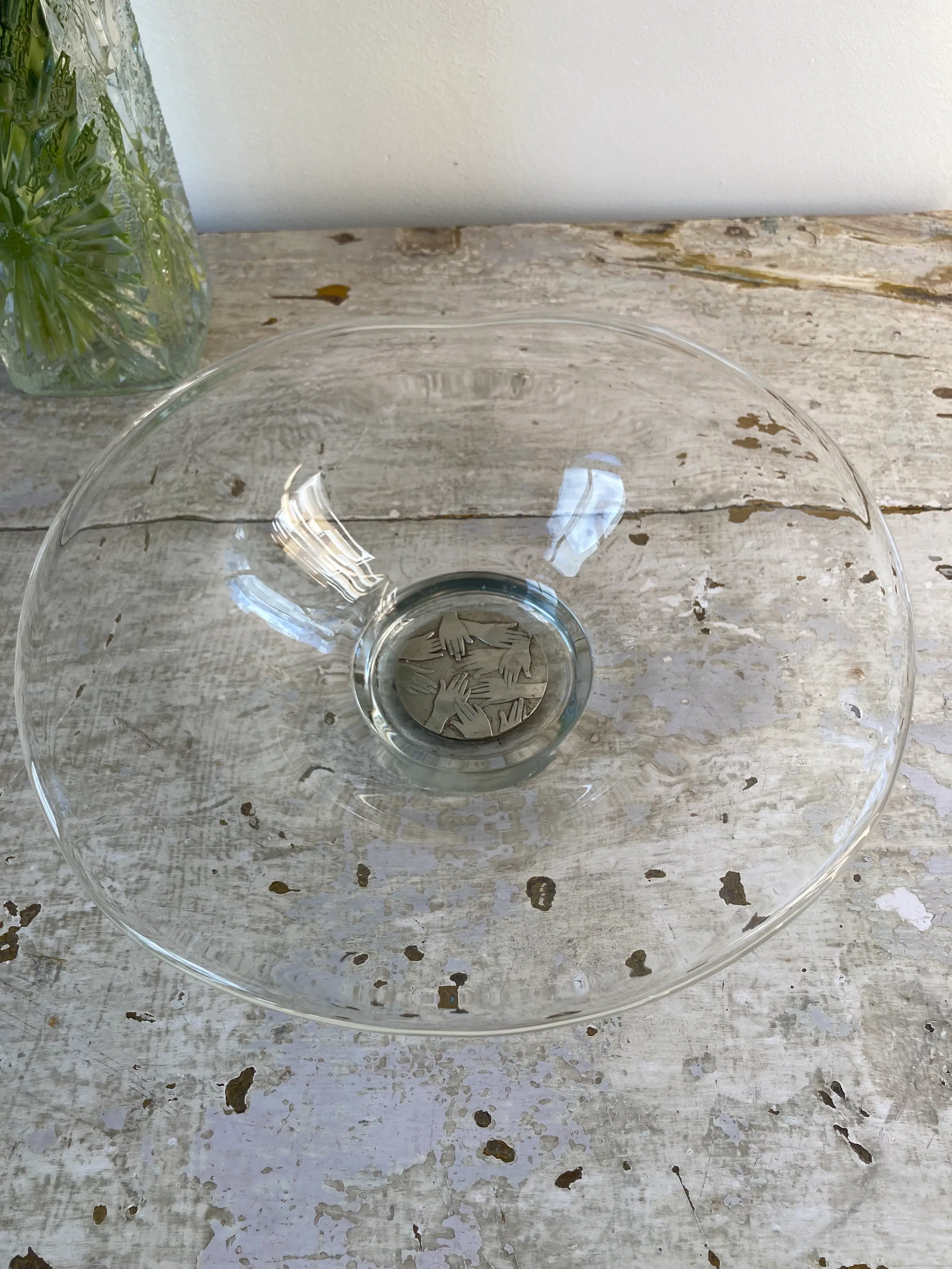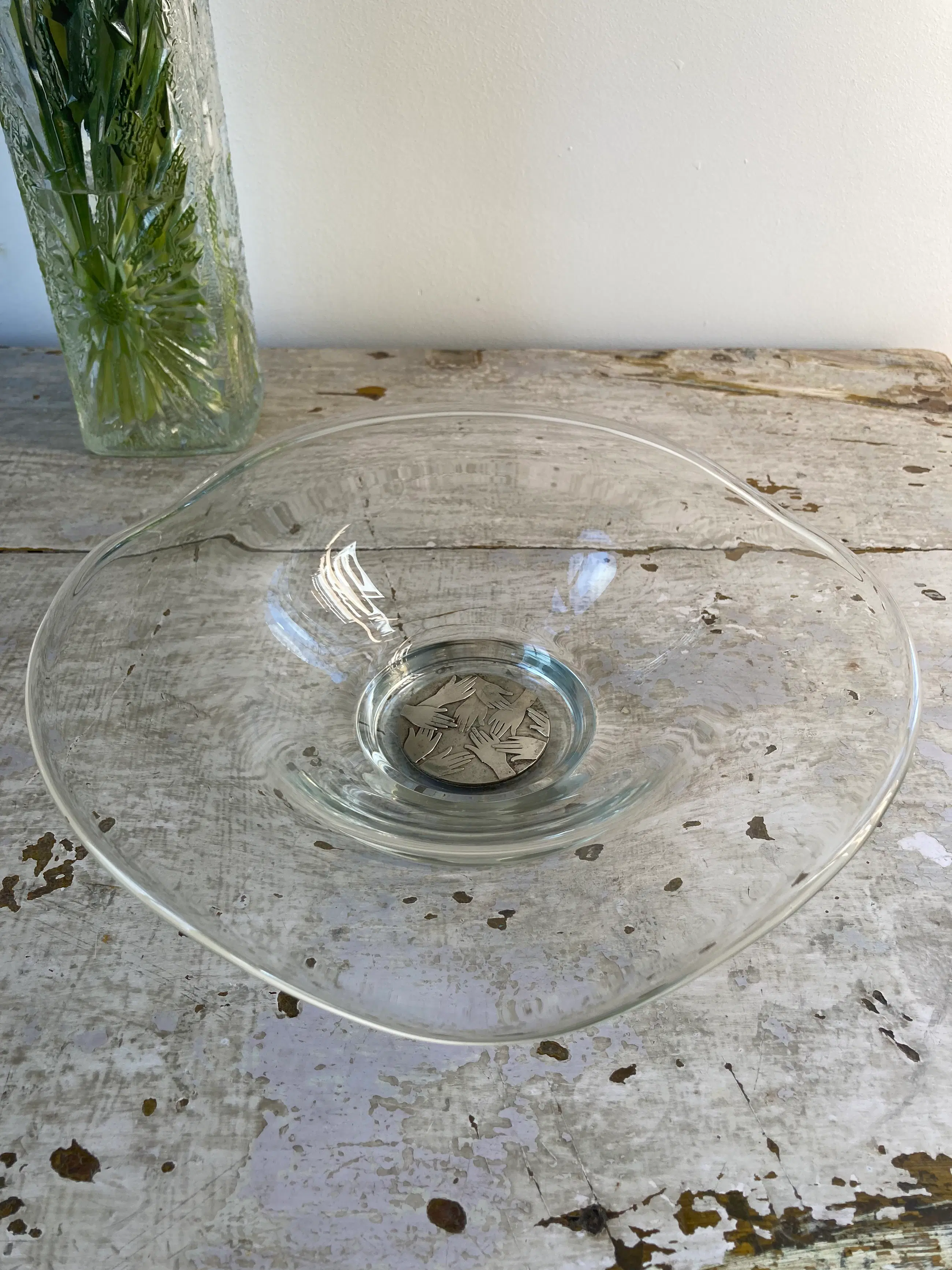 Mooie gewelfde glazen schaal, ontworpen door Frans Steginga. De schaal heeft een diameter van 25cm en is ca. 6 cm hoog. In het midden van de schaal is een verzilverde medallion, die ' helpende handen voorstelt. De titel van de schaal is dan ook" De helpende hand". Het werk van Frans is zowel abstract als figuratief. Hij vind kunst een communicatiemiddel dat geen extra uitleg nodig heeft. De esthetiek speelt een belangrijke rol.