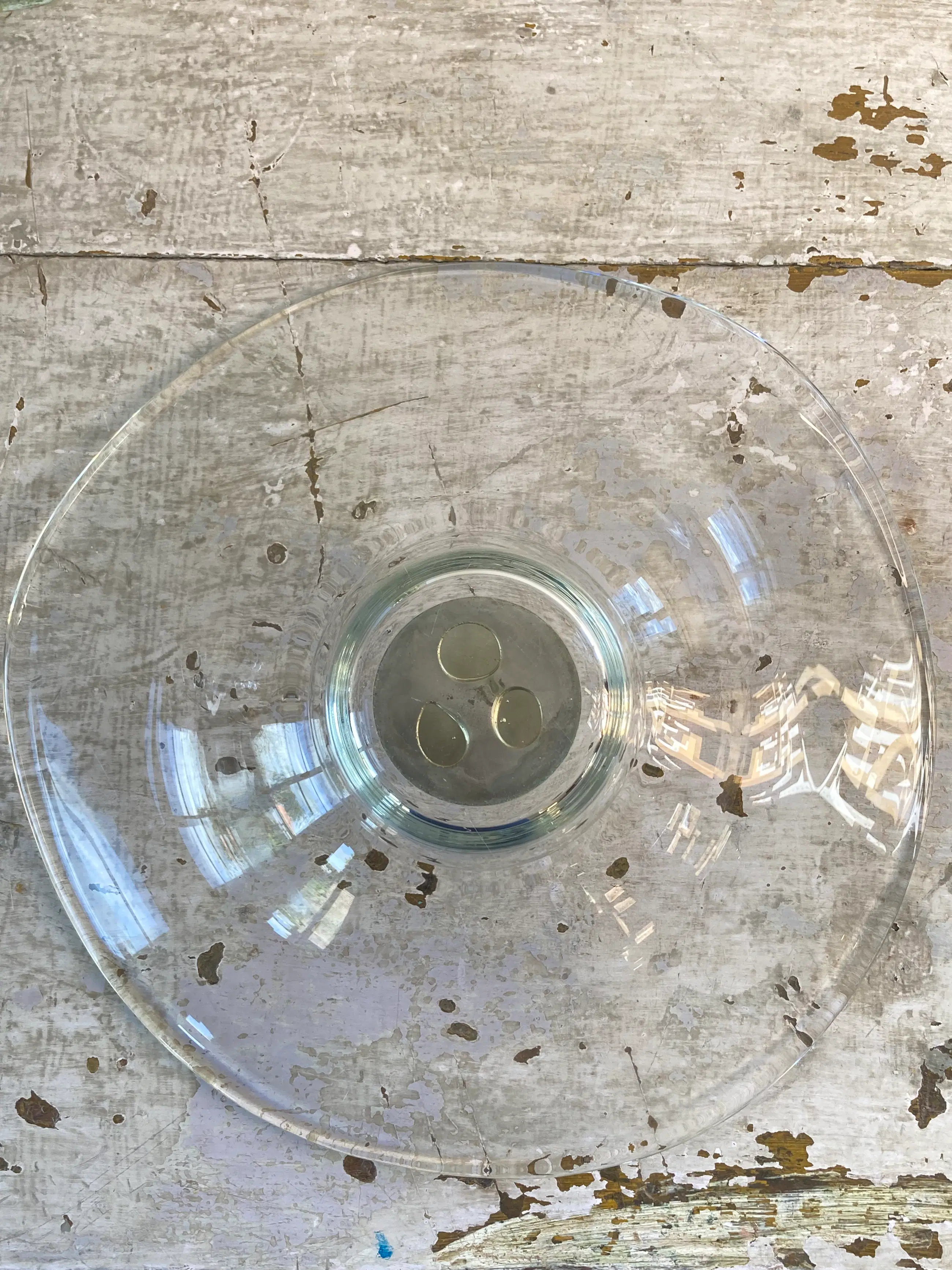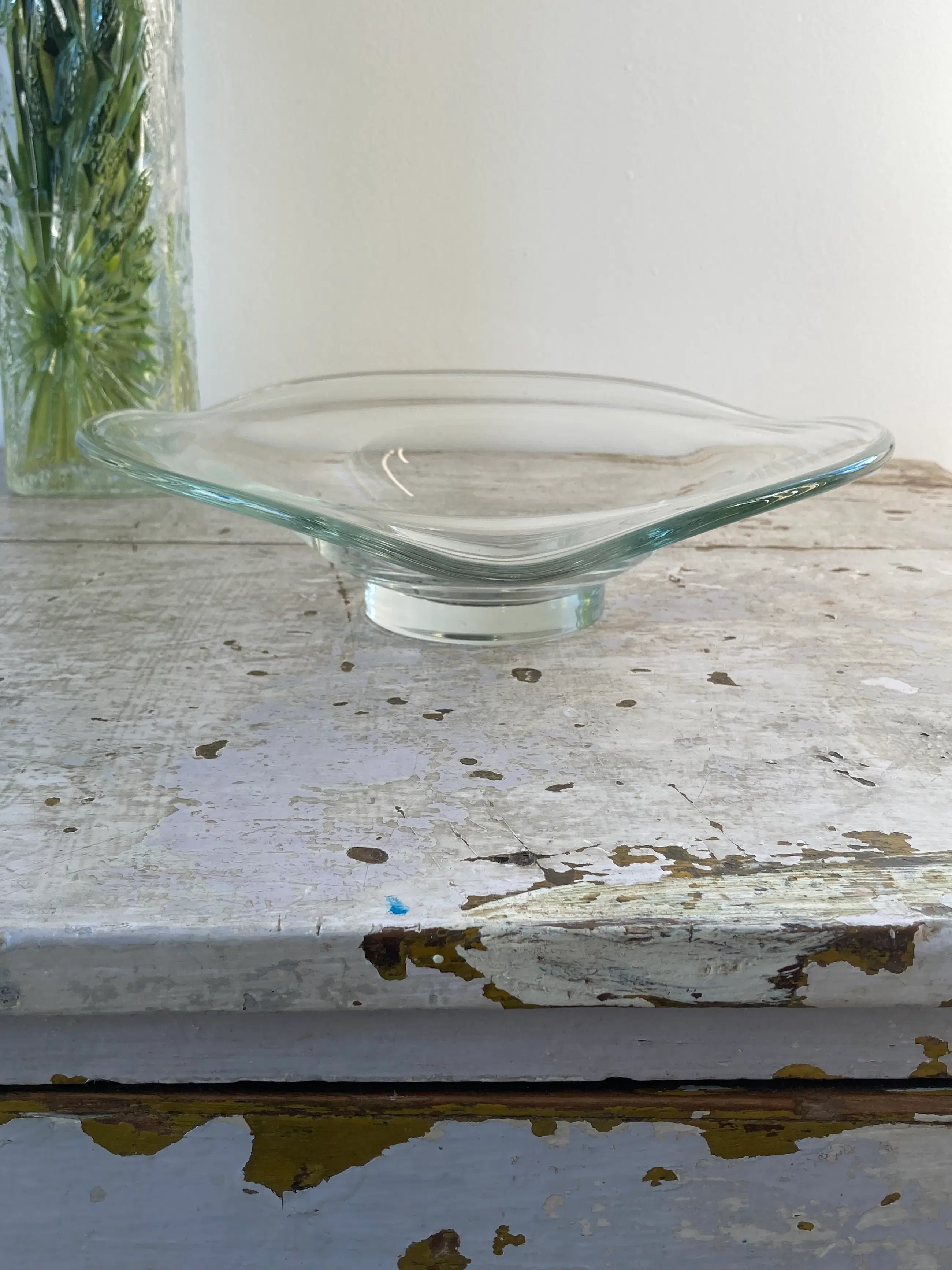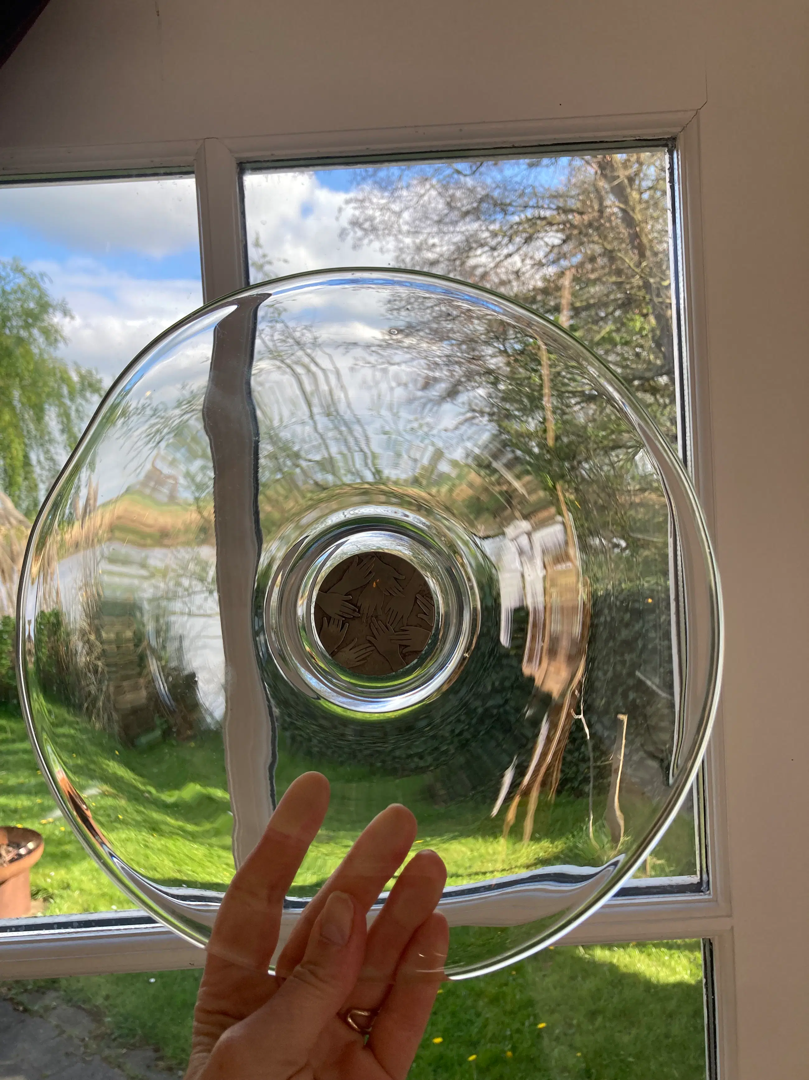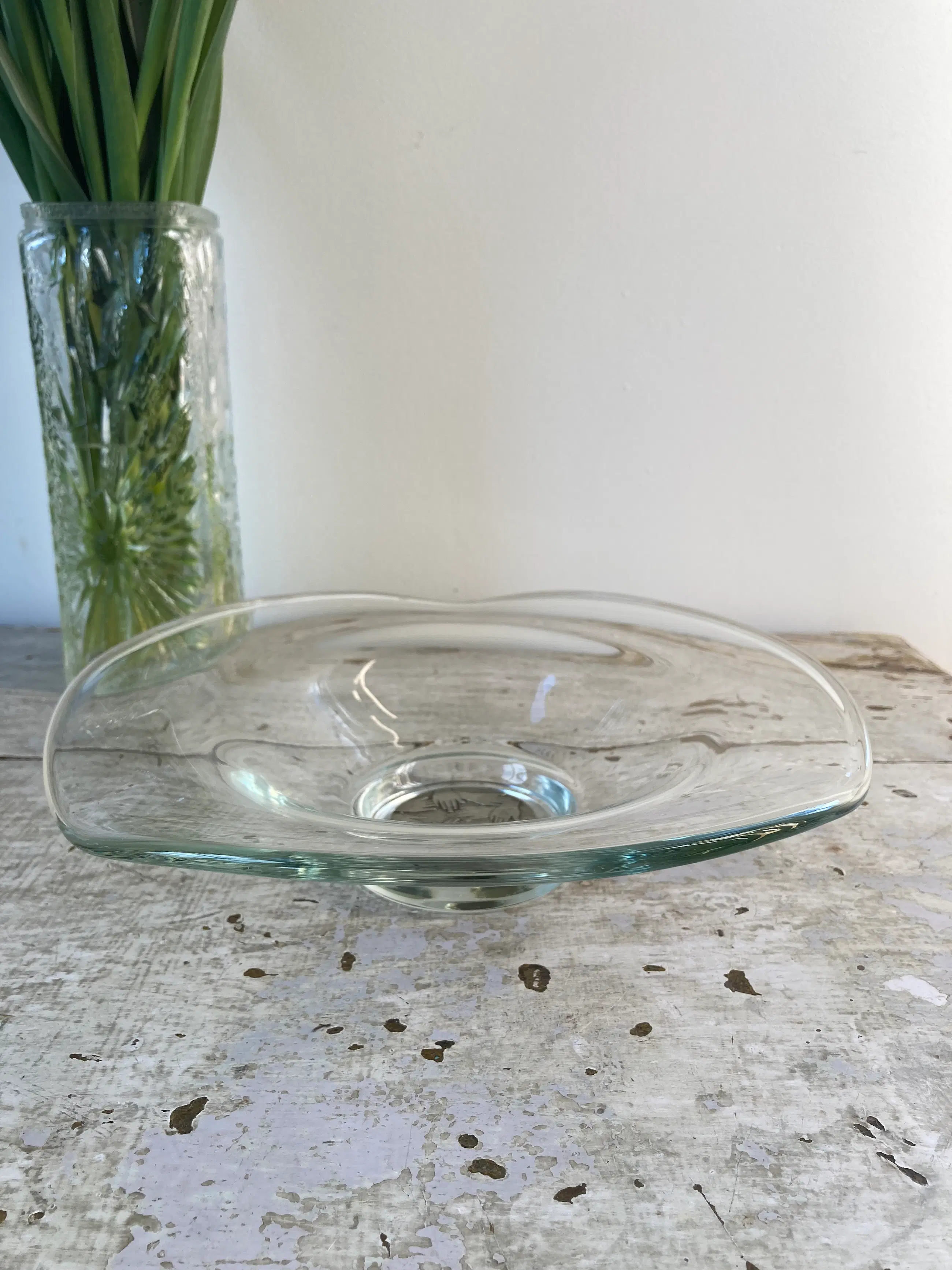 Mooie gewelfde glazen schaal, ontworpen door Frans Steginga. De schaal heeft een diameter van 25cm en is ca. 6 cm hoog. In het midden van de schaal is een verzilverde medallion, die ' helpende handen voorstelt. De titel van de schaal is dan ook" De helpende hand". Het werk van Frans is zowel abstract als figuratief. Hij vind kunst een communicatiemiddel dat geen extra uitleg nodig heeft. De esthetiek speelt een belangrijke rol.