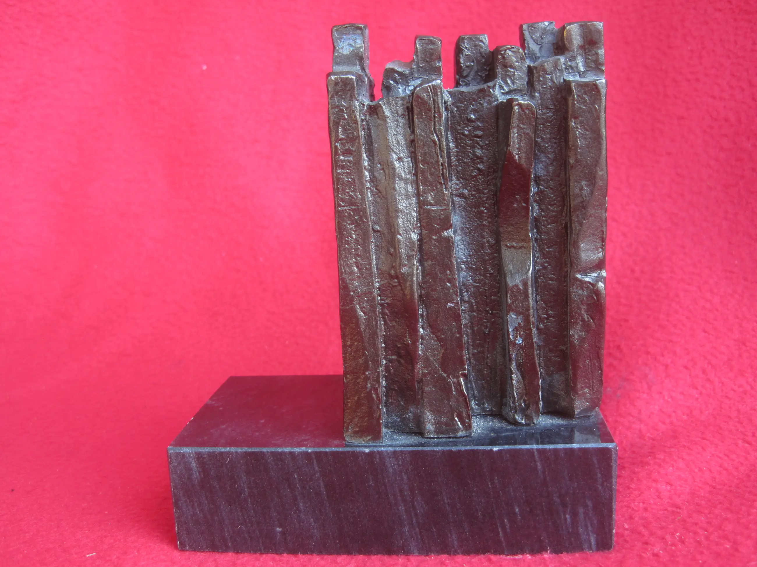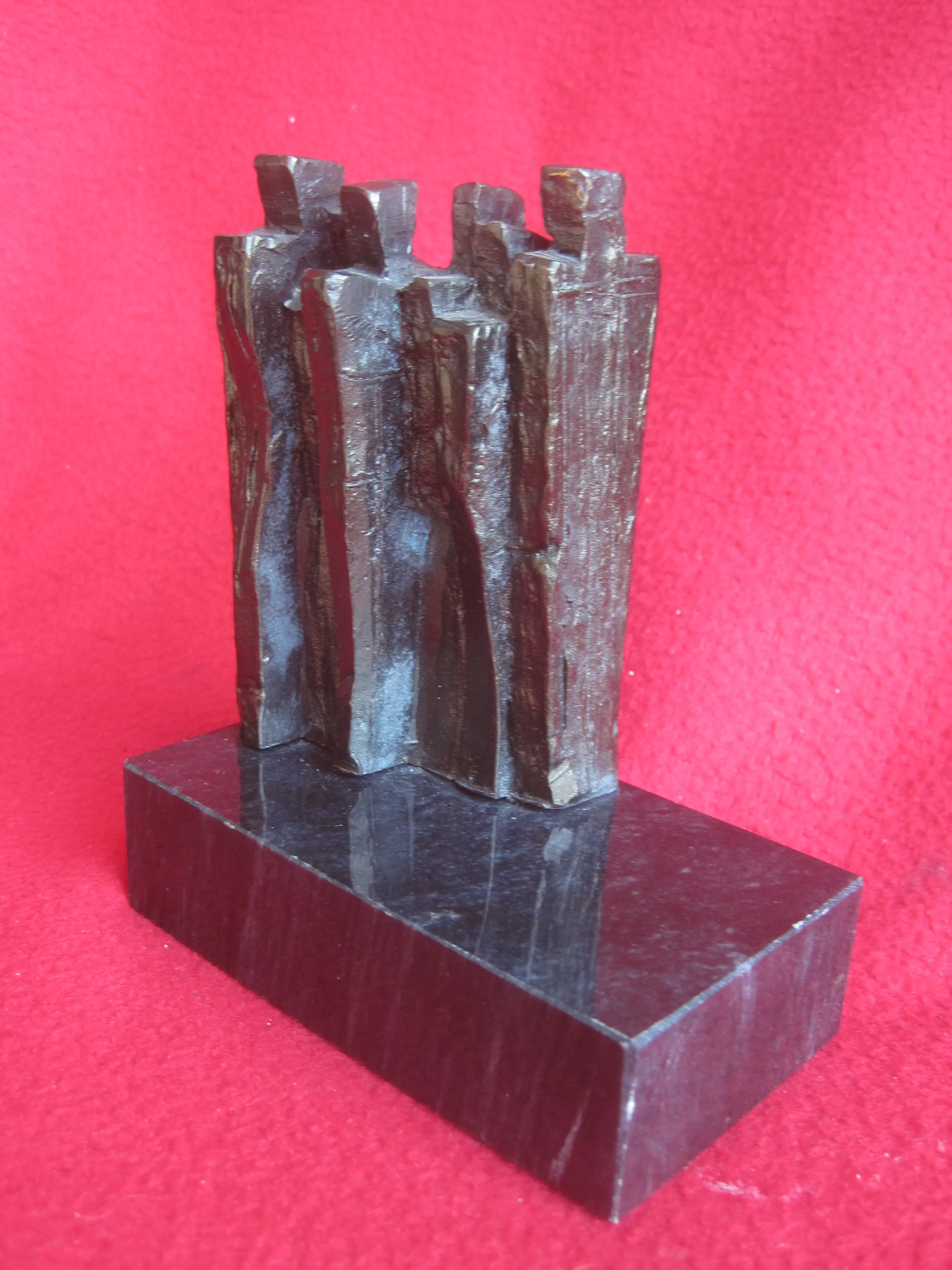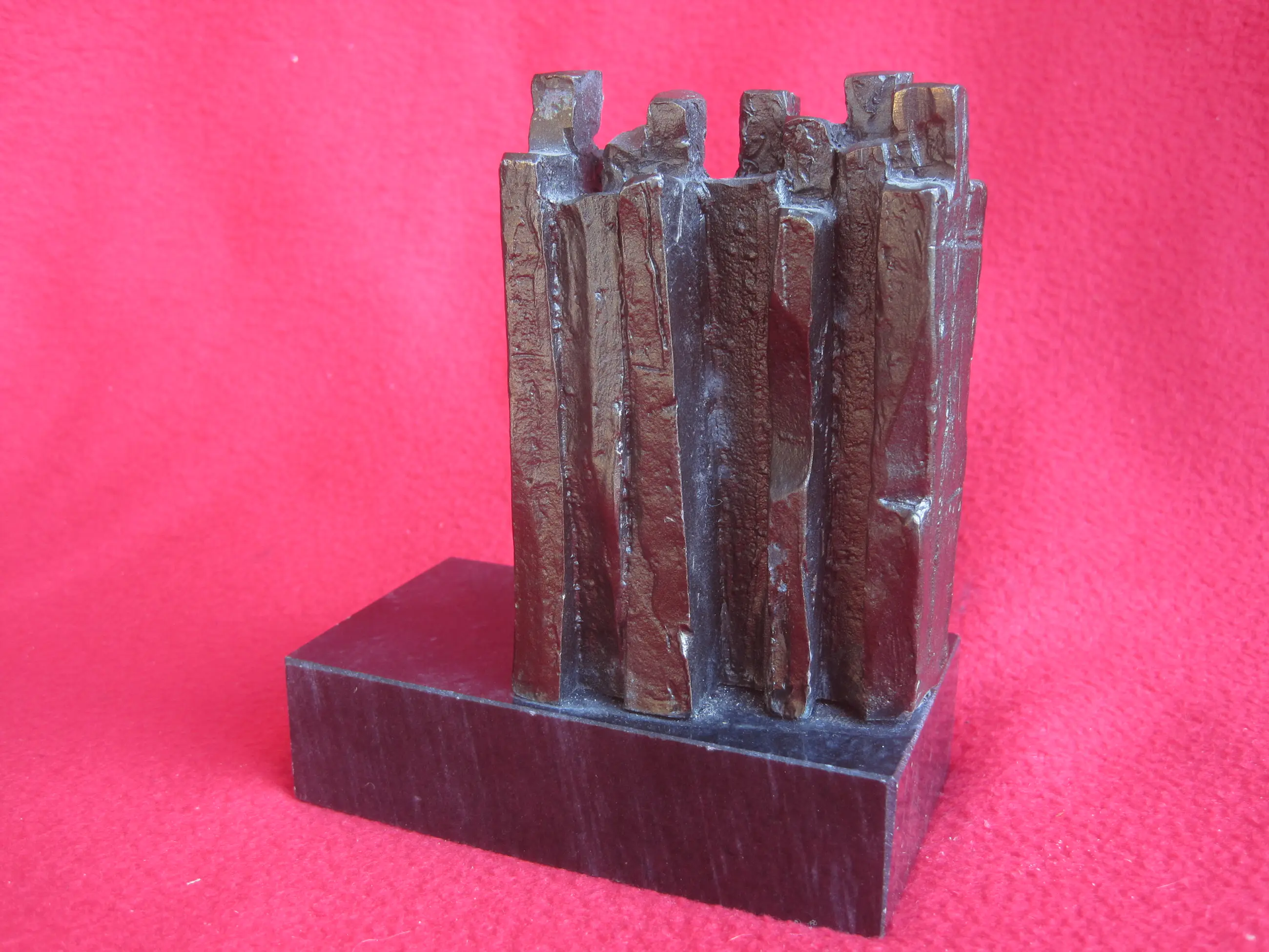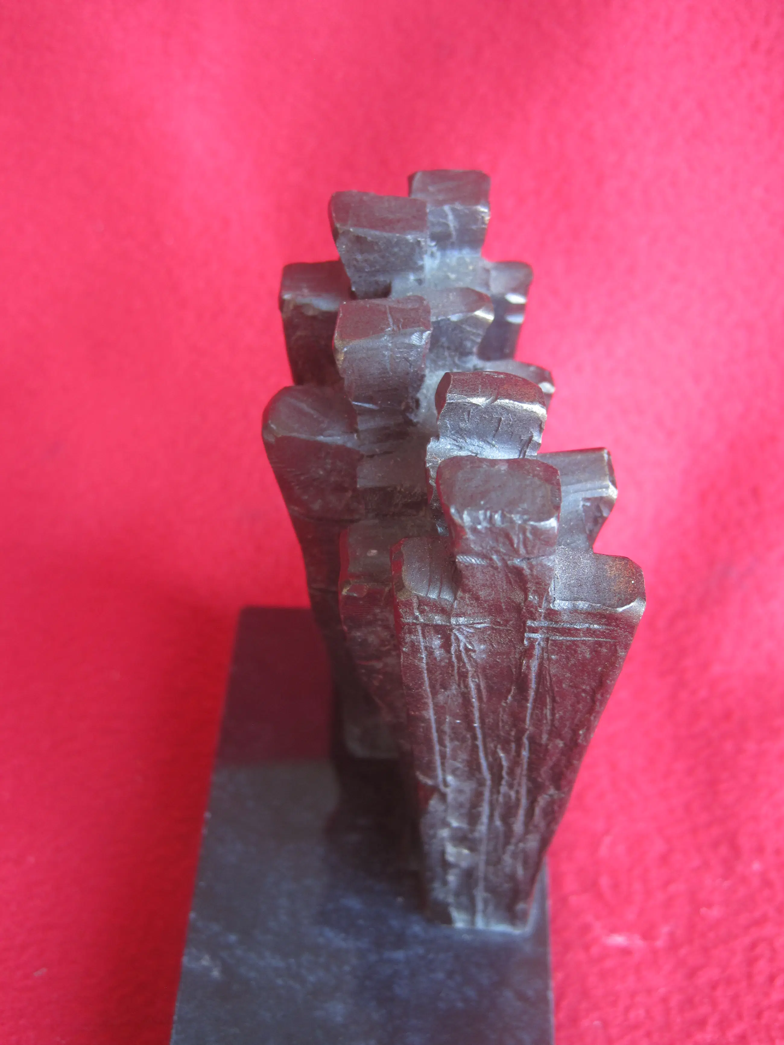 Stoer abstract beeldje van een groep mensen die als één blok achter elkaar staan. De totale hoogte is 13 cm inclusief de marmeren sokkel. Een heel herkenbaar beeldje door Frans Steginga.