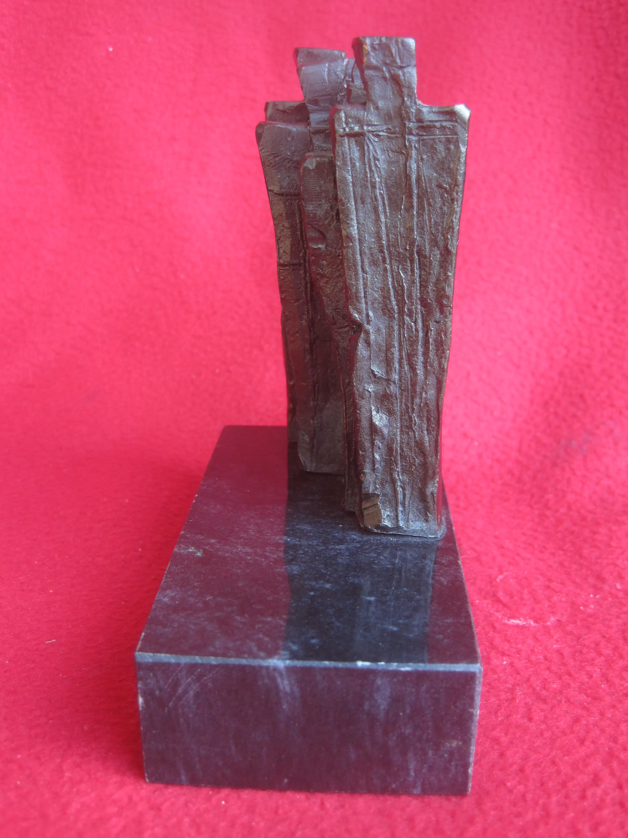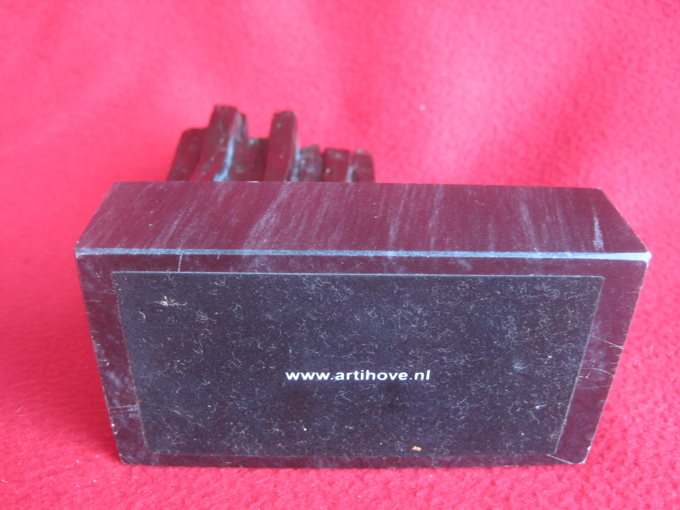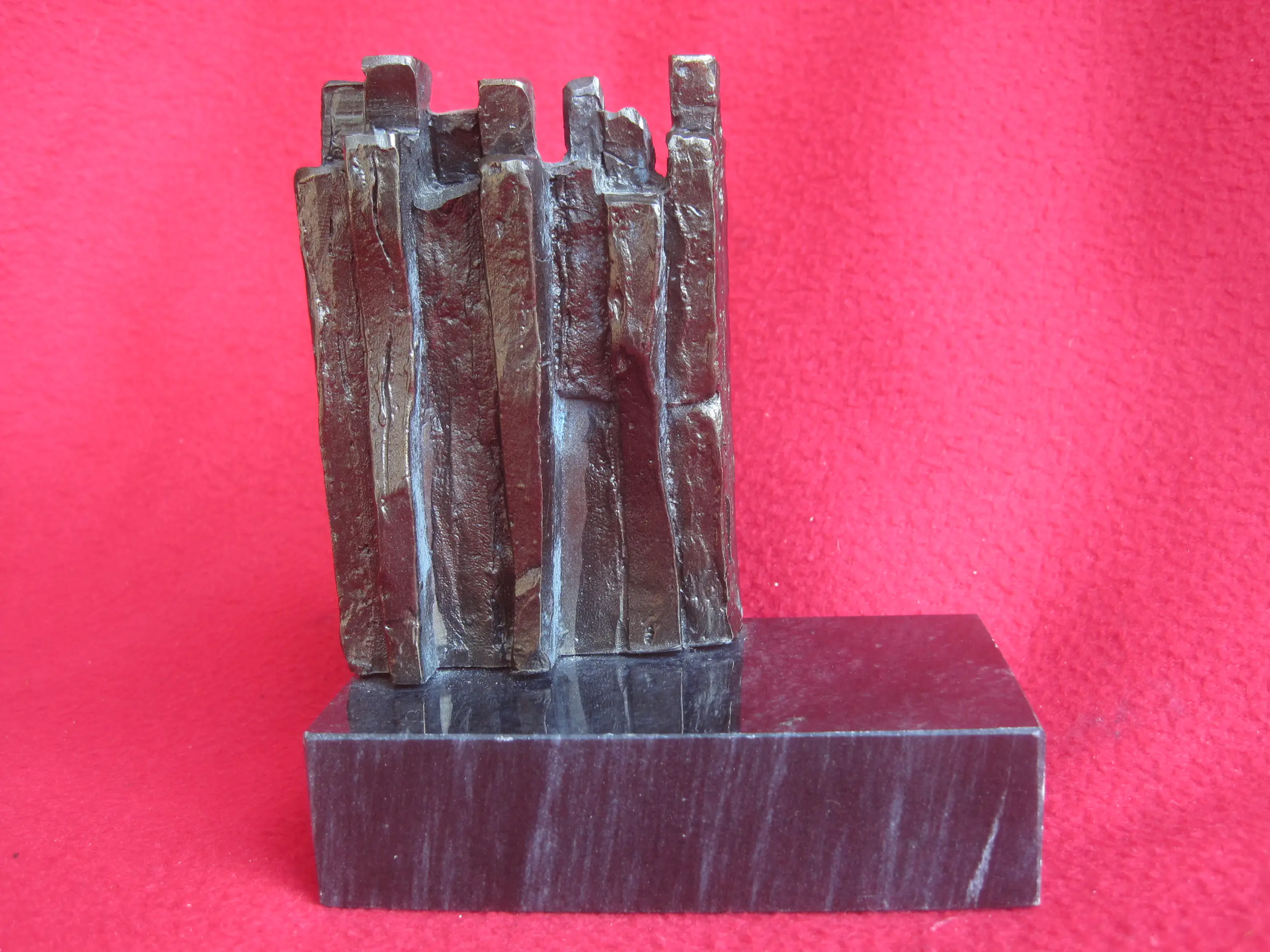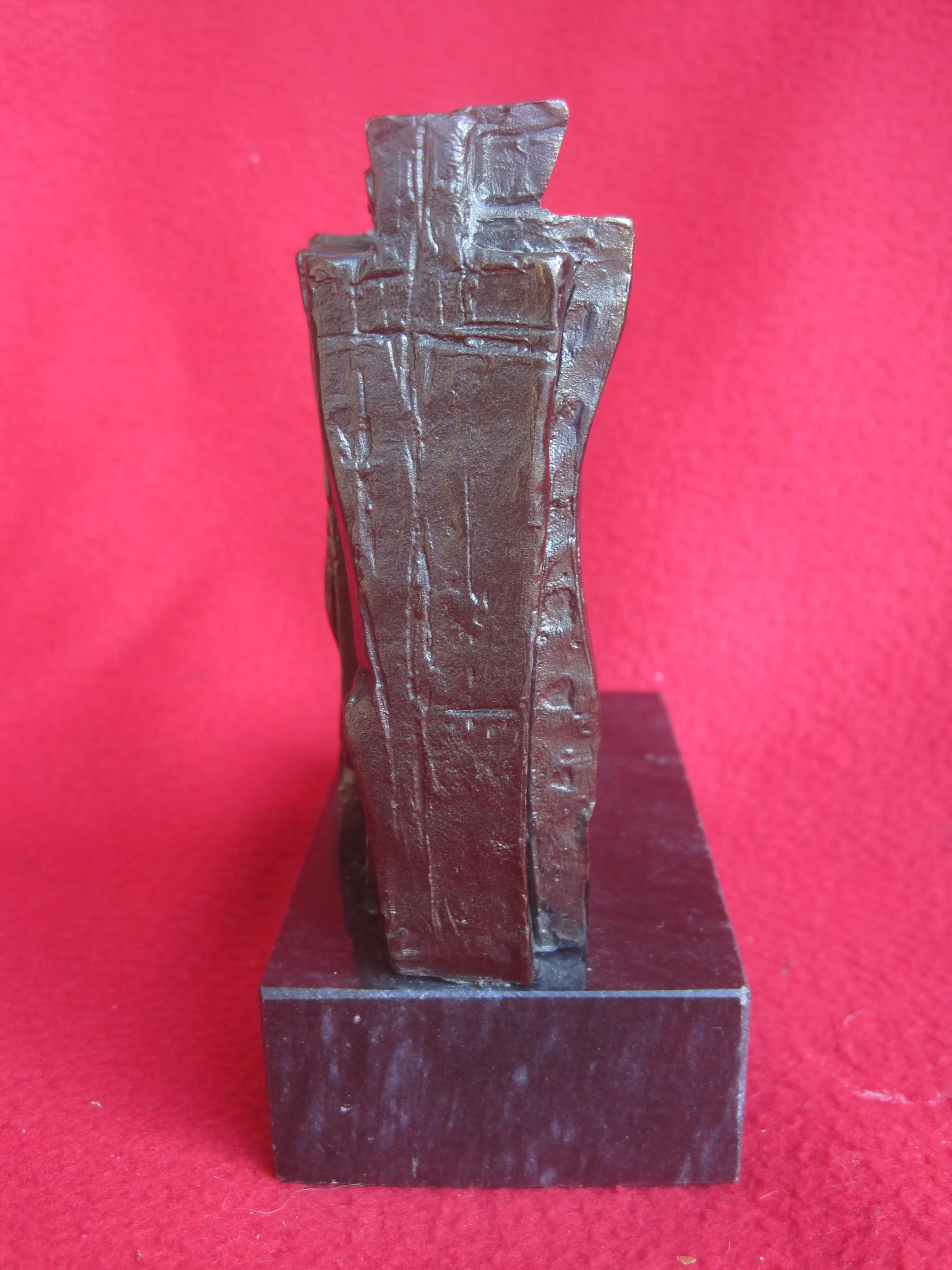 Stoer abstract beeldje van een groep mensen die als één blok achter elkaar staan. De totale hoogte is 13 cm inclusief de marmeren sokkel. Een heel herkenbaar beeldje door Frans Steginga.