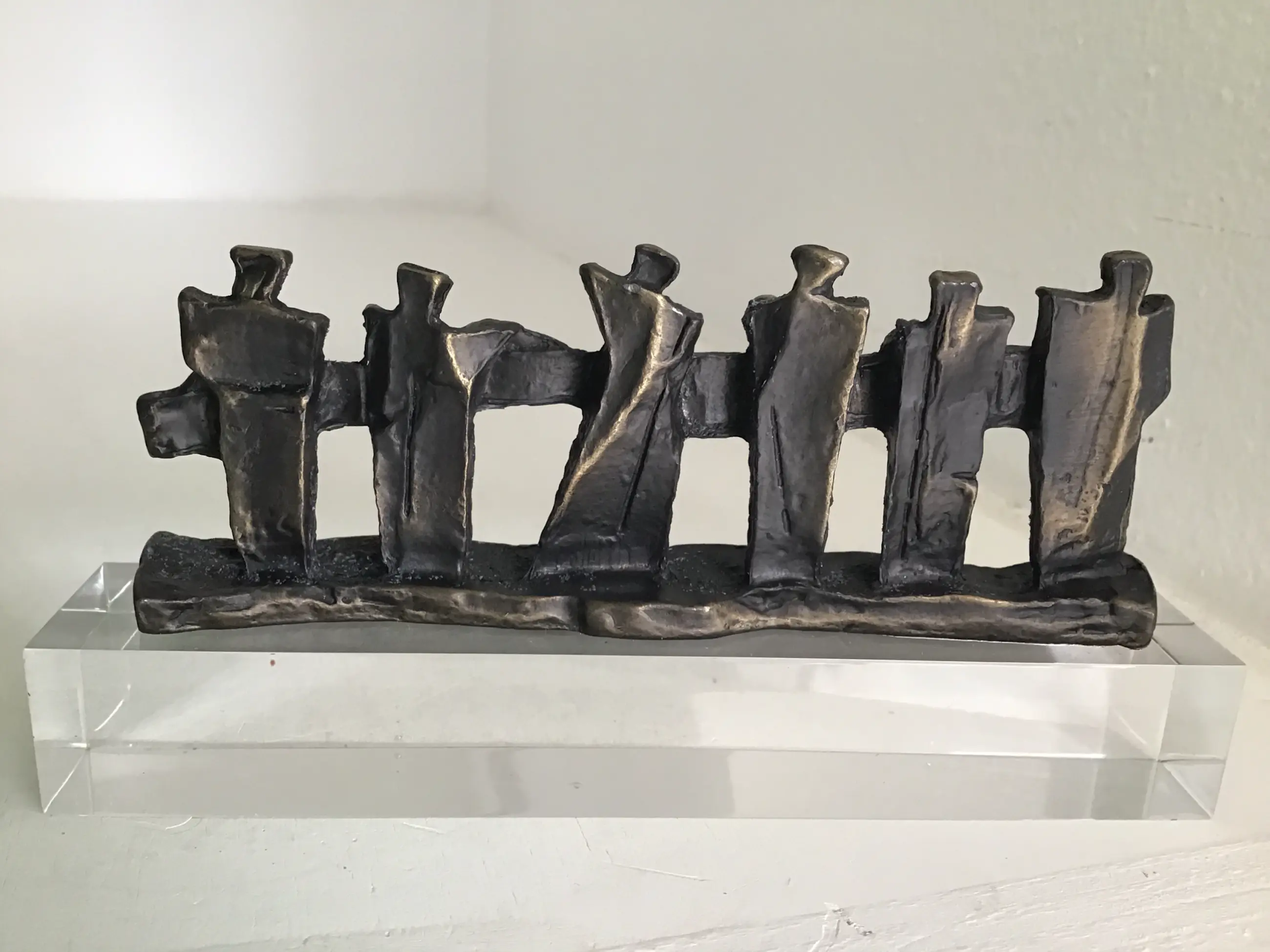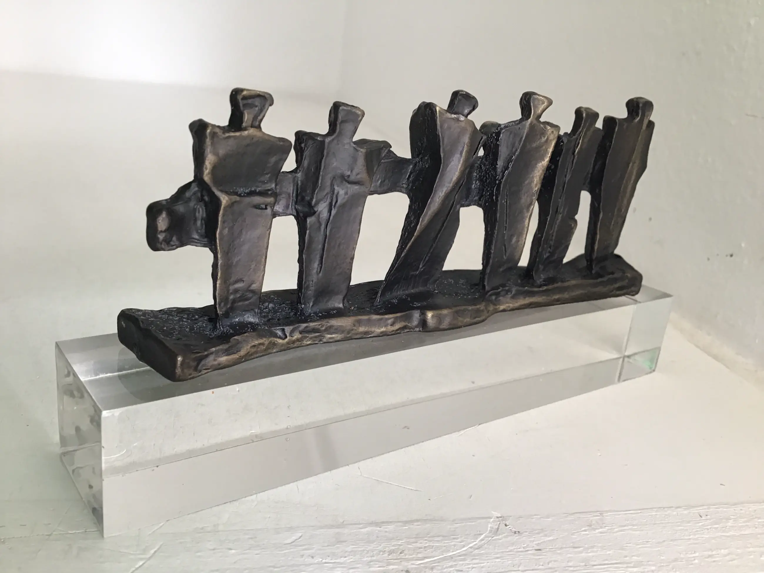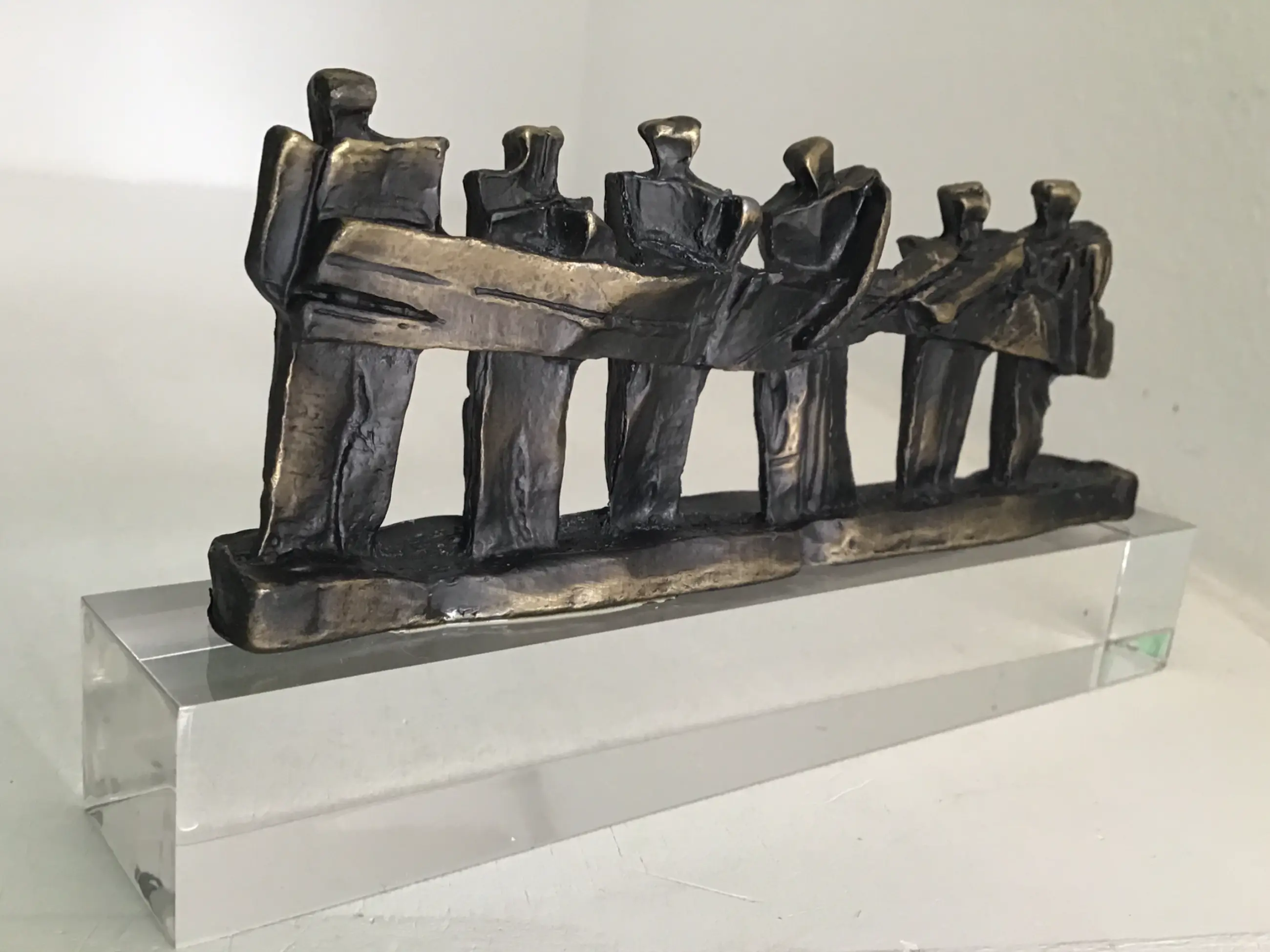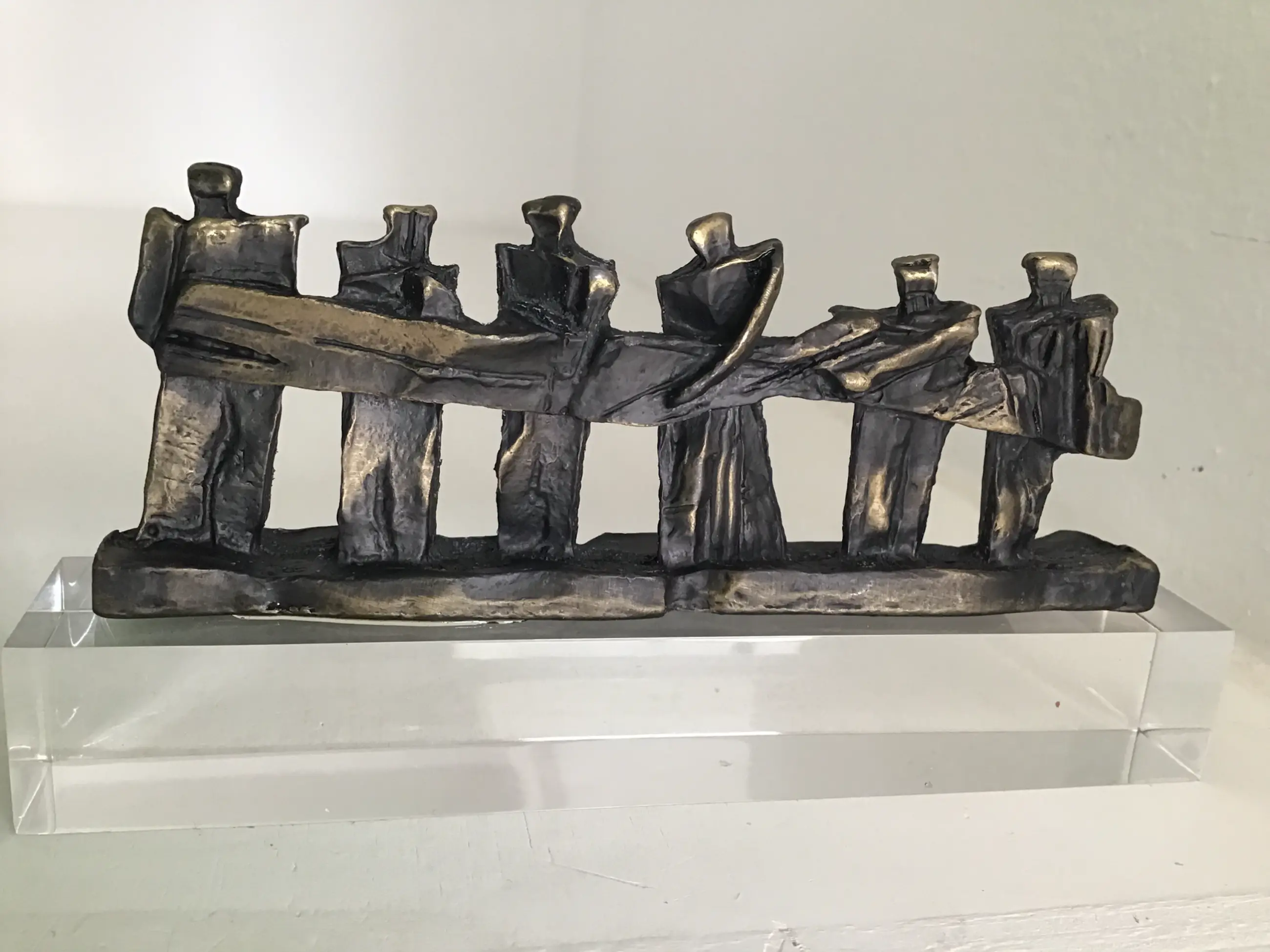 Krachtig en symbolisch sculptuur van de bekende kunstenaar Frans Steginga. Titel “ Samen de zaak van de grond tillen “ Het beeld is gesigneerd: FS Materiaal: verbronsd metaal op massieve plexiglas voet. Het sculptuur verkeert in goede staat en wordt zorgvuldig verpakt en aangetekend verzonden.