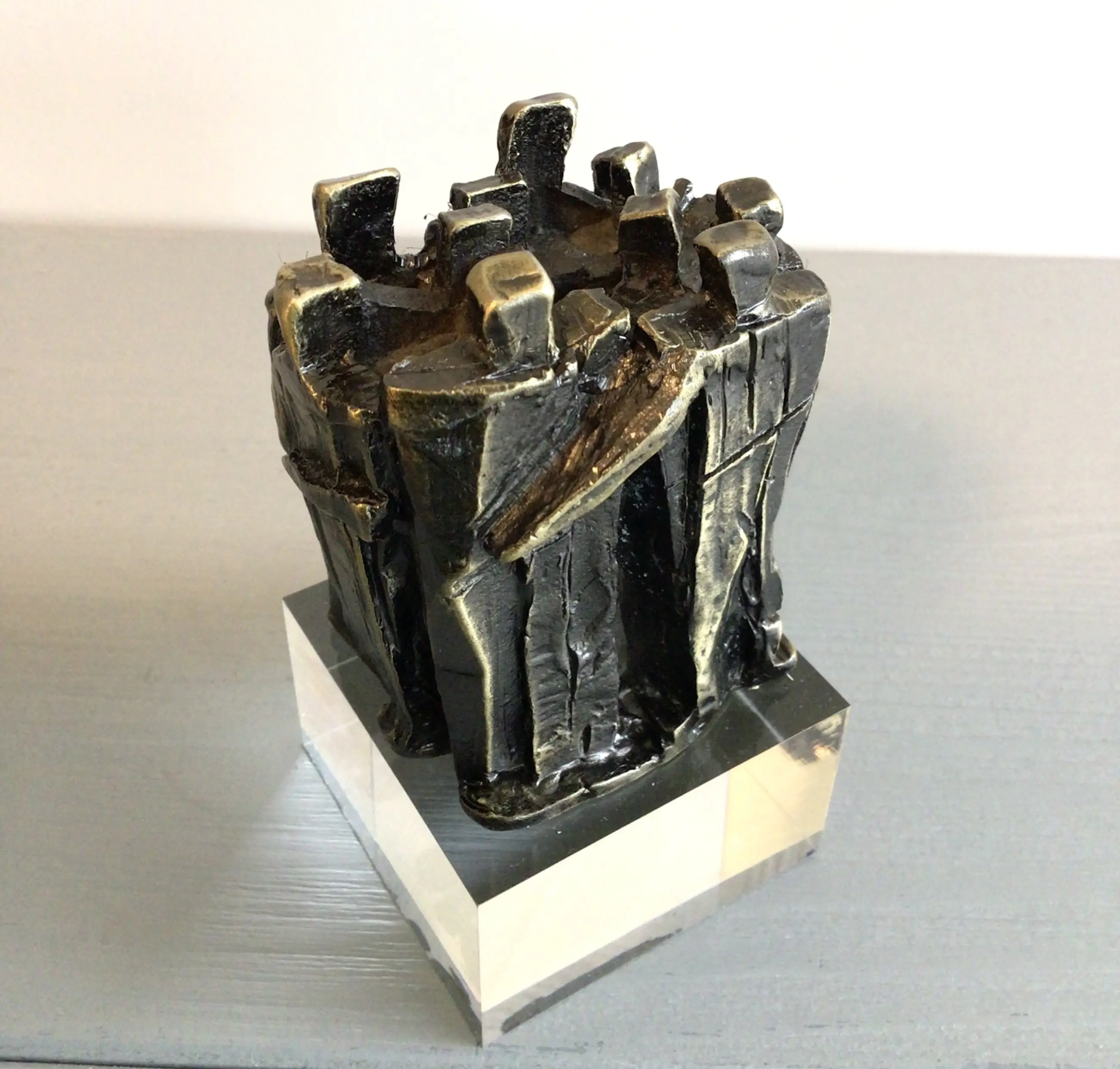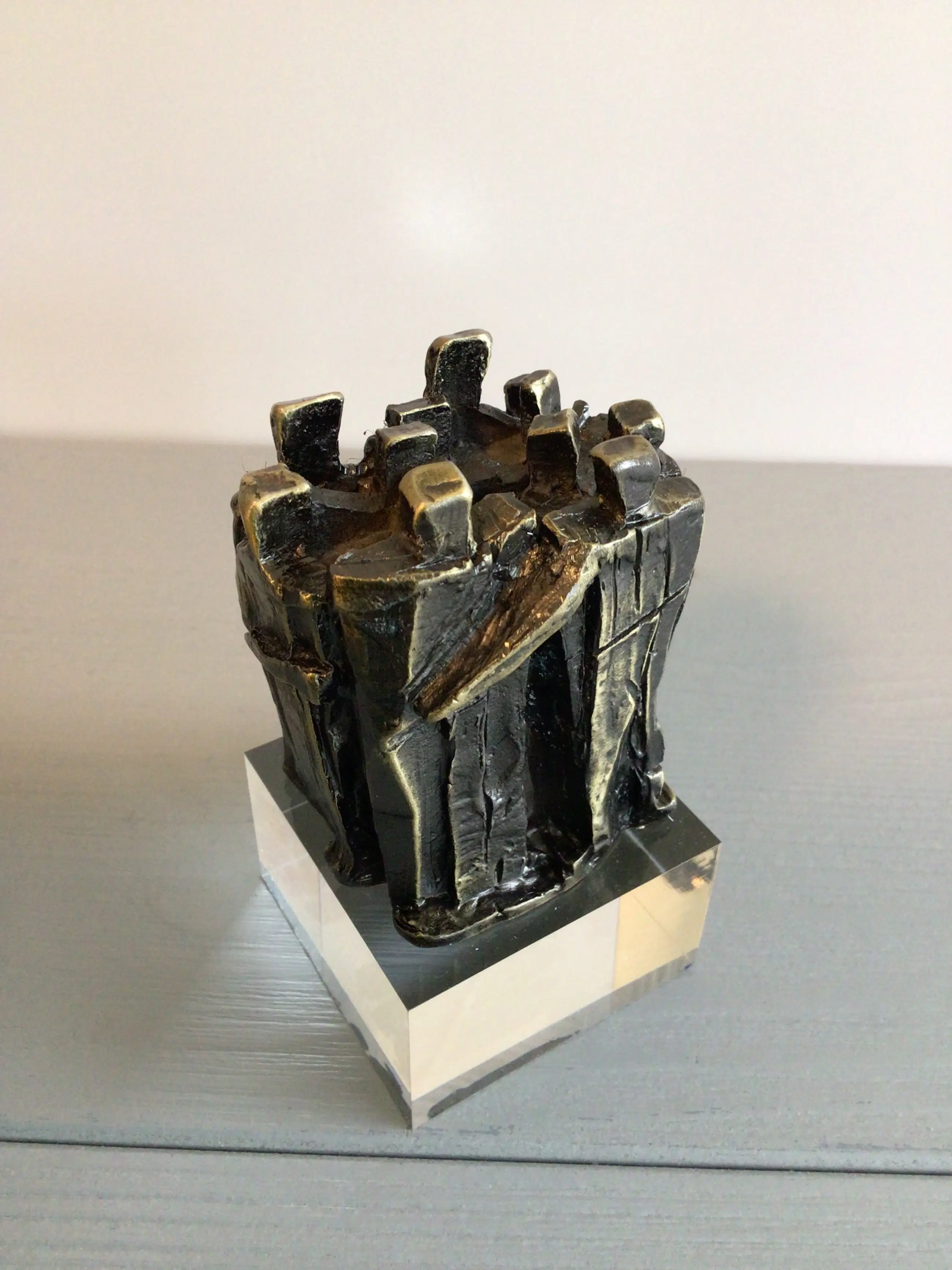 Zeer fraai vormgegeven sculptuur dat kracht en samenwerking uitbeeldt. Kunstenaar: Frans Steginga Titel “ Gebundelde kracht “ Achtergrondgedachte “ Door eenheid van kracht kunnen wij veel voor elkaar betekenen “ Hoogte : 10 cm Materiaal: legering op kunststof sokkel. Wordt geleverd inclusief originele doos. Het beeld verkeert in zeer goede staat en wordt zorgvuldig verpakt verzonden