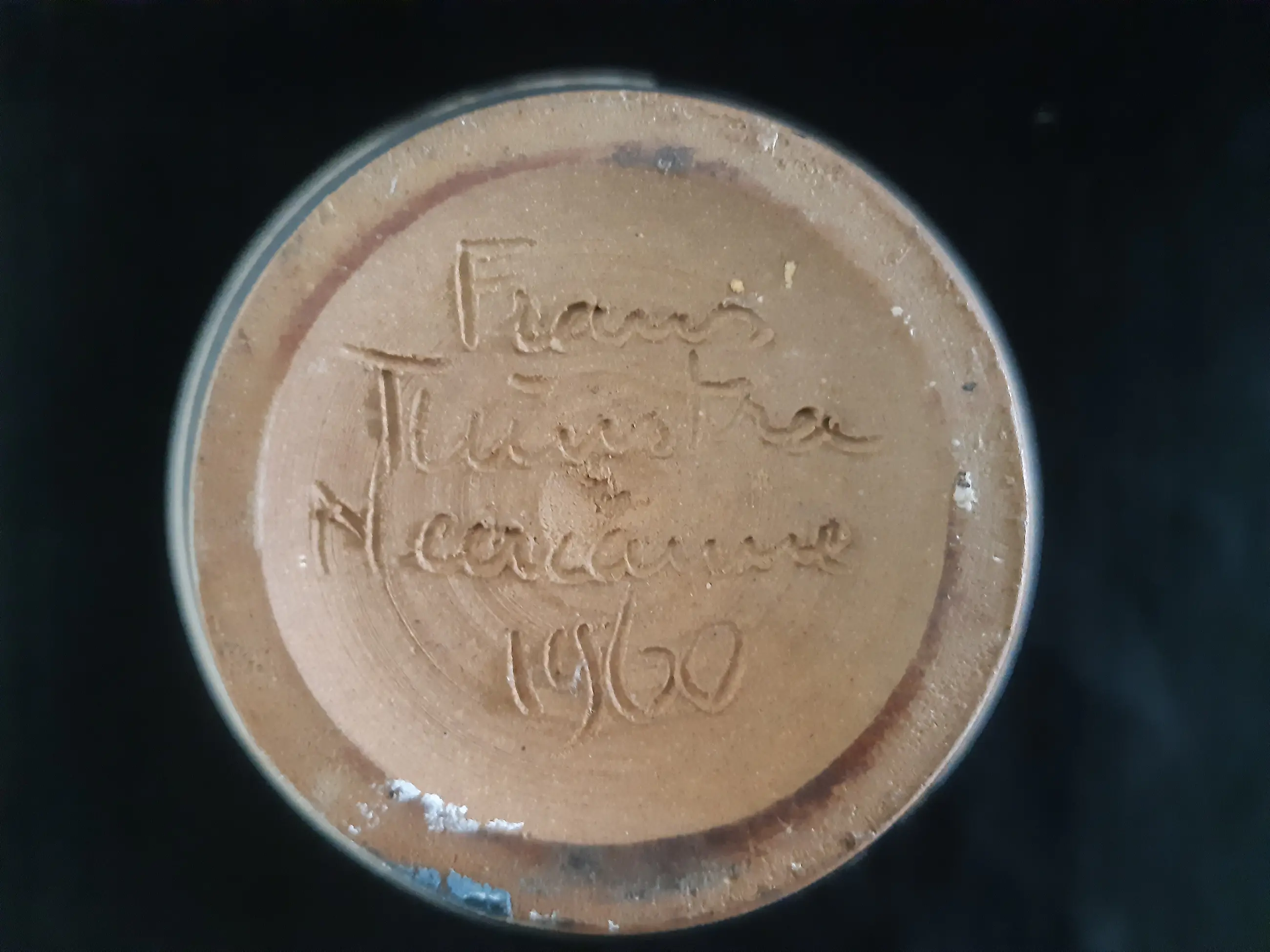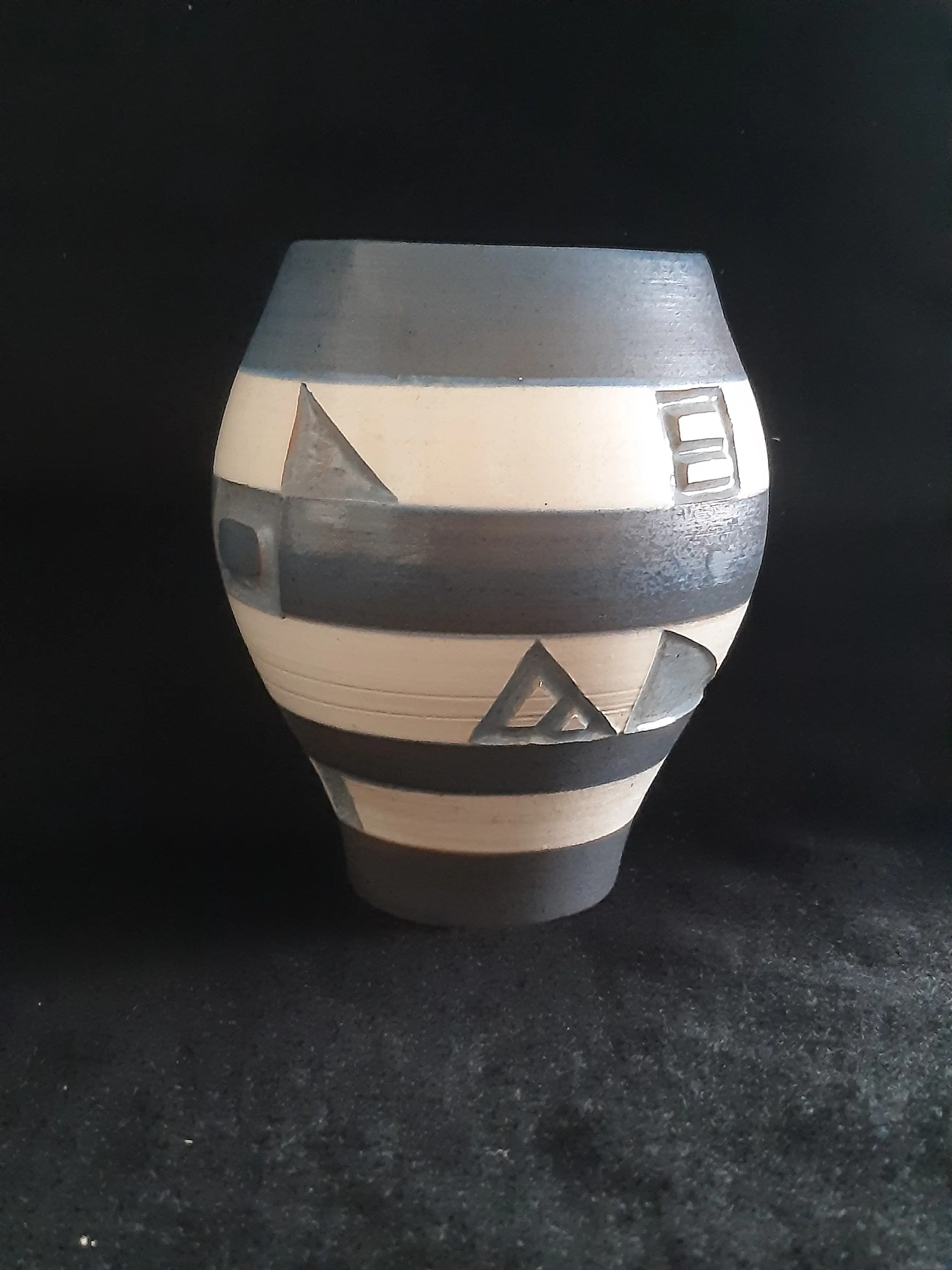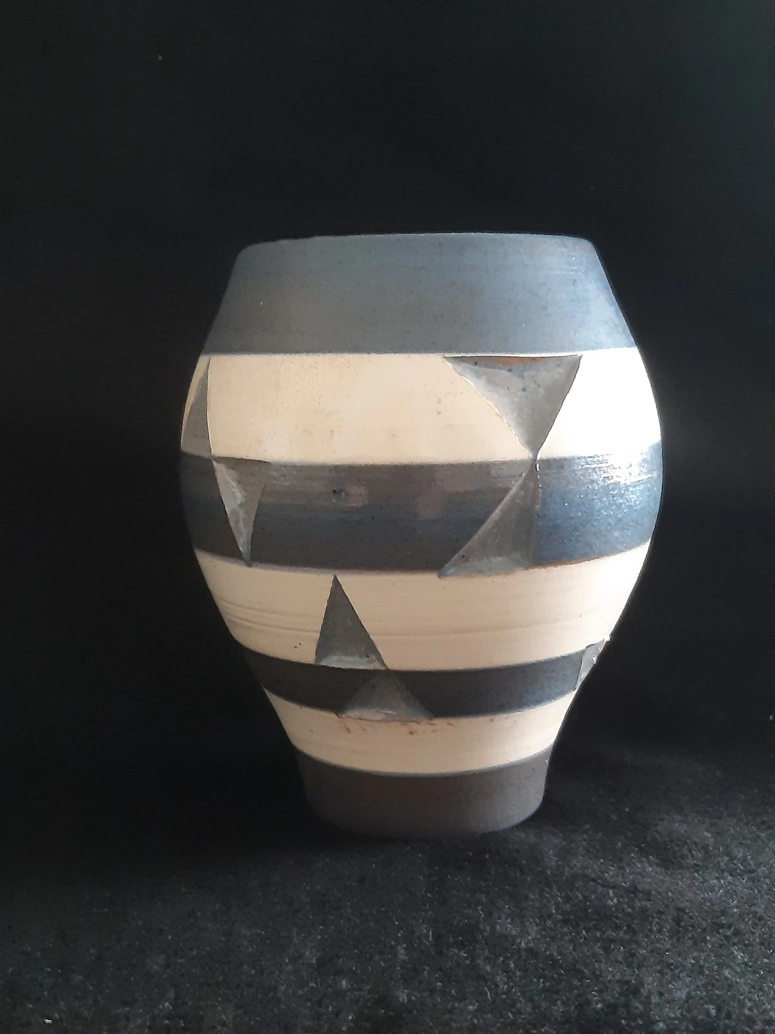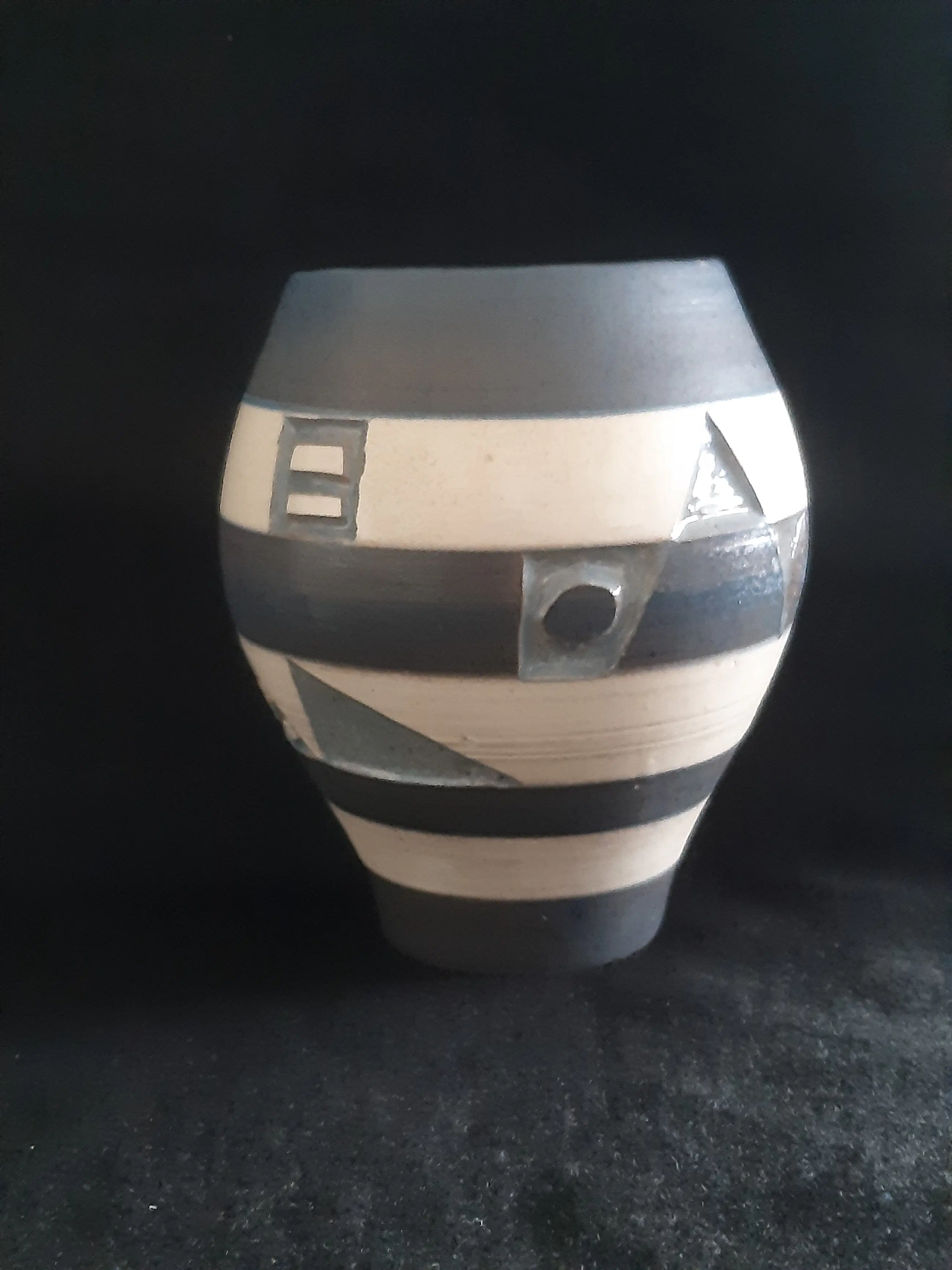 Handgedraaide vaas, gedecoreerd via de sgraffito techniek waarbij de met de hand uitgesneden geometrische figuren blauw geglazuurd afgewerkt werden. De vaas heeft verder rondom een afwisselend blauwe en beige mattere glazuur en een bruine engobe. De binnenkant van de vaas is blauw geglazuurd, vergelijkbaar met deze van de geometrische figuren. Het vaasje bevindt zich in zeer goede vintage conditie, geen chips, haarlijnen of beschadigingen zichtbaar. Met de hand gemerkt Frans Tuinstra, Neercanne, 1960.