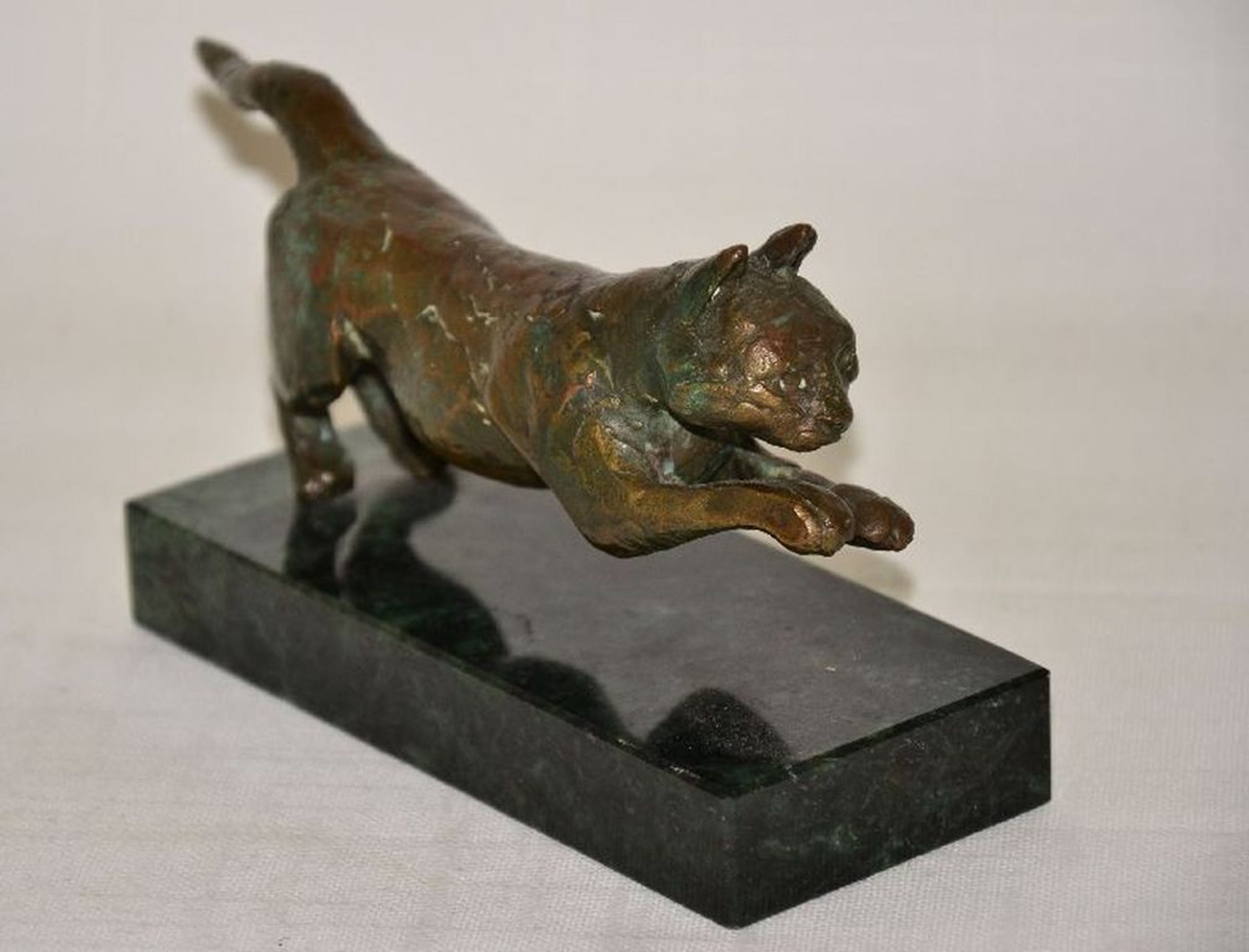 Mooi massief, vrij zwaar bronzen beeldje van een Katachtige. Op marmeren voet.