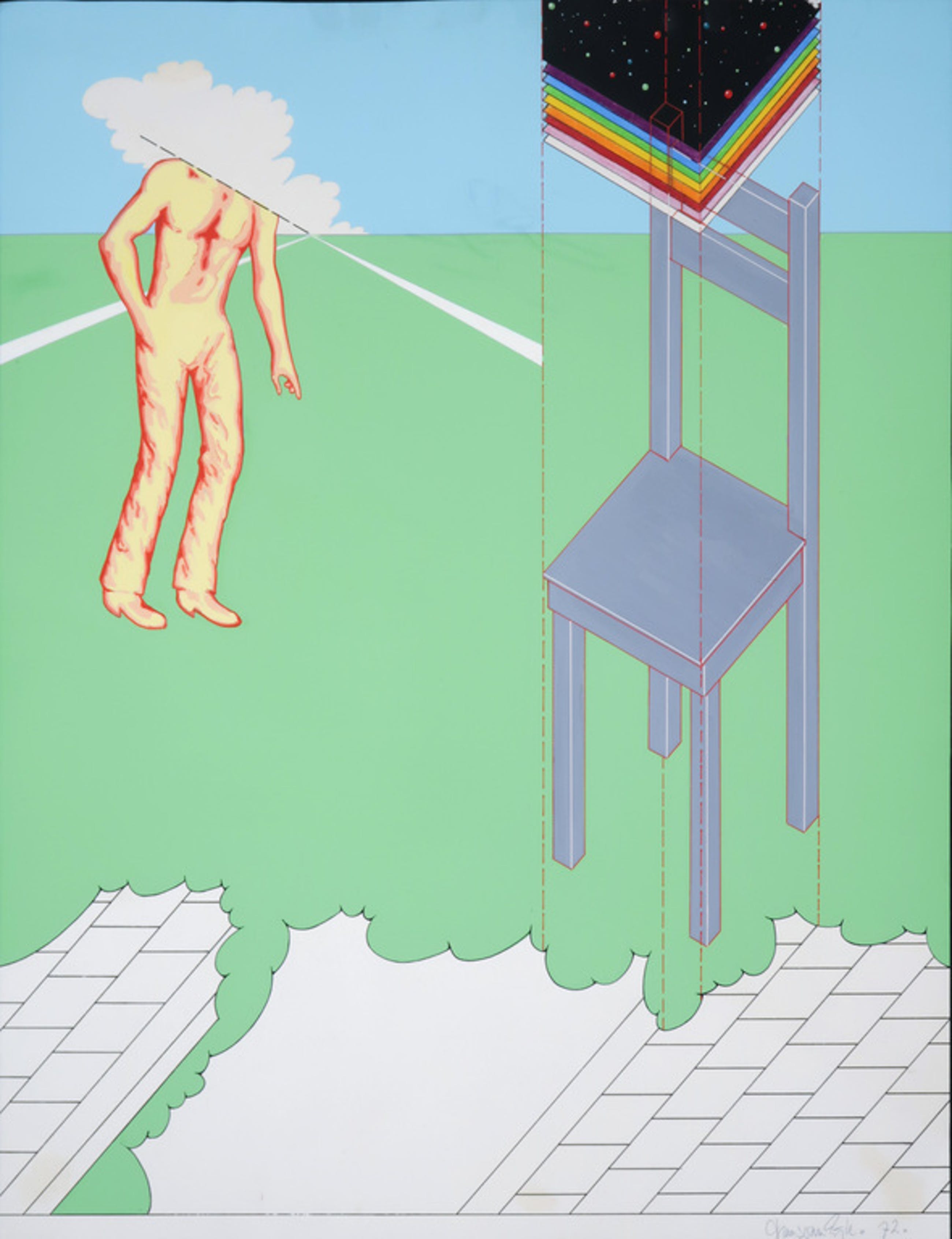 Conditie: In zeer goede staat. Rechts in het midden zit een kras in het 'stoeltje'. Bovenaan in het midden en aan de linkerzijde zitten enkele lichte vegen door het groen en blauw. In het blauw linksboven zitten enkele kreukels in het blad.