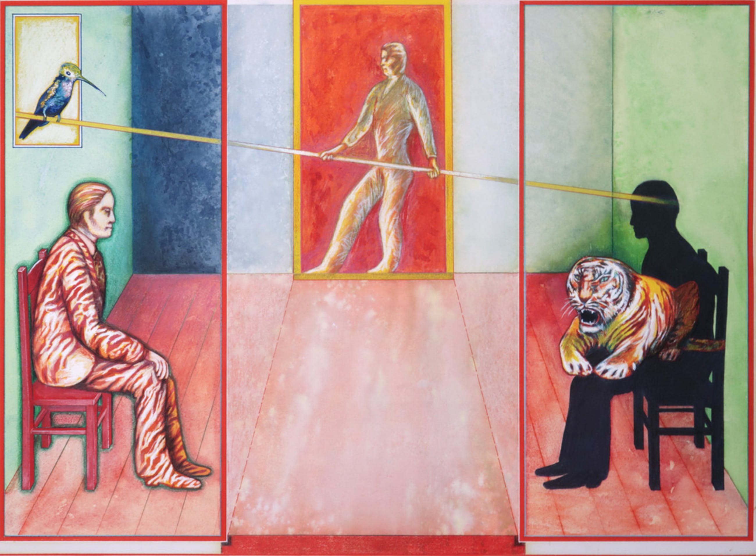 Materiaal: Gemengde technieken o.a. krijt, kleurpotlood, acryl en inkt op papier