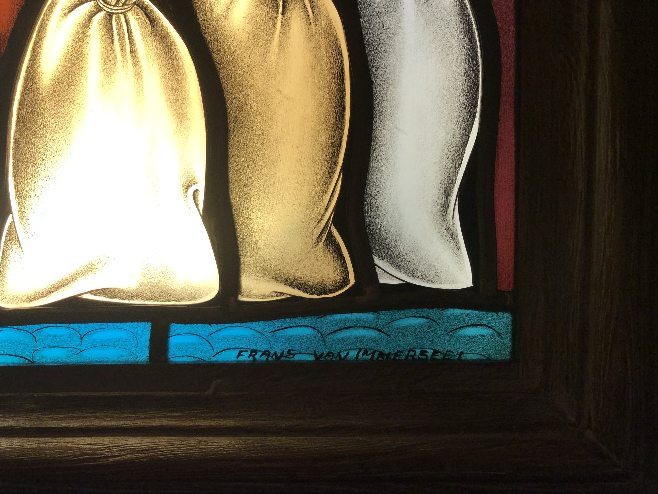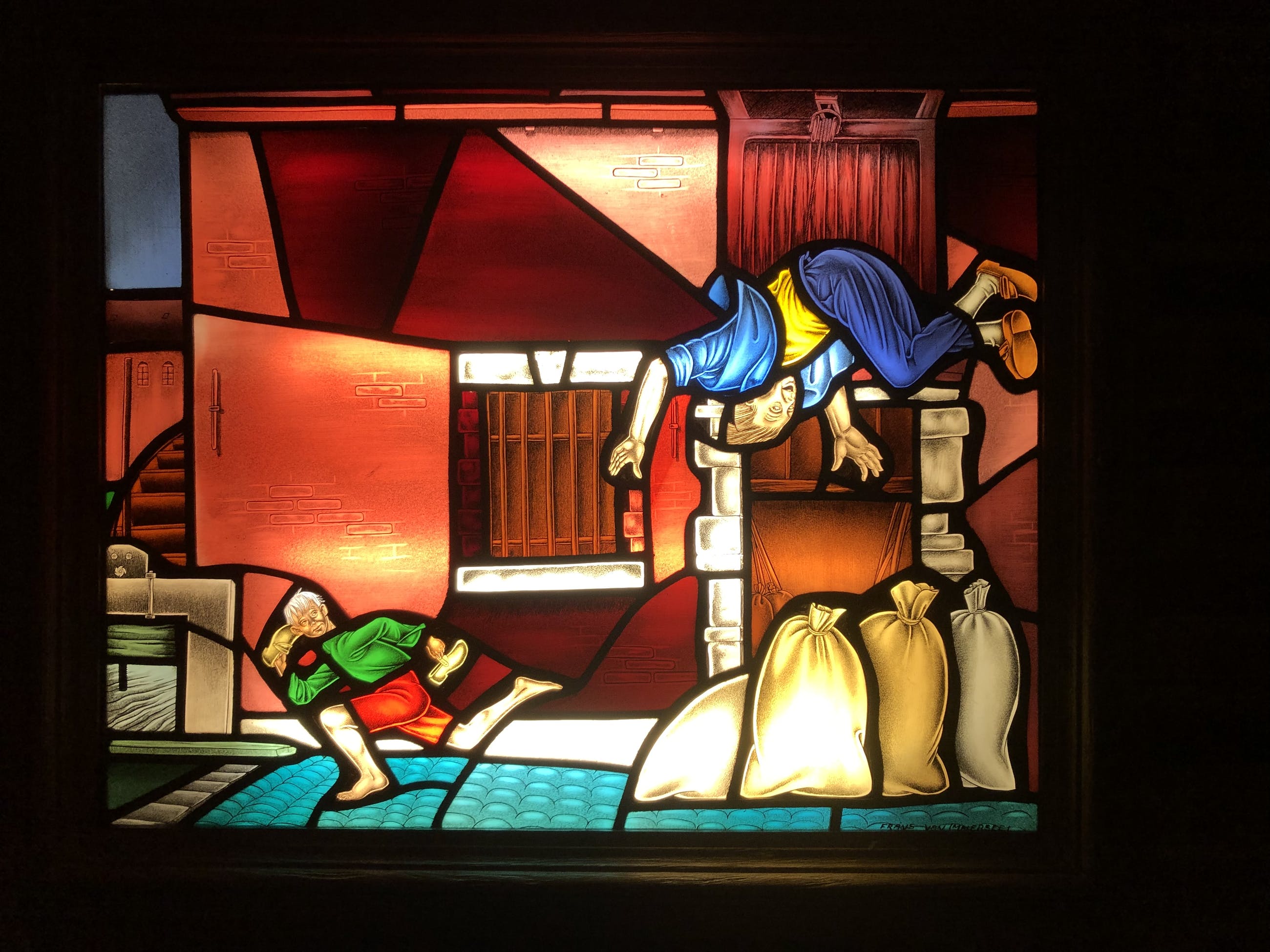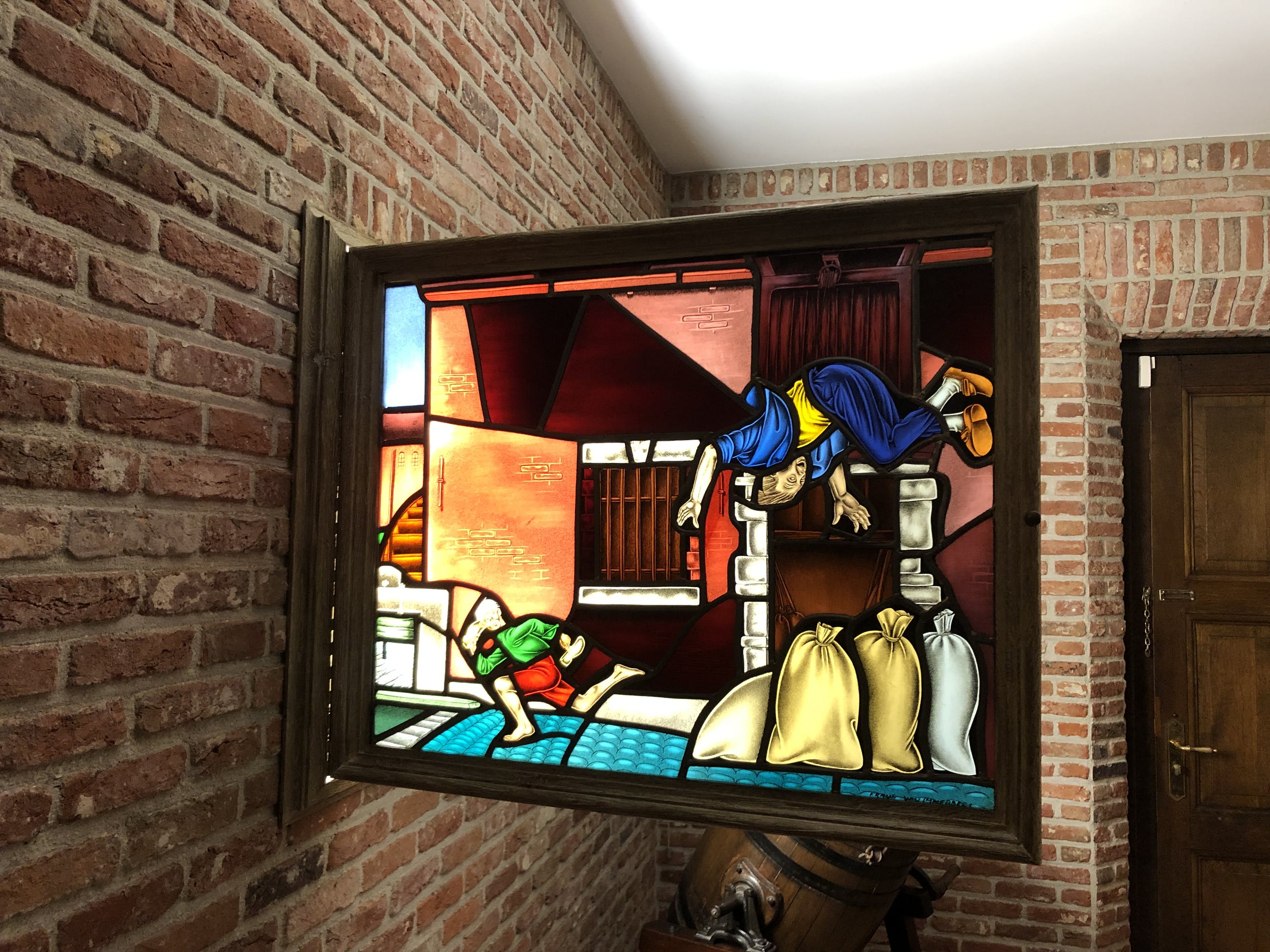 Glasraam van Frans Van Immerseel. ‘De Witte’ van Sichem (naar het bekende boek) neemt de molenaar beet en rent ervandoor. Ingekaderd in op maat gemaakt eiken frame. Lichtbak met perfect werkende tl lampen. Raam 76x59cm. Kader 94x78cm.
