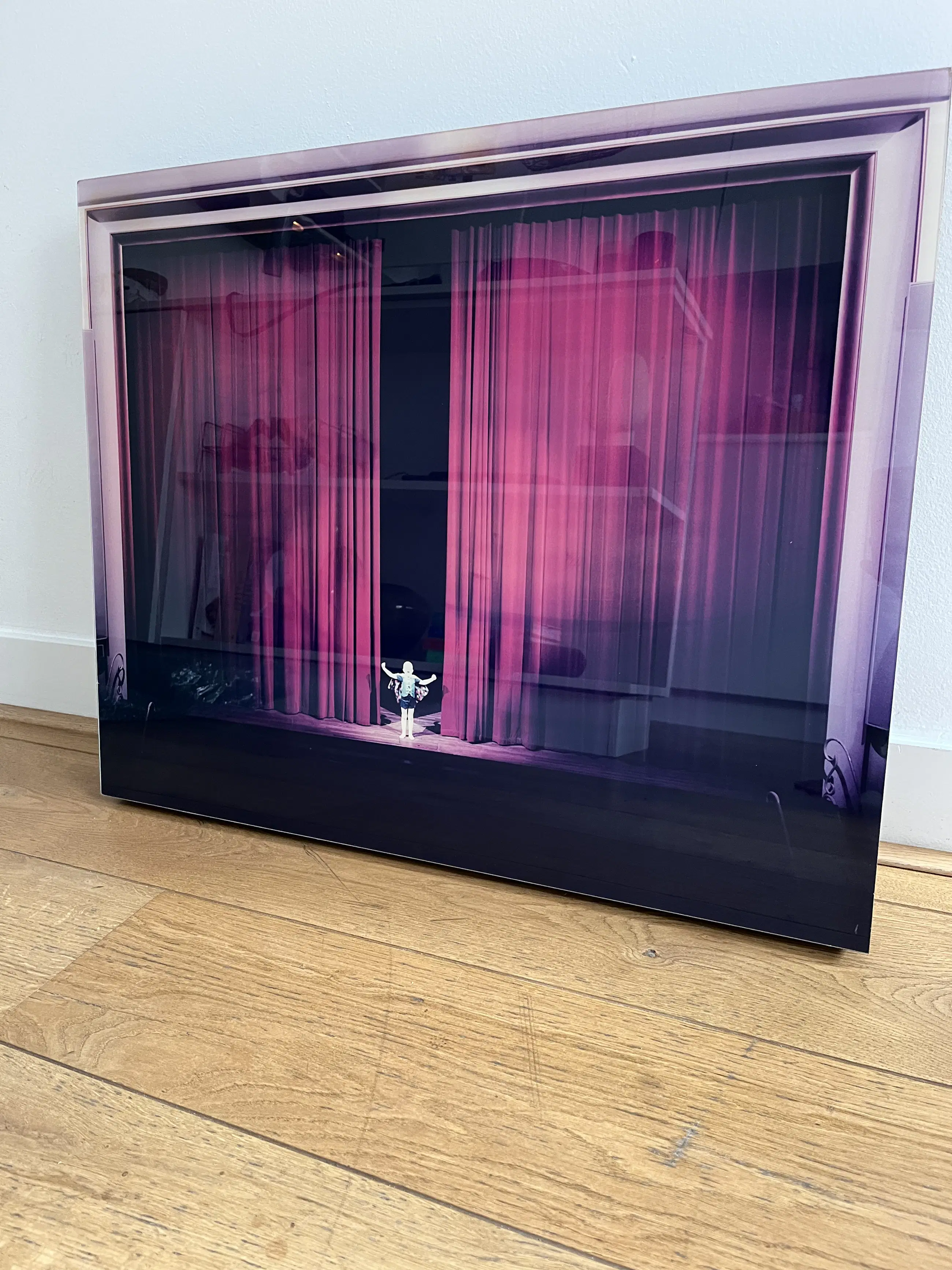 Fotografie kunstwerk van de fotograaf Frans van Lent. Beeld ziet een theater met een (heldhaftig) kind op het podium in een gek kostuum. Voorzijde heeft een hoogglans afwerking.