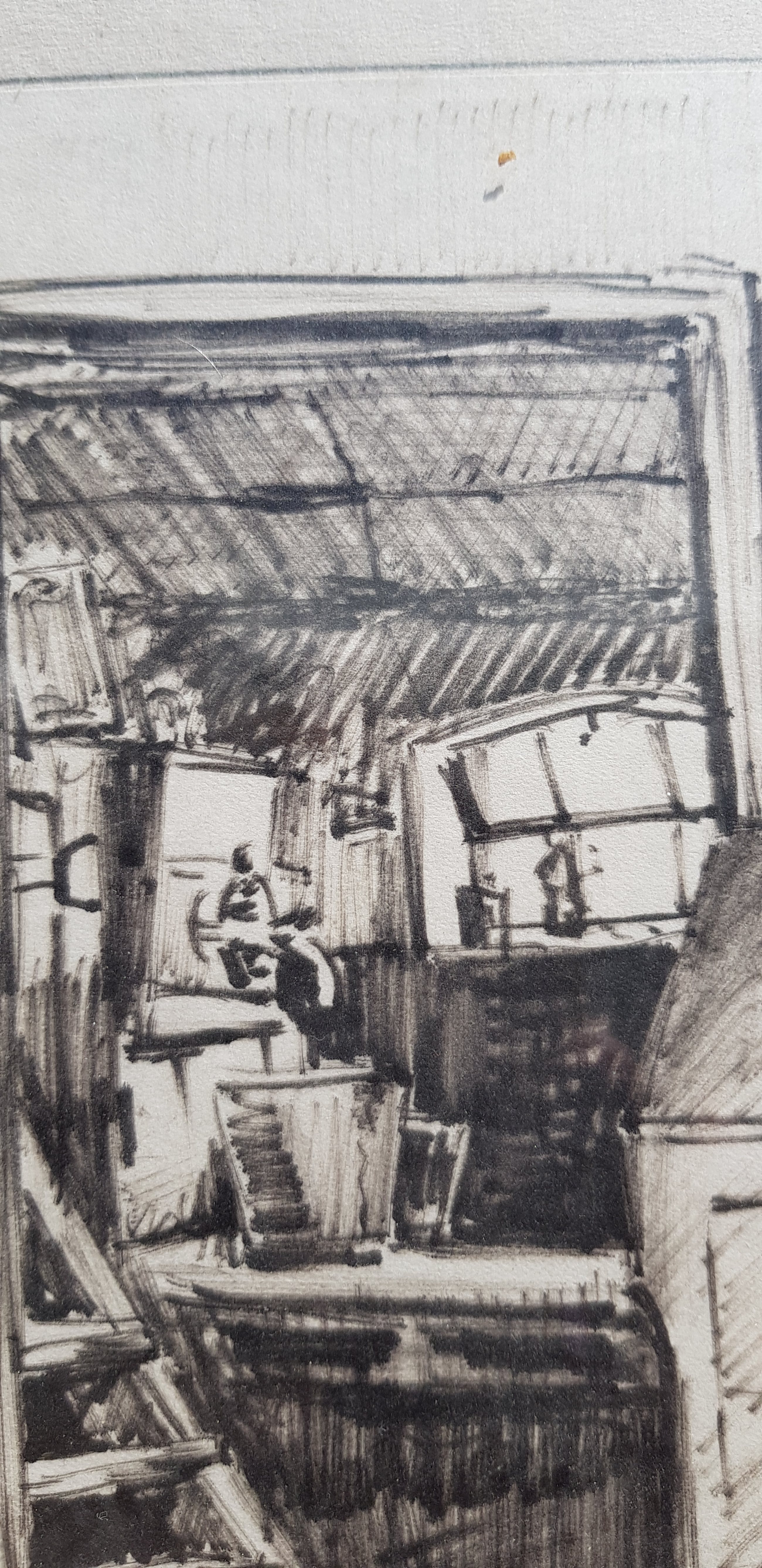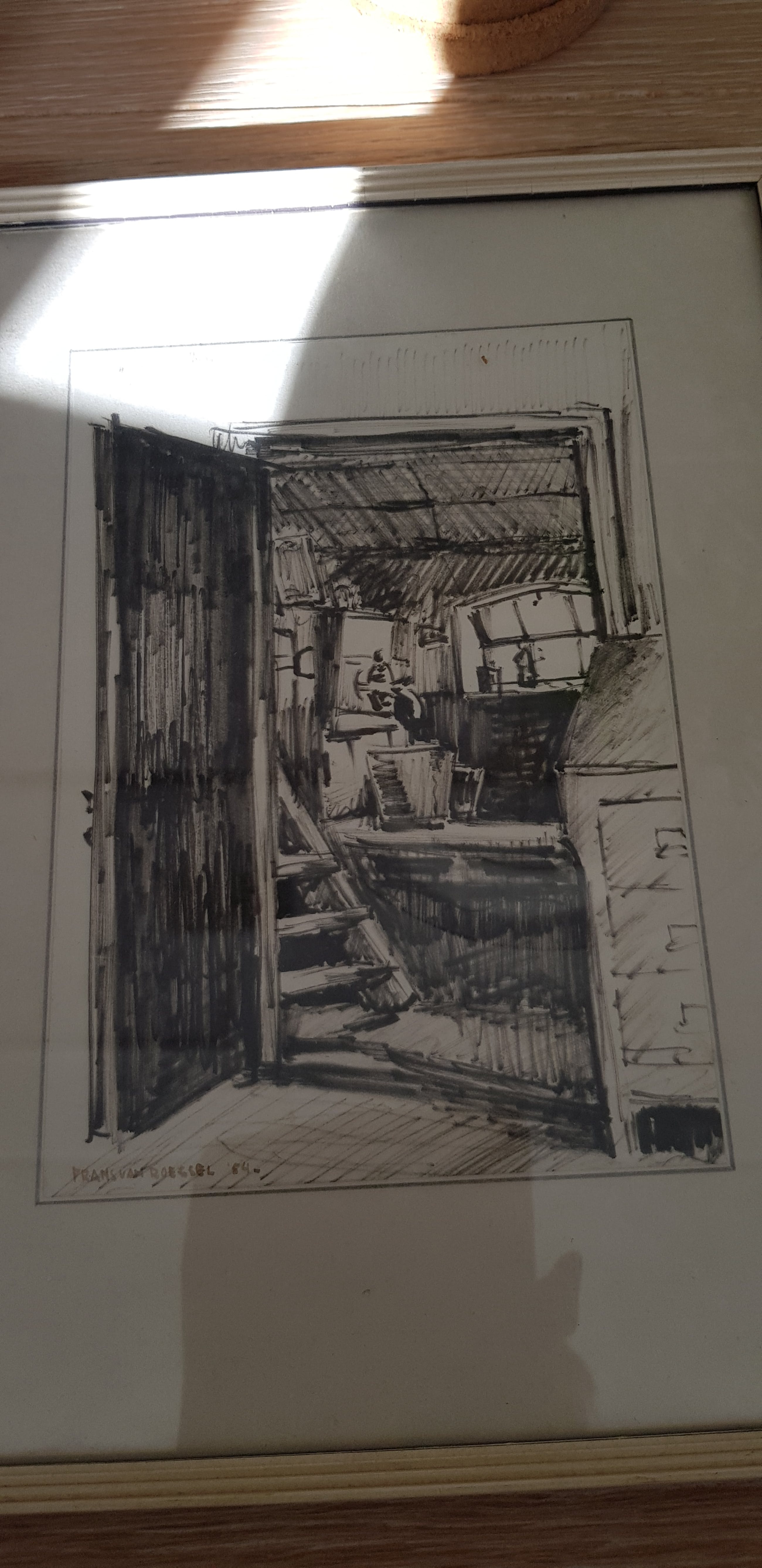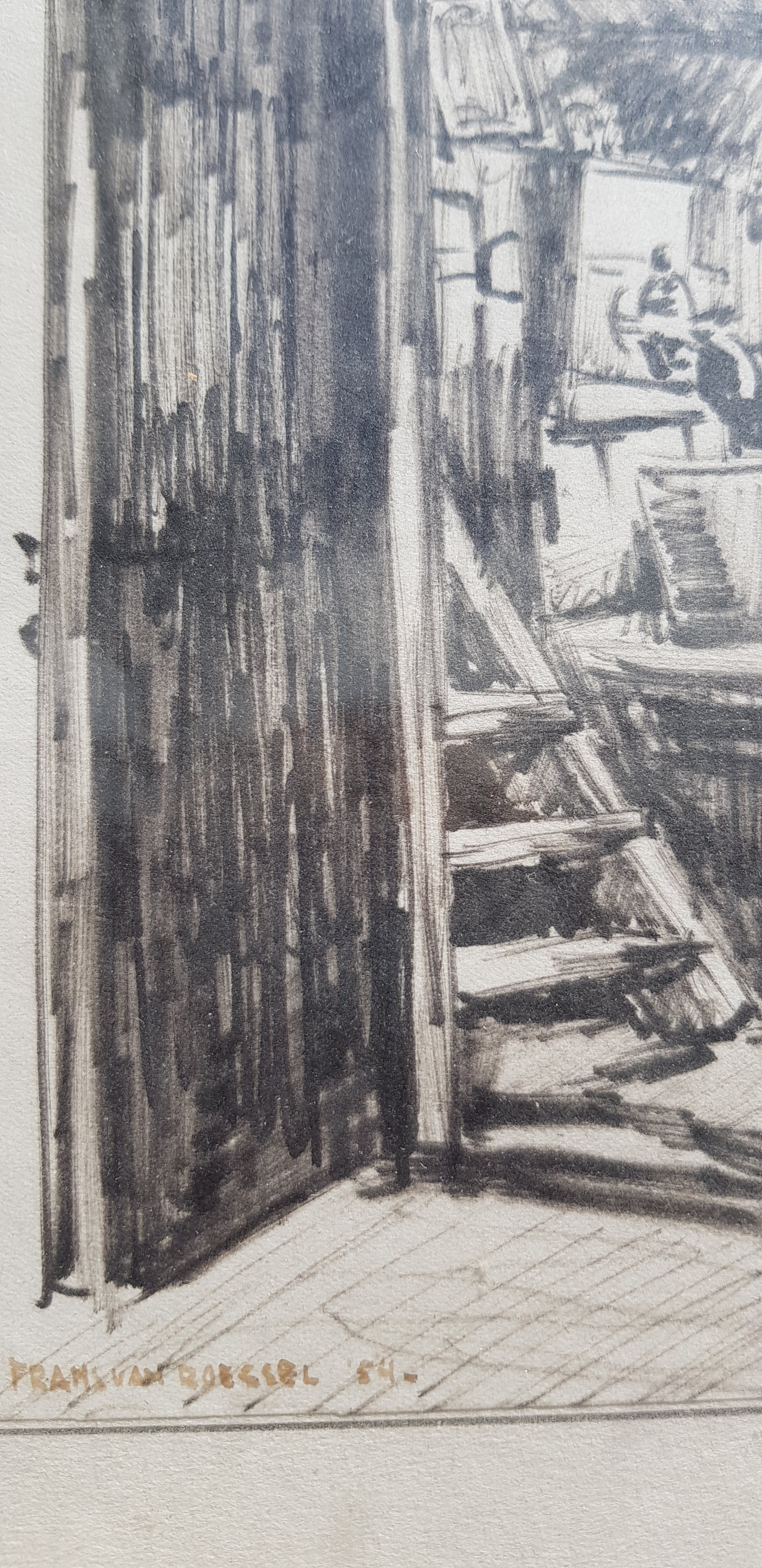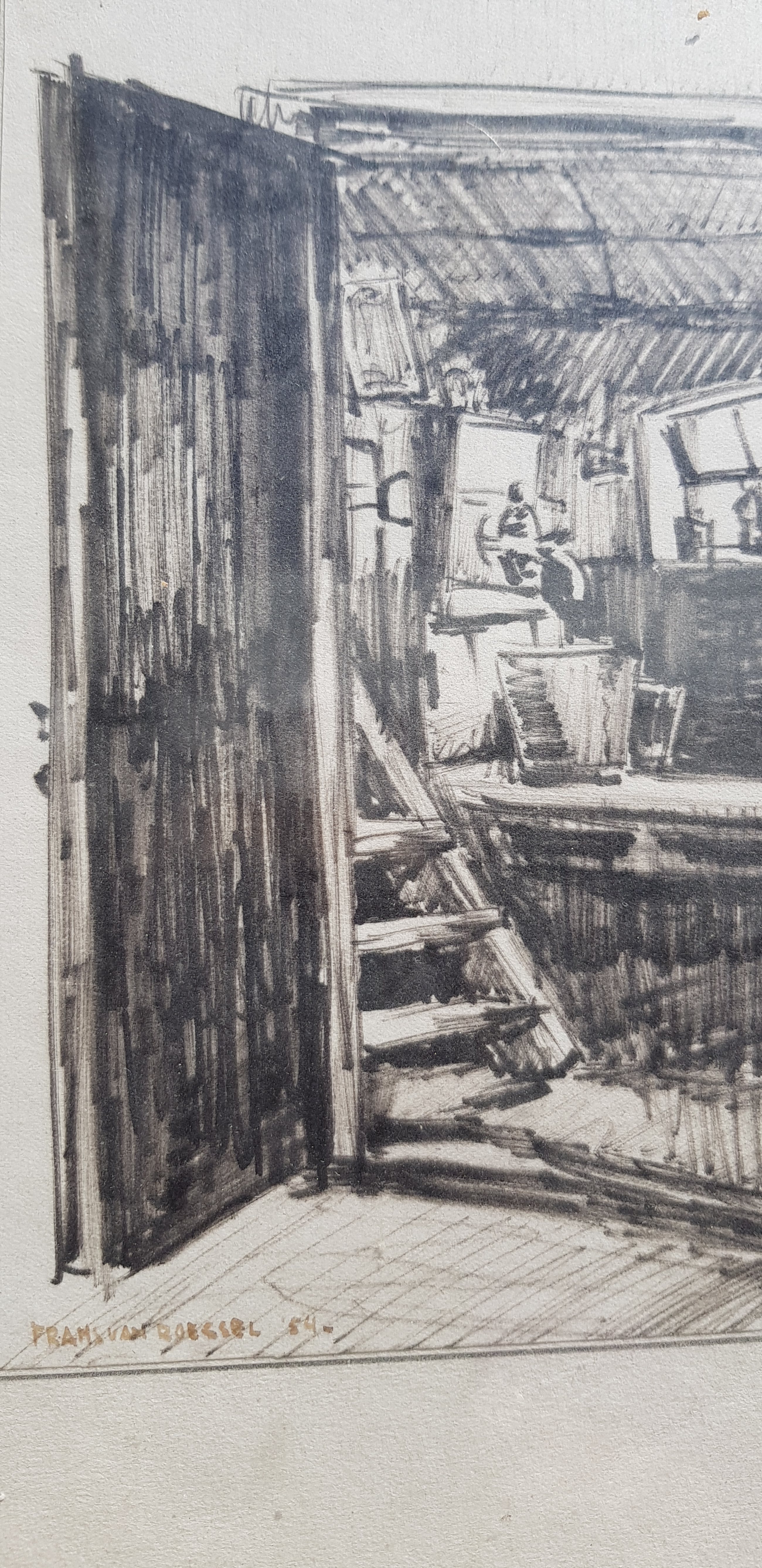 Getekend geschetst door frans van roessel een schilder aquarelist en onderwijzer Hij maakte portretten oa van toenmalig koningin Beatrix, landschappen en stillevens In 2017 is er een overzichtstentoonstelling geweest van zijn werk Dit nostalgisch optrekje doet je wegdromen in de tijd van toen en maakt je nieuwsgierig naar wat niet zichtbaar is .