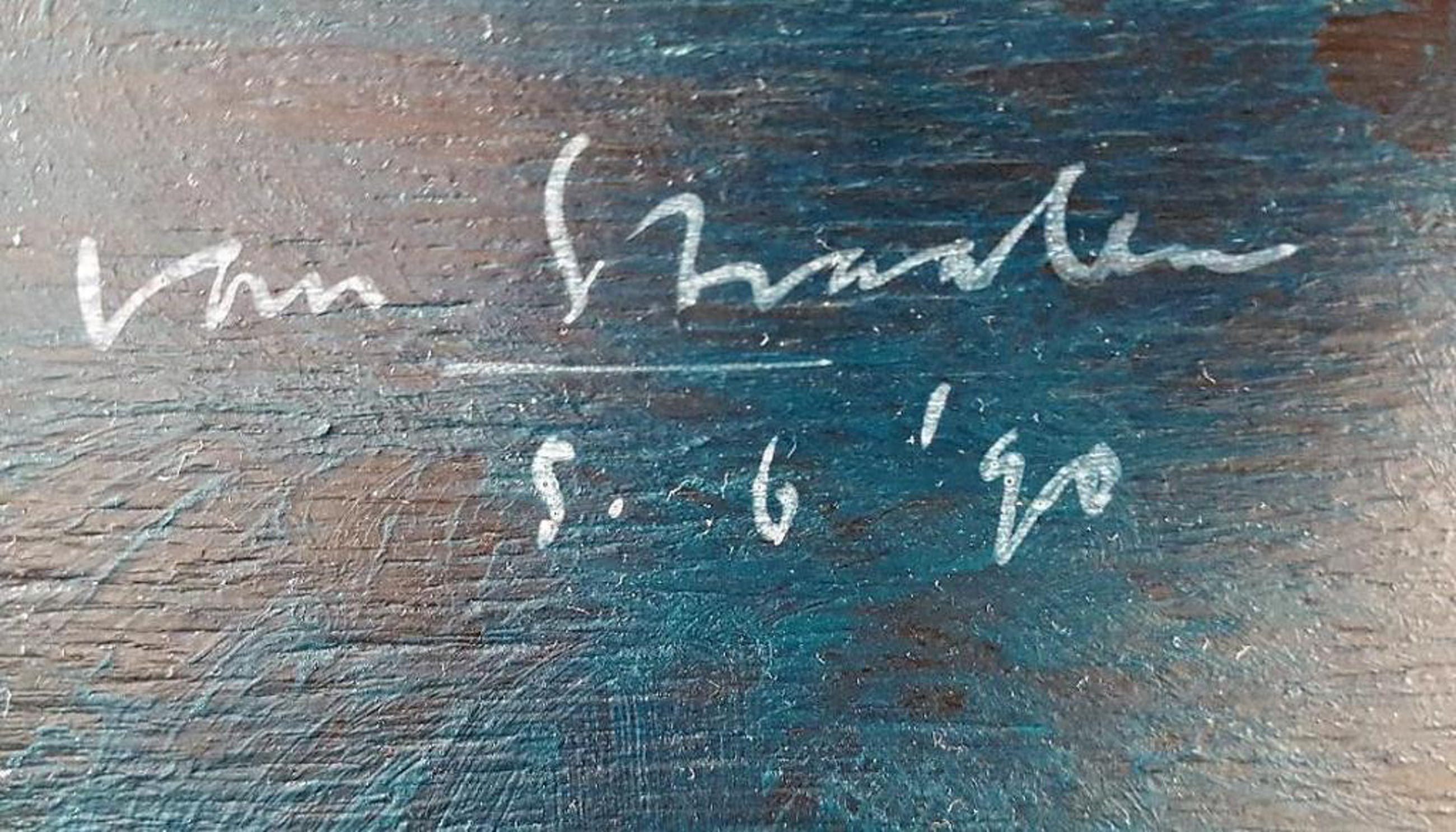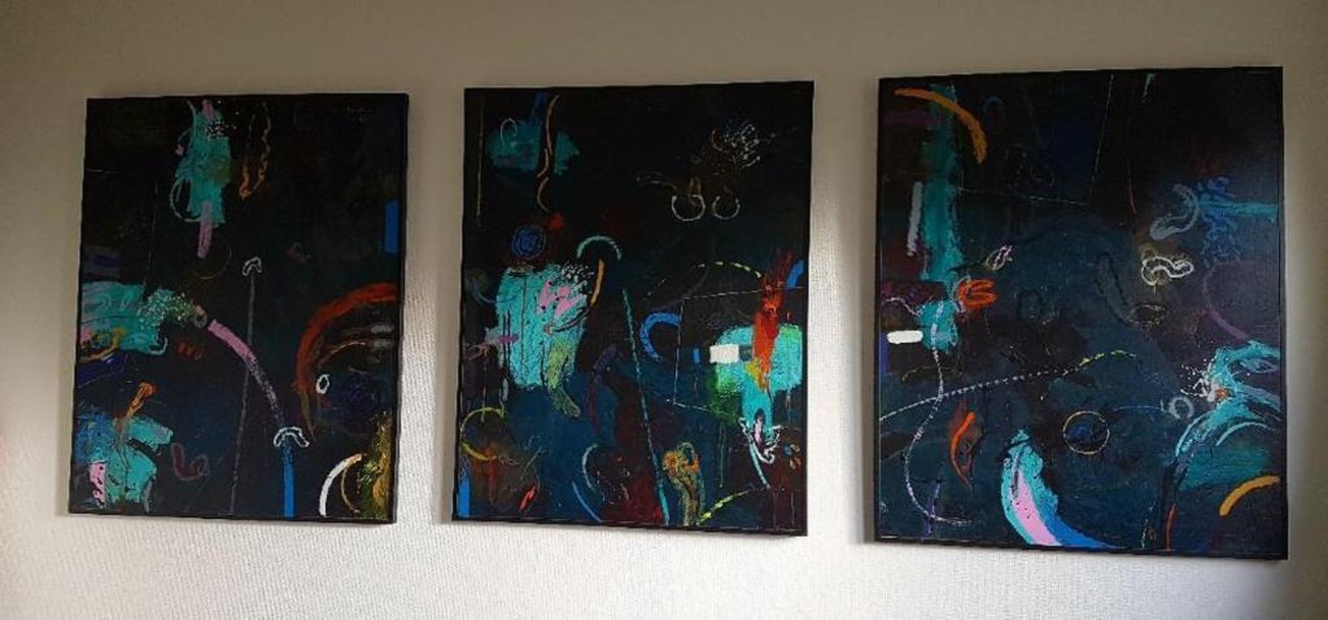 3 Inspirerende doeken van Frans van Straalen (XXe eeuw). Afm. B80xh100cm. Geschilderd in 1990 en aan zijn toenmalige assistente cadeau gegeven toen zij met pensioen ging. In zeer goede conditie. Doeken zijn ingelijst.