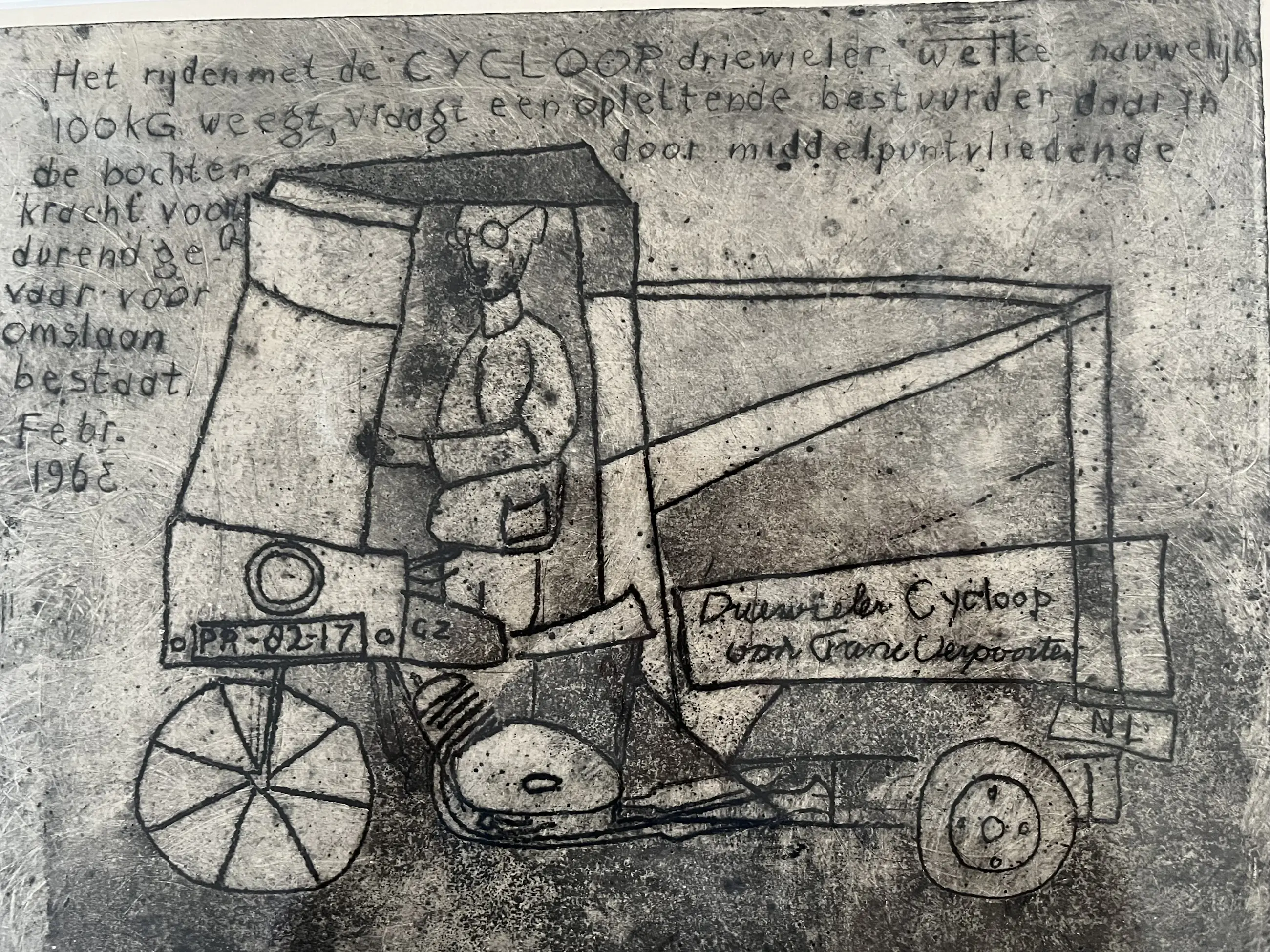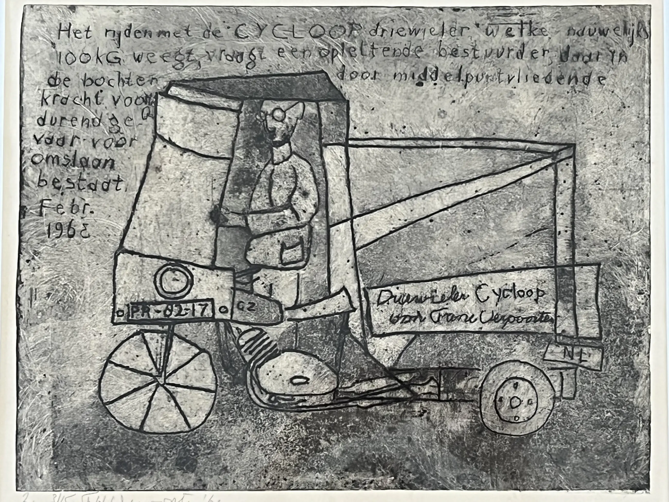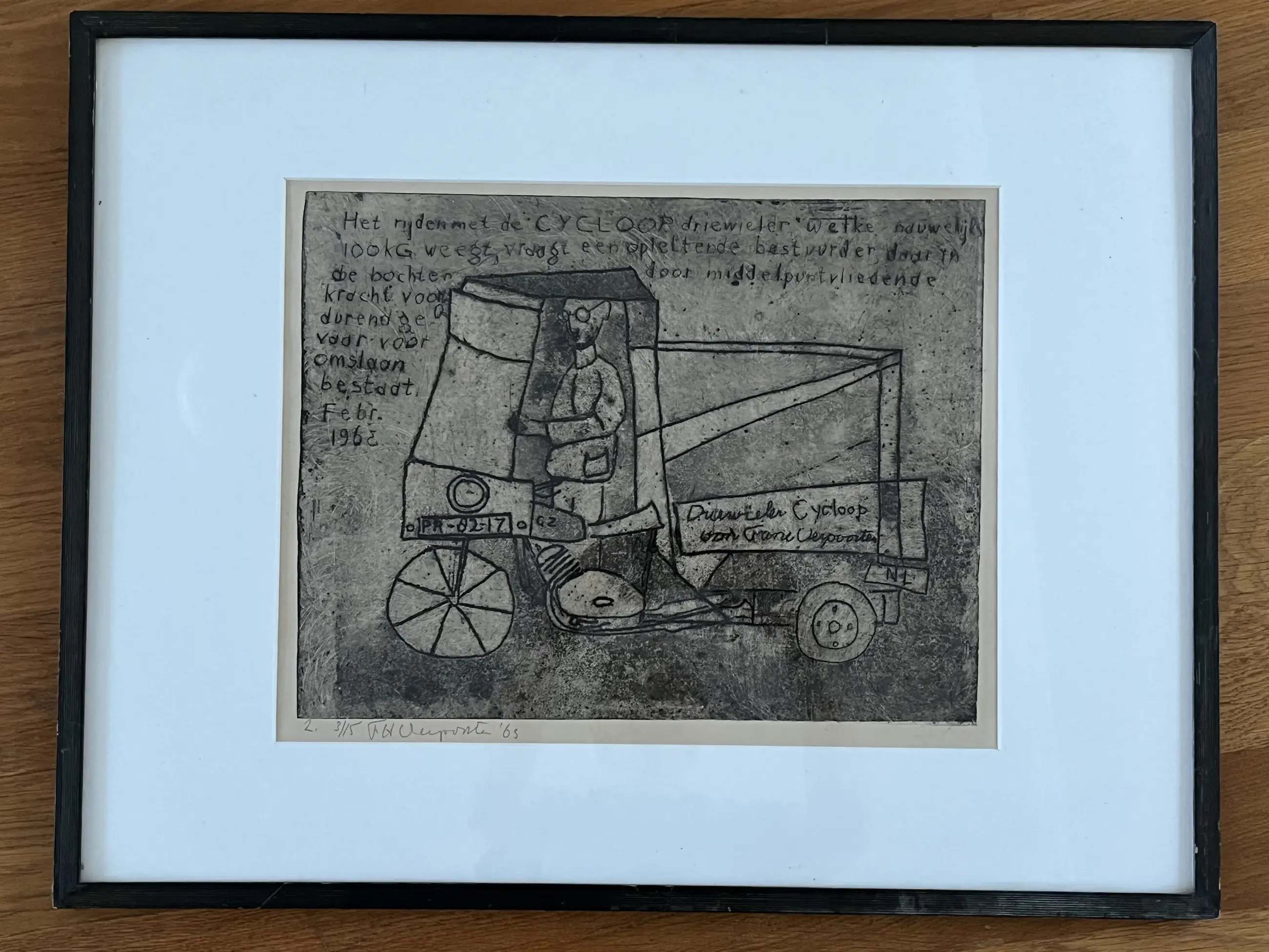 Leuke ets uit 1963 met een even zo leuke tekst over het rijden met dat voertuig. (Elandtest?) Ets is gelijst in een donkere houten lijst met zichtbare gebruikssporen. Er zit geen ophangsysteem aan de lijst. Blad is verkleurd. Oplage 3/15. Passe partout heeft veel kleine donkere puntjes (detailfoto) Afmeting ets 31 x 39 cm. Inclusief lijst 52 x 67 cm.