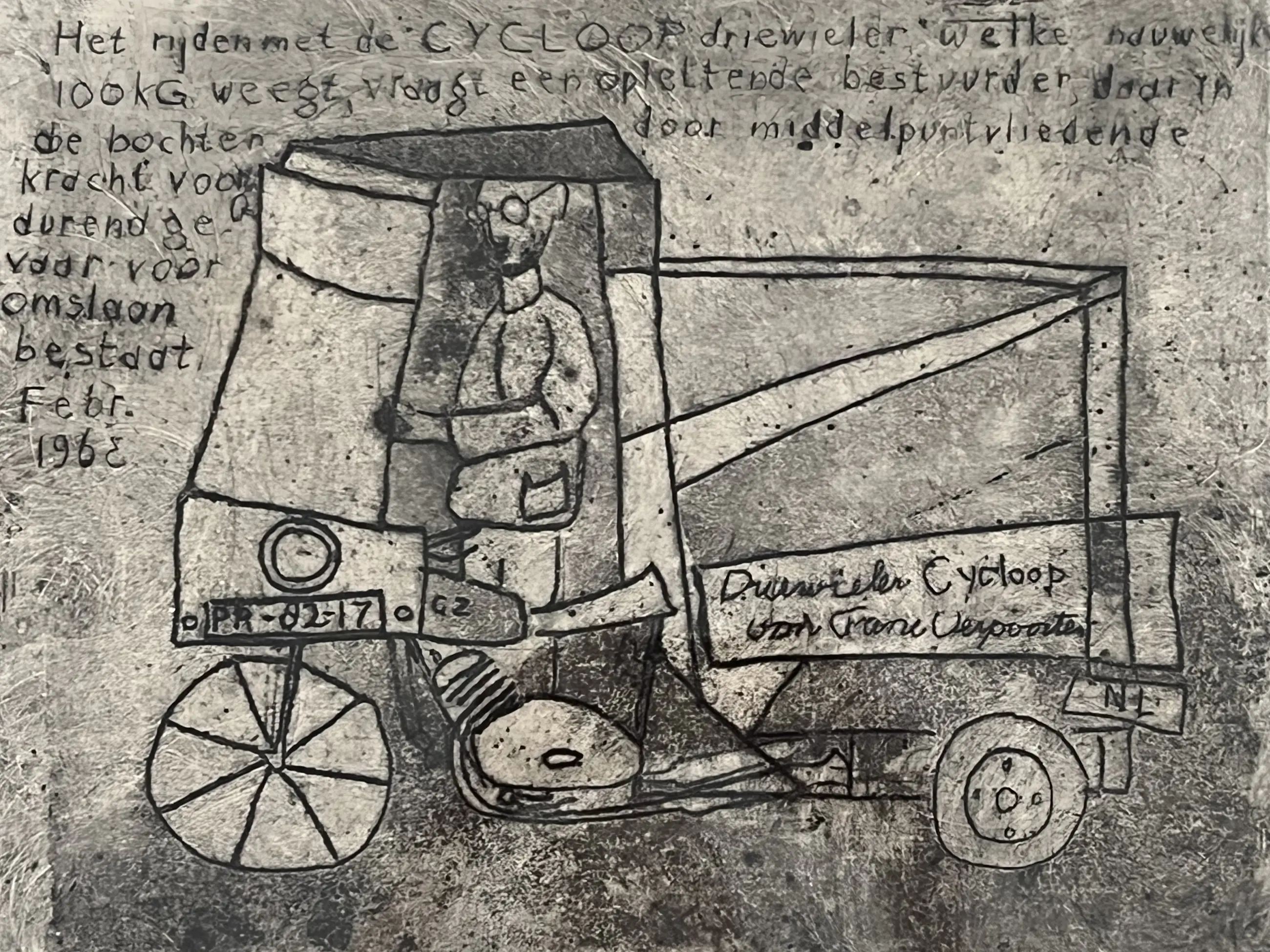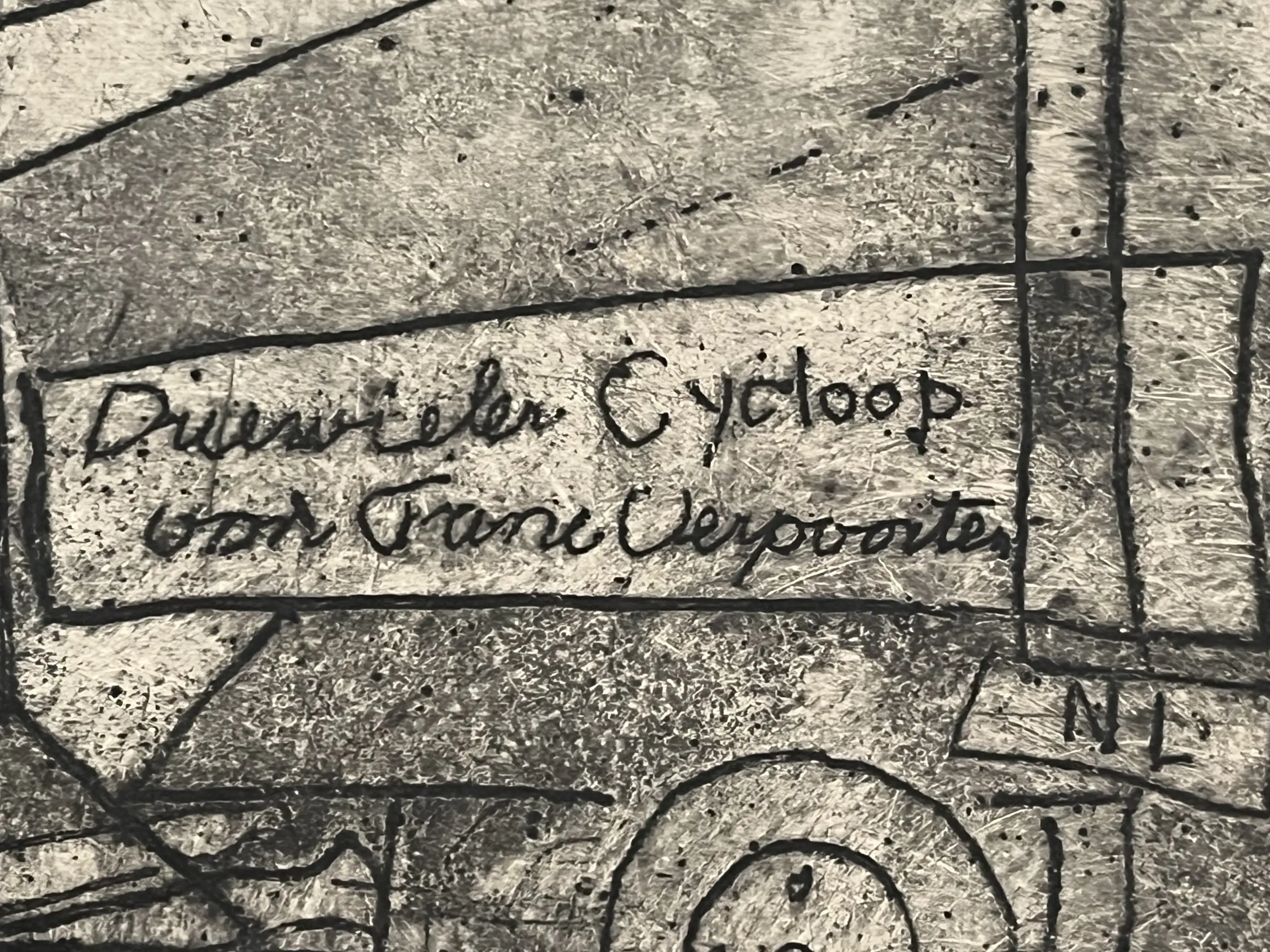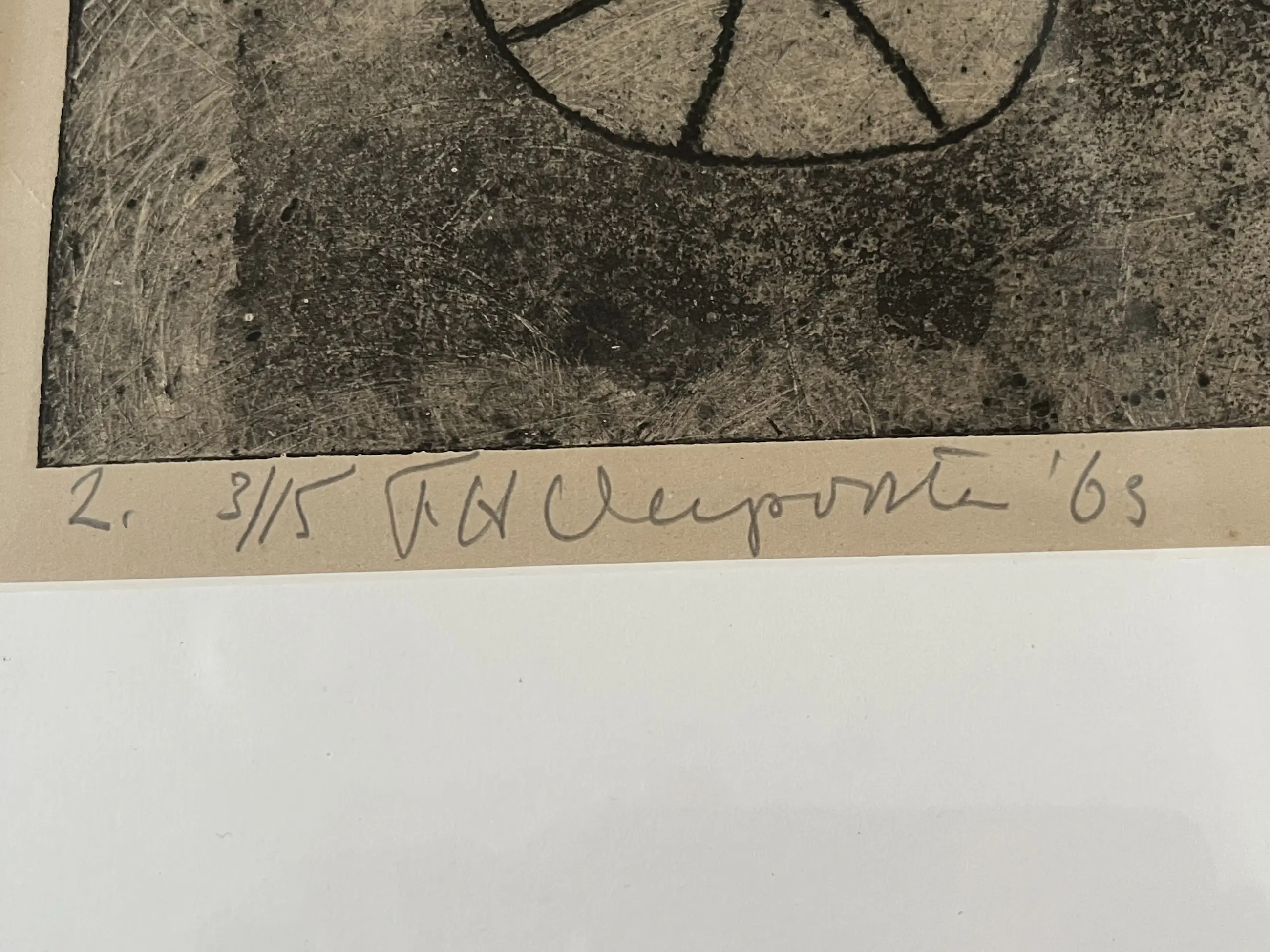 Leuke ets uit 1963 met een even zo leuke tekst over het rijden met dat voertuig. (Elandtest?) Ets is gelijst in een donkere houten lijst met zichtbare gebruikssporen. Er zit geen ophangsysteem aan de lijst. Blad is verkleurd. Oplage 3/15. Passe partout heeft veel kleine donkere puntjes (detailfoto) Afmeting ets 31 x 39 cm. Inclusief lijst 52 x 67 cm.