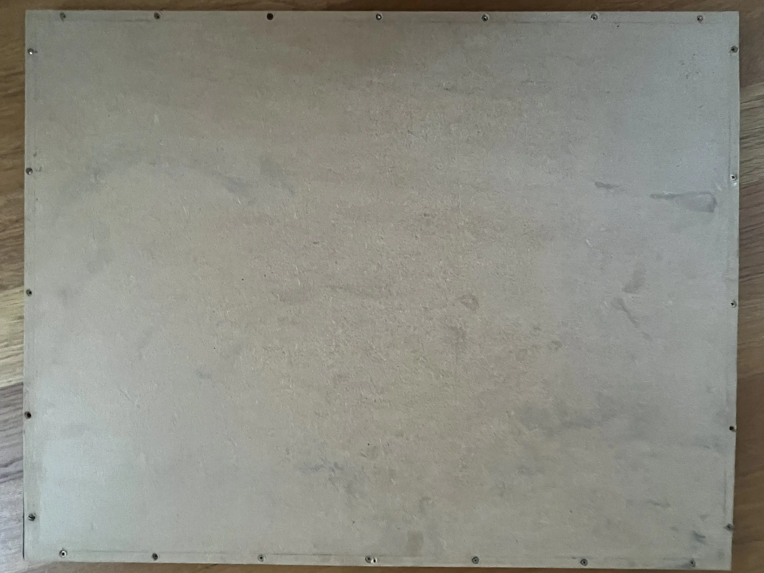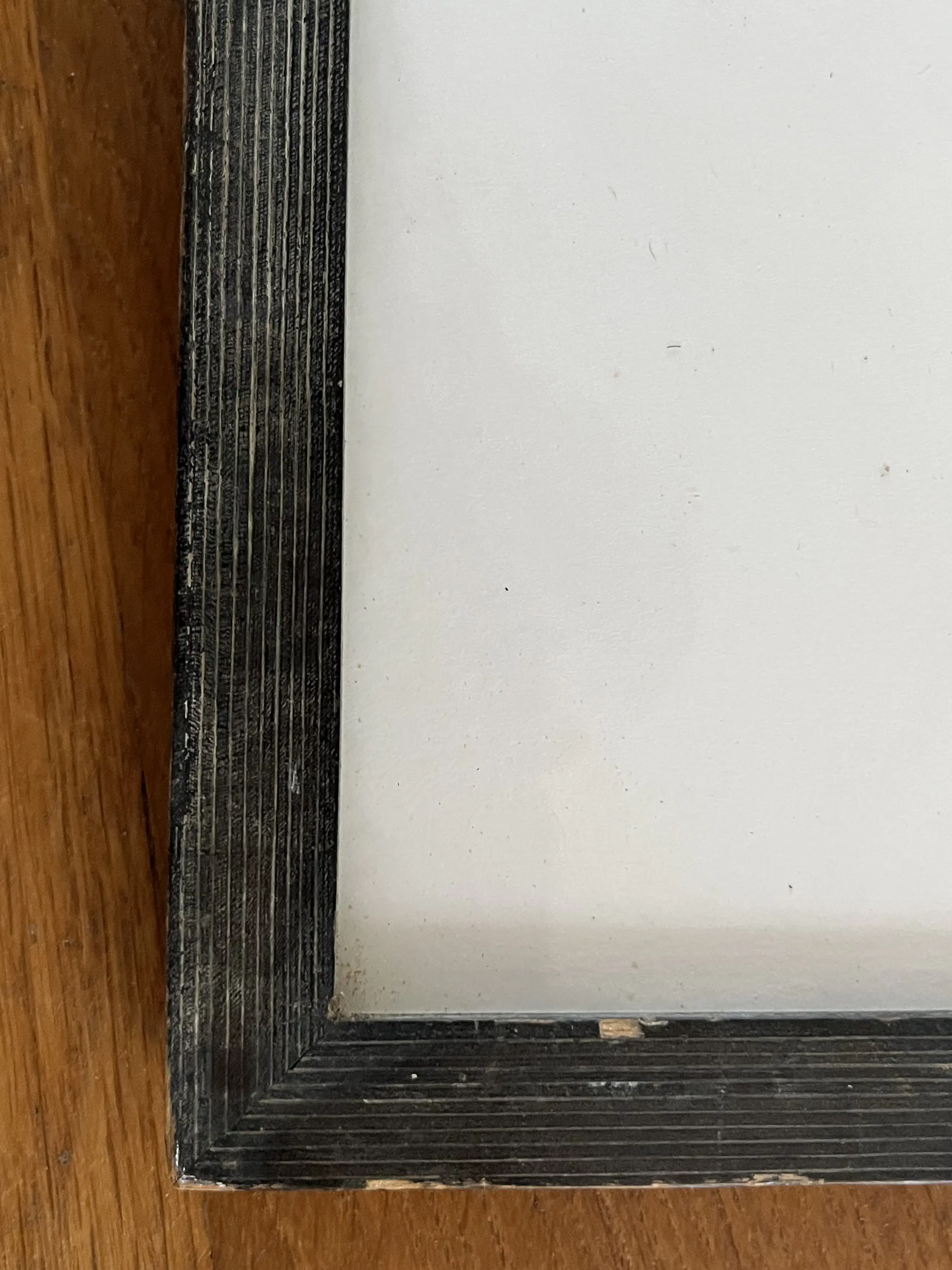 Blad is verkleurd, pp heeft donkere puntjes, lijst heeft zichtbare gebruikssporen, geen ophangsysteem