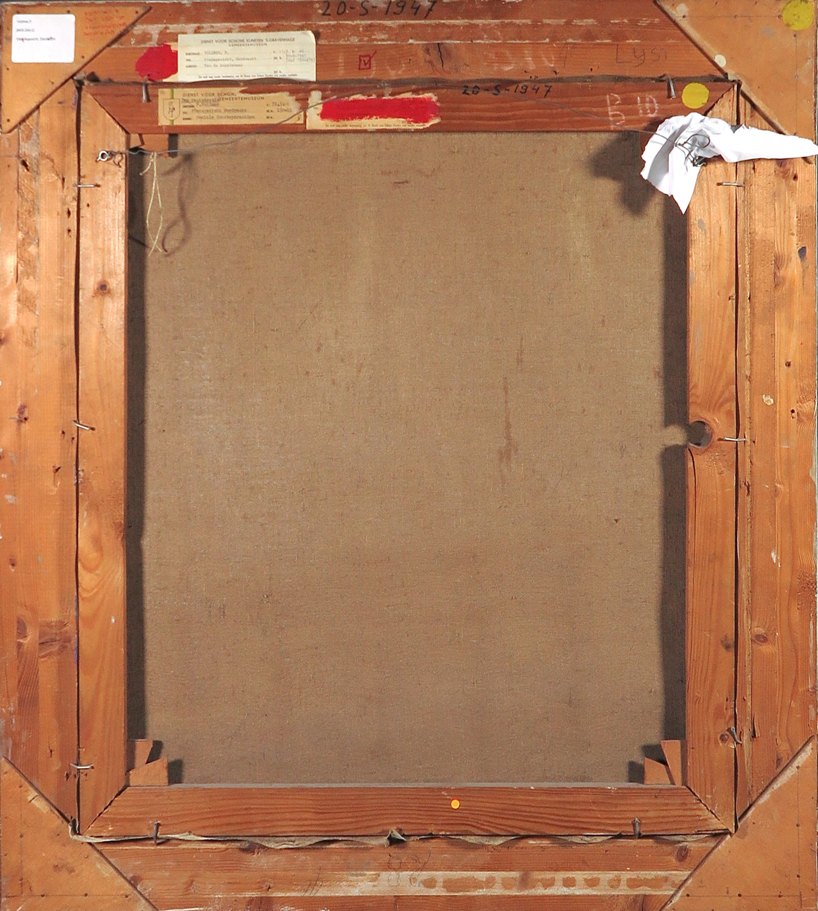 Lichte bobbeling in het doek omdat deze niet helemaal strak gespannen is. Paar kleine plekjes met verfverlies/qraquele langs de randen van het doek. Gezien de leeftijd in erg goede conditie. | |