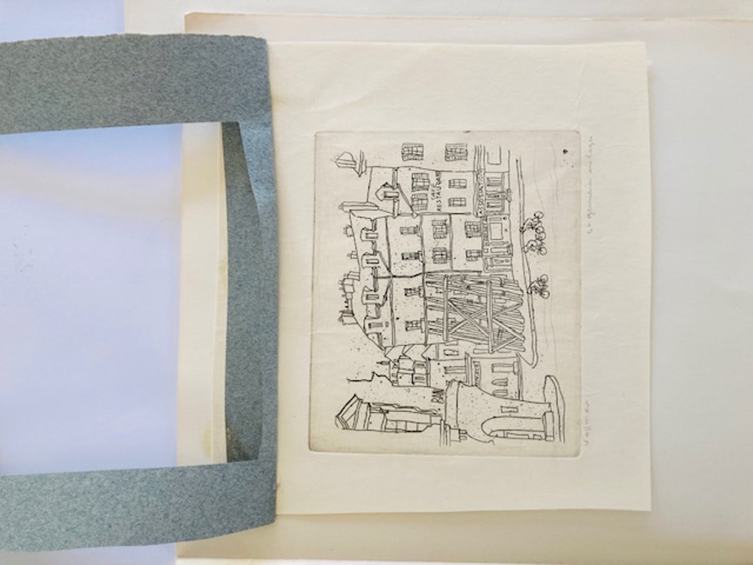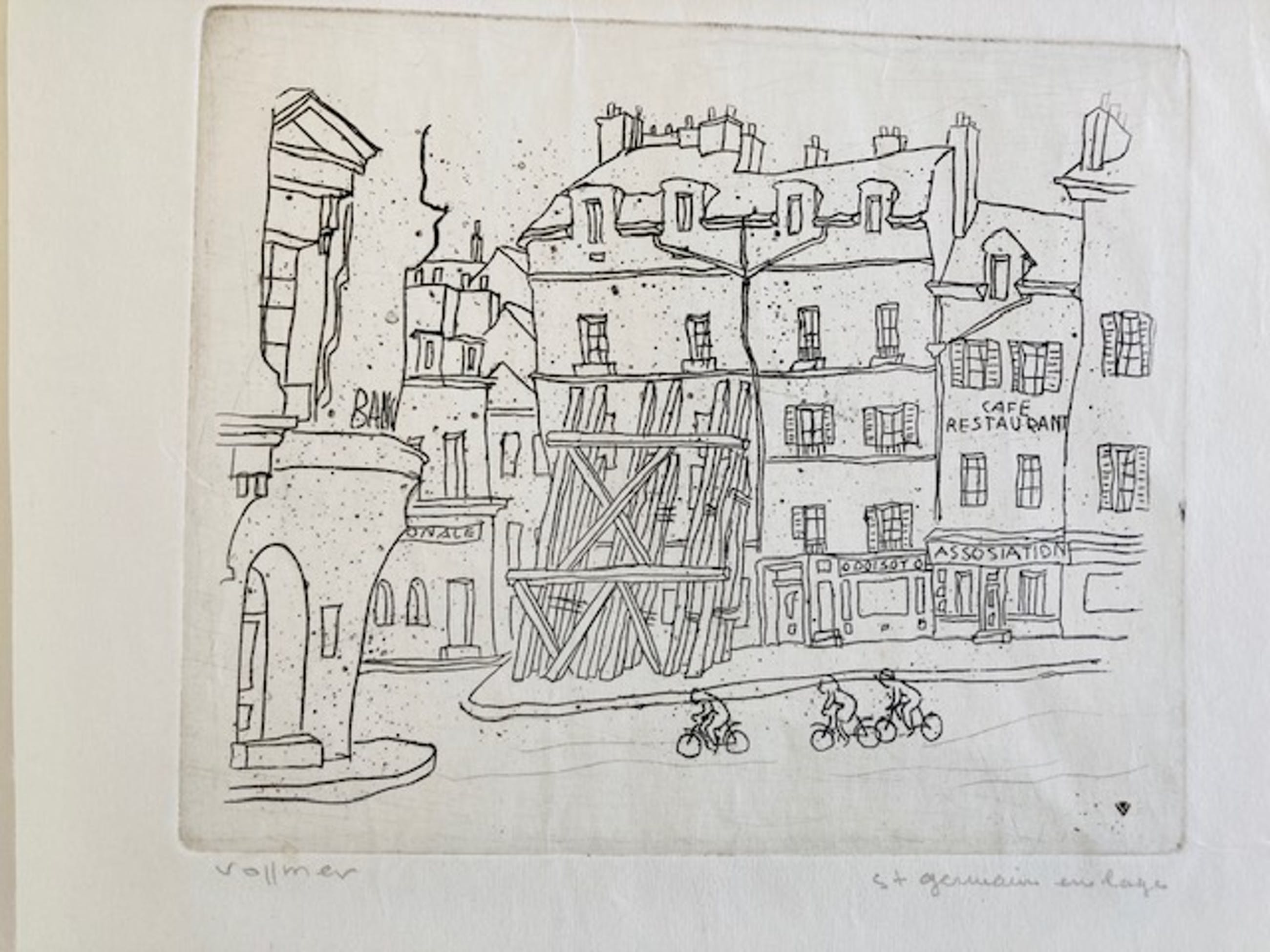 Fraaie ets van Frans Vollmer. het werkje zit in een soort van kader, in de uiterste hoeken van de witranden vastgeplakt.