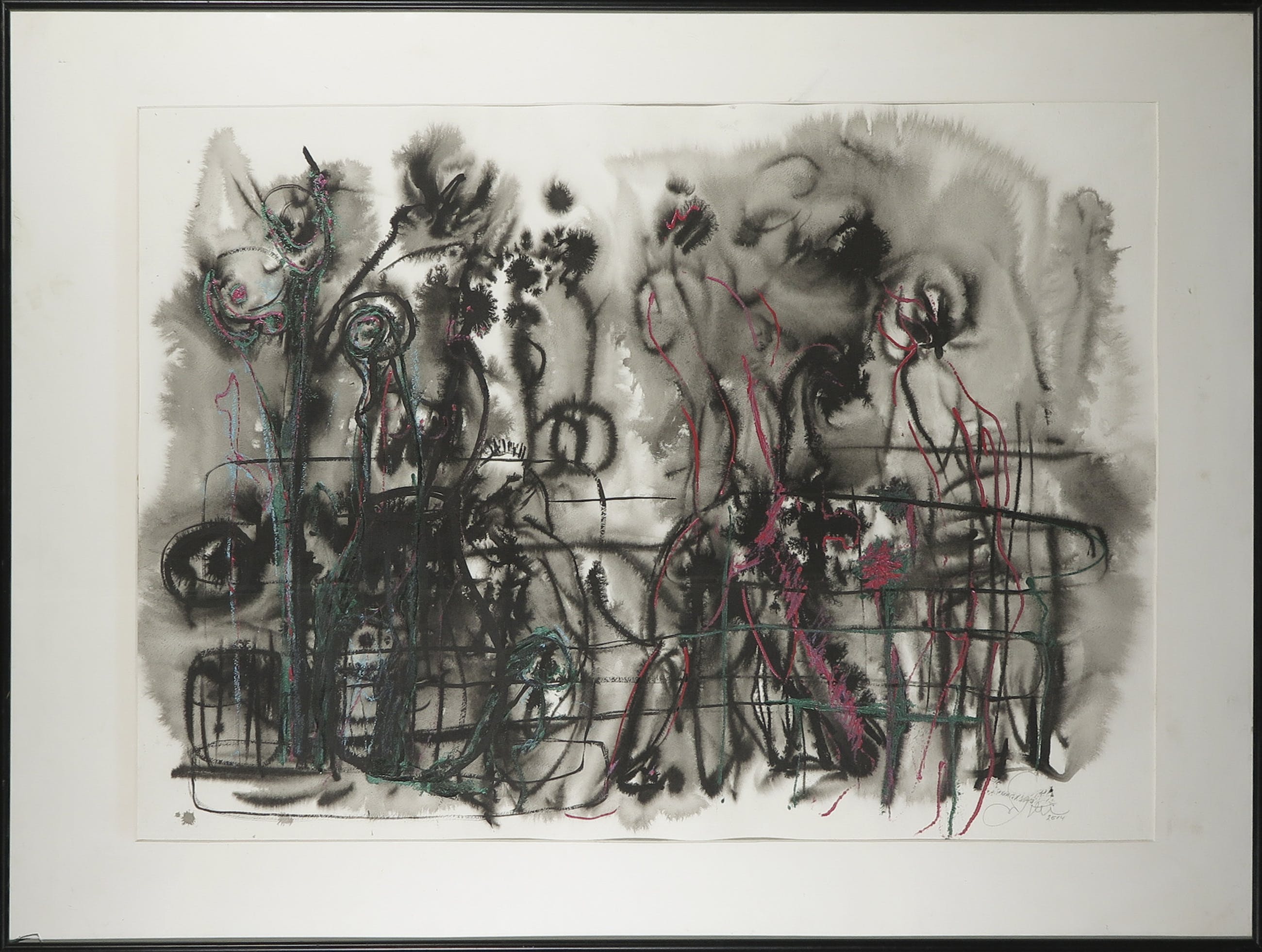 | De glasplaat heeft een breuk links boven in. Het passe-partout is verkleurd. Het werk zelf is over het algemeen in goede staat, maar bevat veel golvingen in het blad. | |