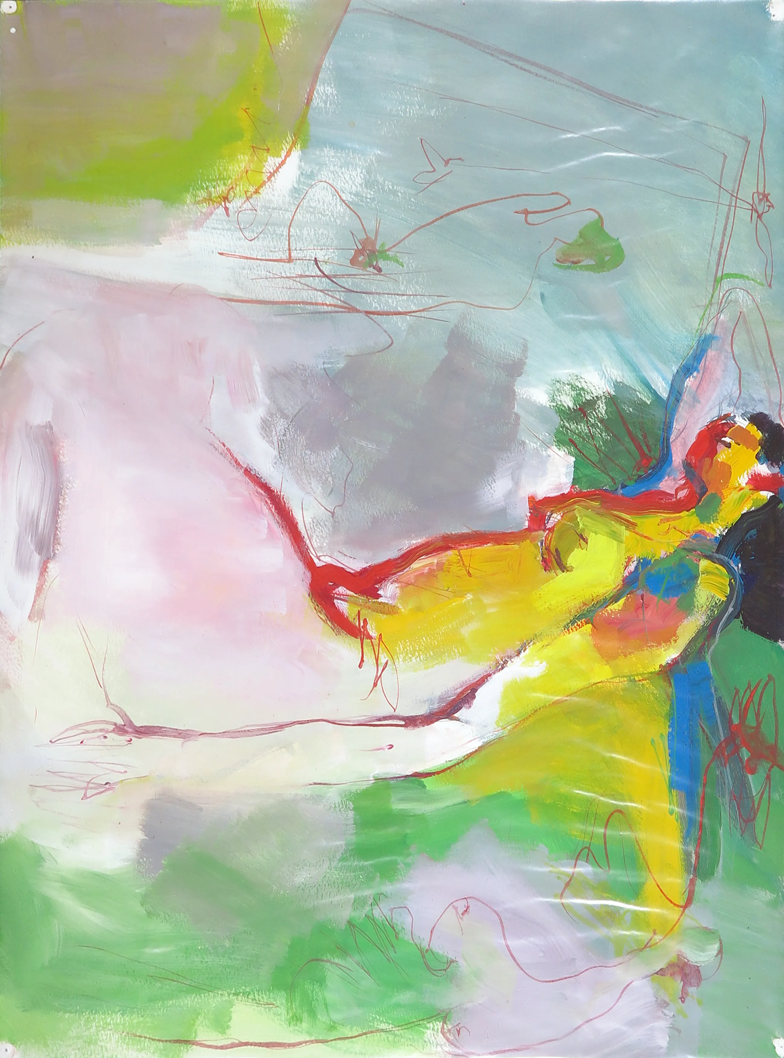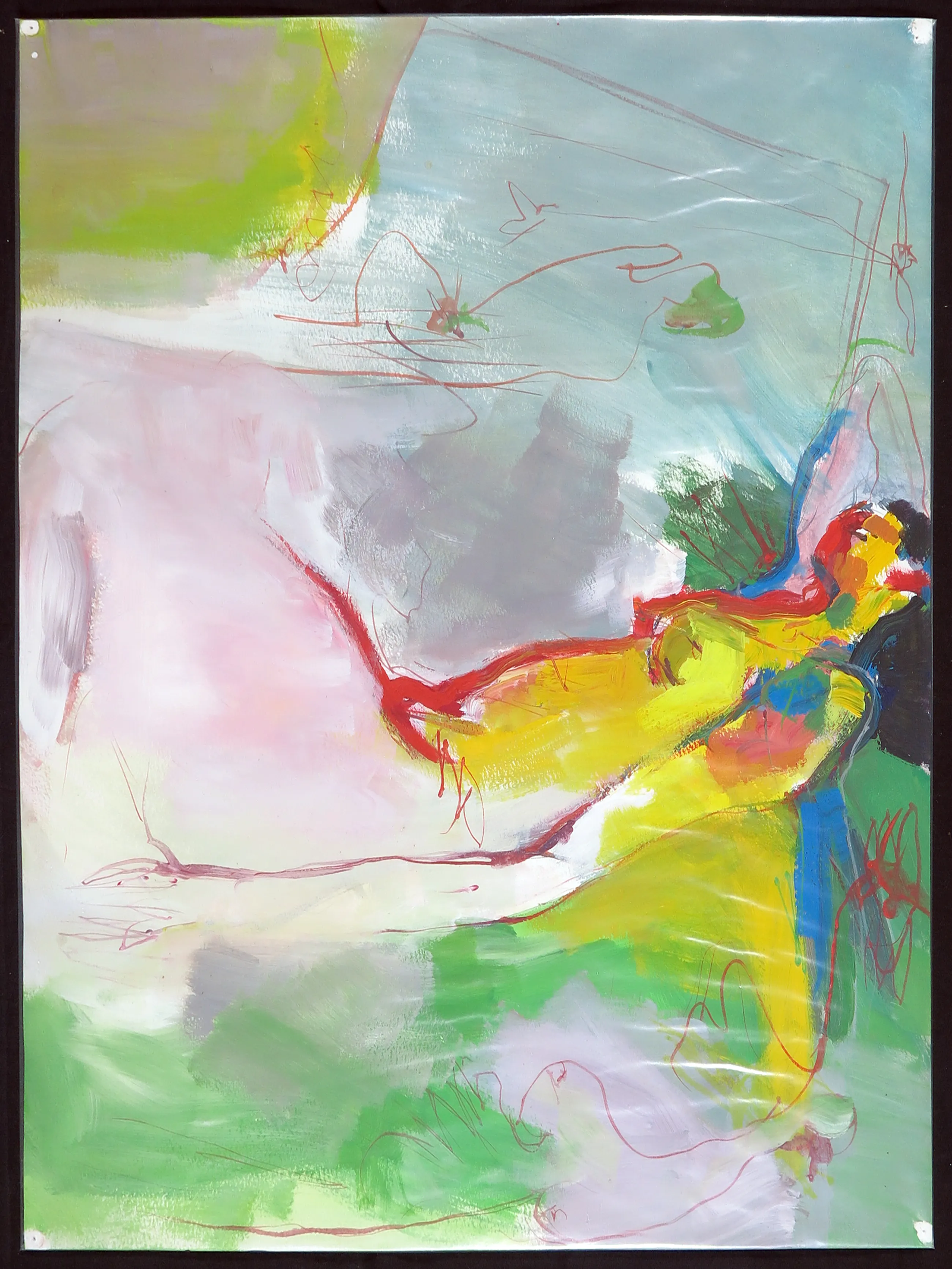 Mooie tekening van kleurrijk liggend naakt. Werk is in plastic verpakt, mogelijk schittering zichtbaar op de foto.