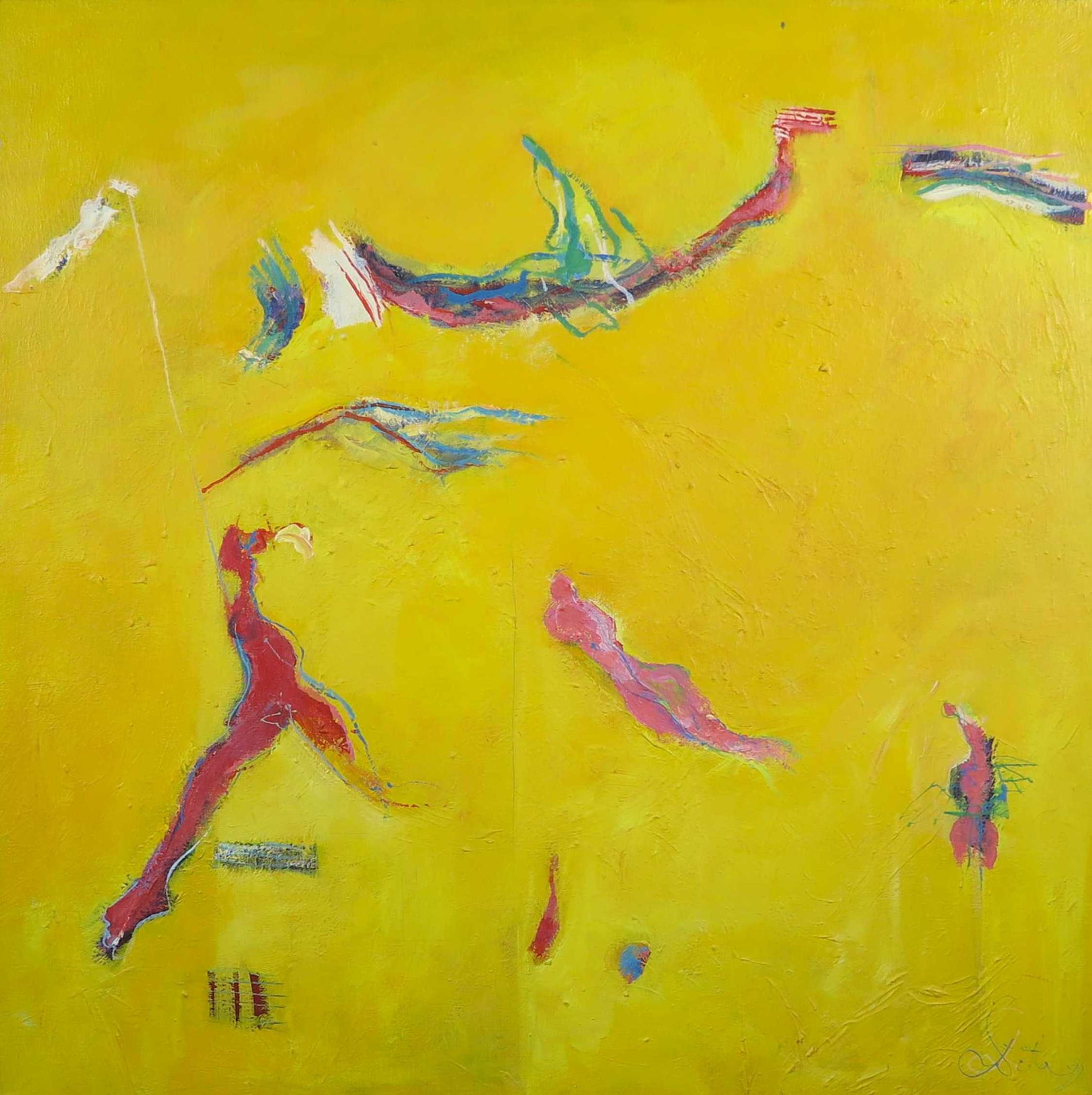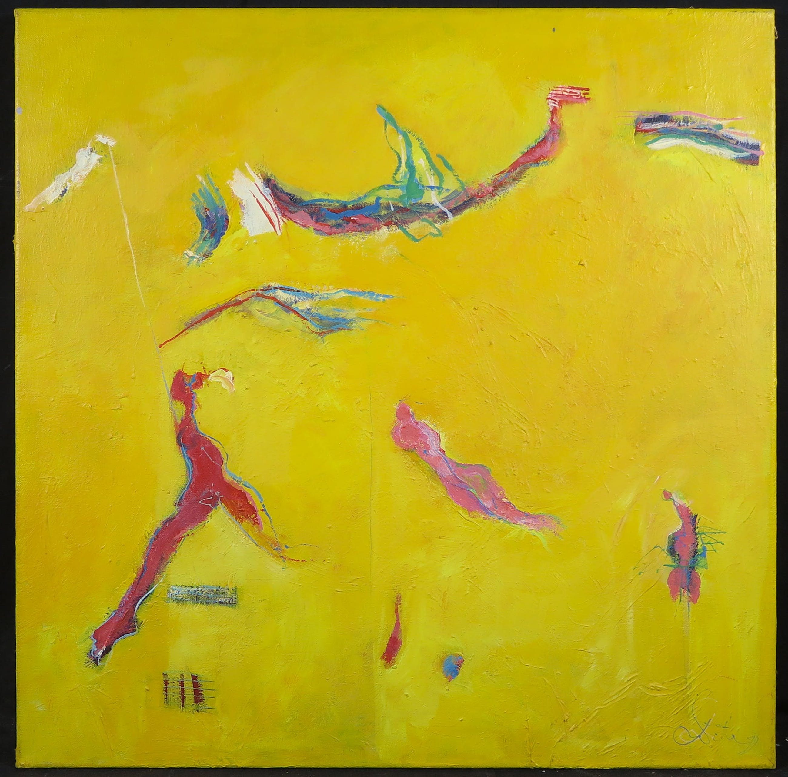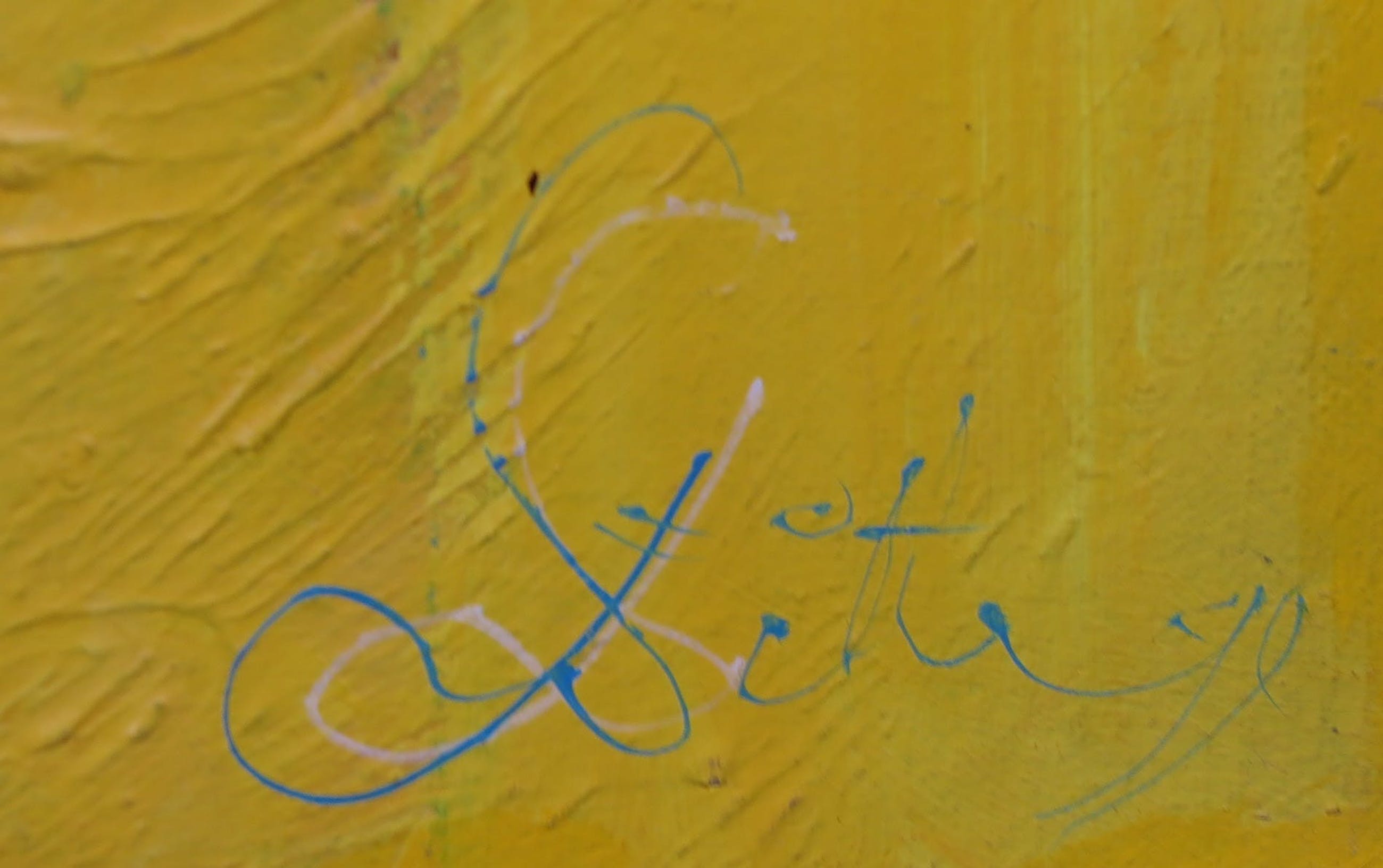 | Het werk heeft hier en daar wat lichte beschadigingen op het doek en kleine vlekjes. | |