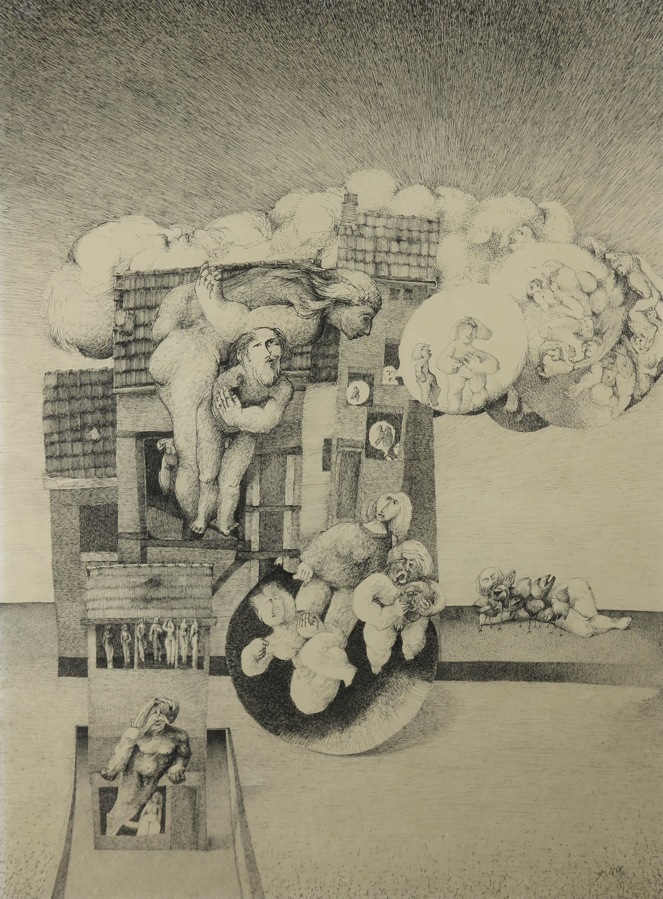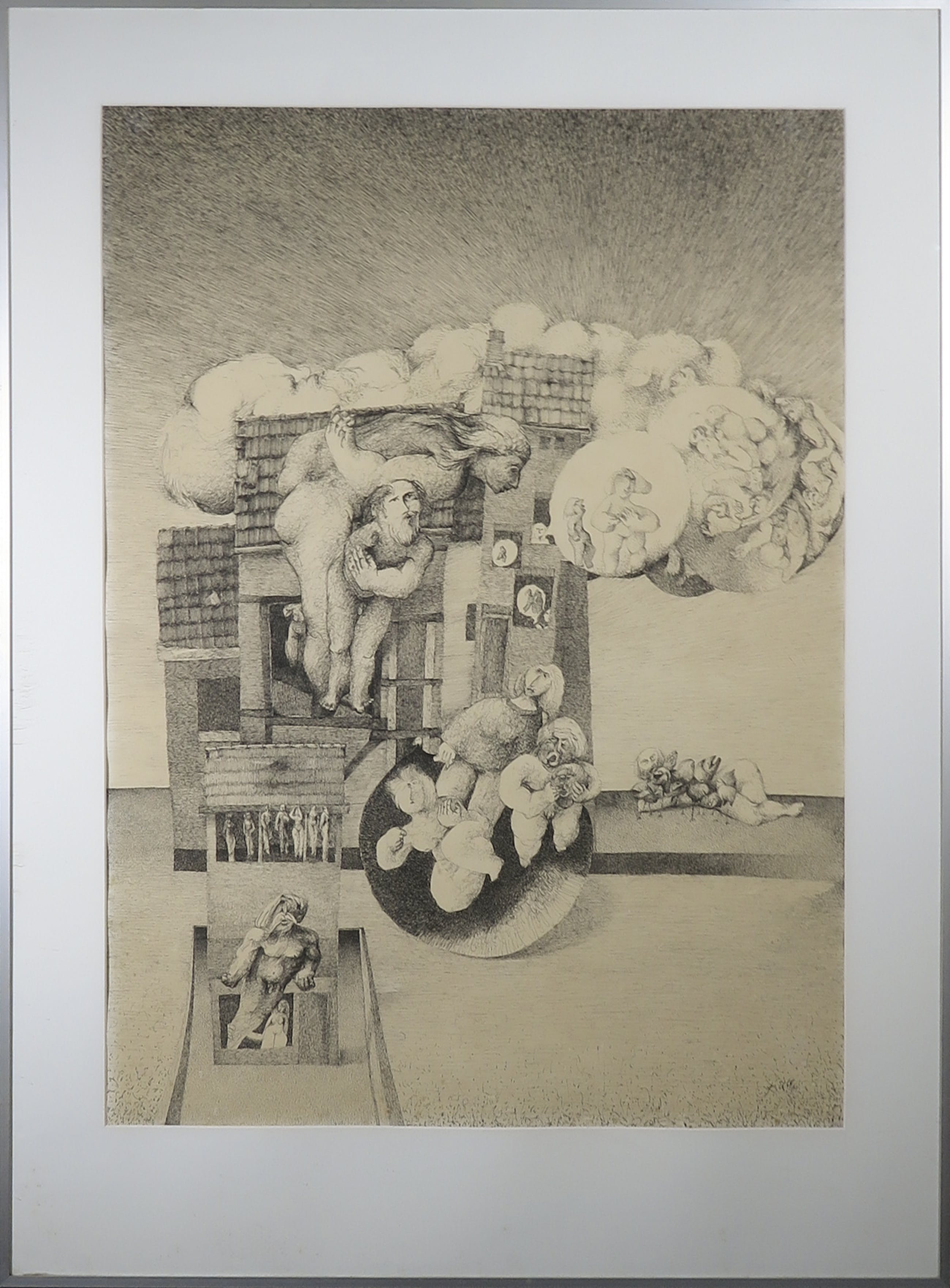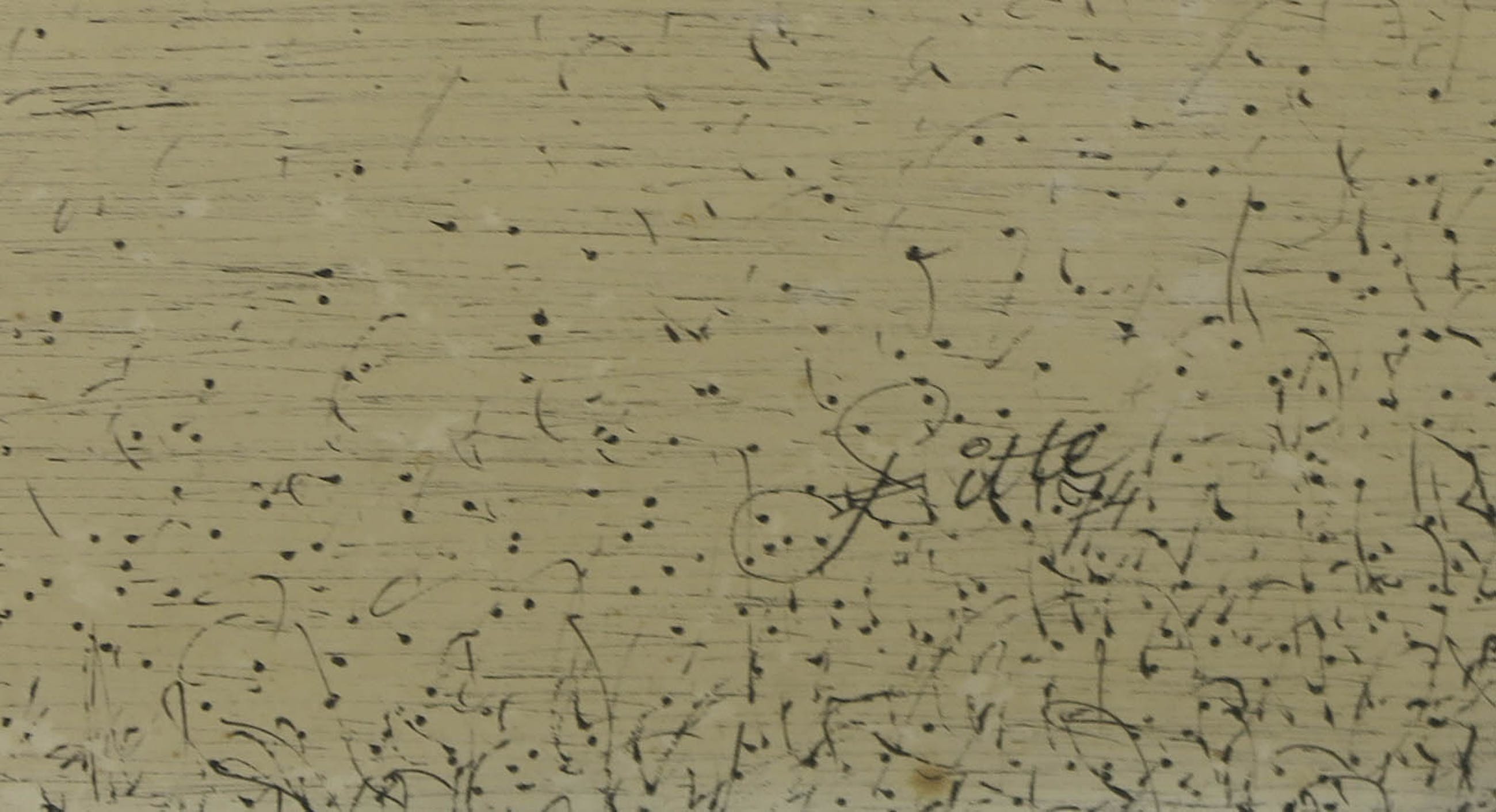 | Het werk zelf is in goede staat, is wat verkleurd en heeft een kleine golving aan de zijkanten van ht blad. Het passe-partout is aan vervanging toe en heeft een flinke golving. | |