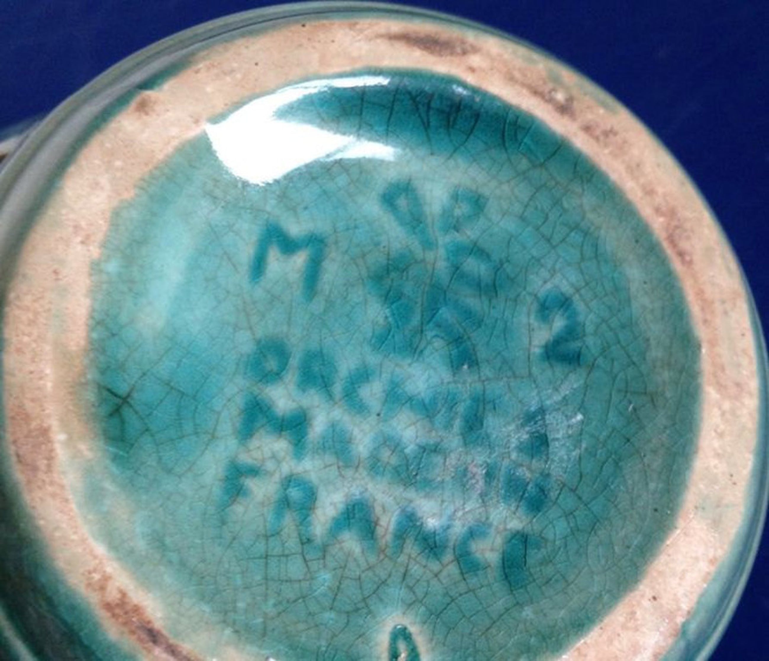 De turquoise karaf is prima gemerkt met het vanaf 1923 gevoerde windmolentje van Moulin des Loups & Hamage ( na fusering van de Orchies en Hamage ateliers )